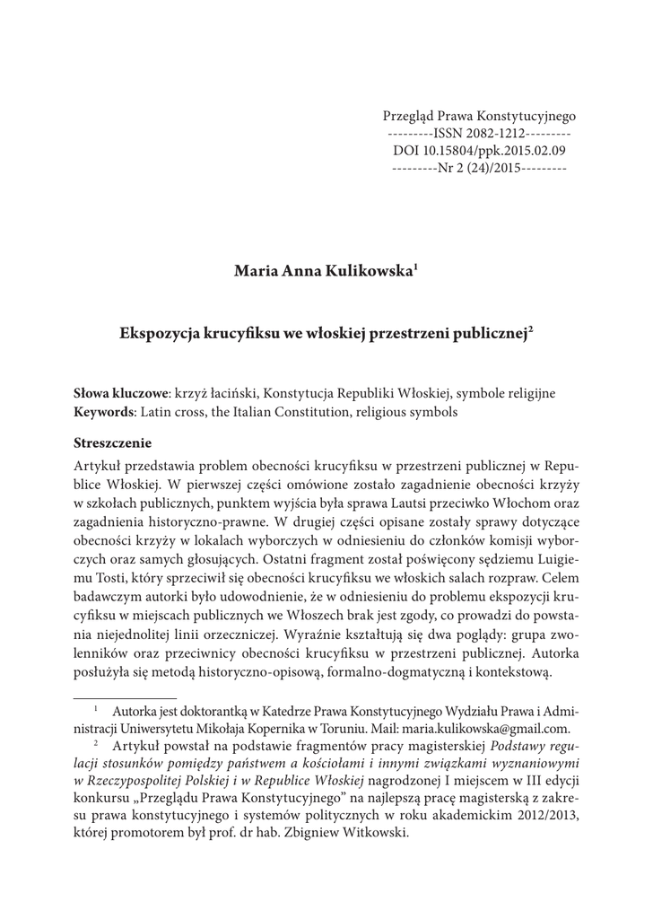 Przegląd Prawa Konstytucyjnego ---------ISSN 2082-1212--------DOI 10.15804/ppk.2015.02.09 ---------Nr 2 (24)/2015--------- Maria Anna Kulikowska1 Ekspozycja krucyfiksu we włoskiej przestrzeni publicznej2 Słowa kluczowe: krzyż łaciński, Konstytucja Republiki Włoskiej, symbole religijne Keywords: Latin cross, the Italian Constitution, religious symbols Streszczenie Artykuł przedstawia problem obecności krucyfiksu w przestrzeni publicznej w Republice Włoskiej. W pierwszej części omówione zostało zagadnienie obecności krzyży w szkołach publicznych, punktem wyjścia była sprawa Lautsi przeciwko Włochom oraz zagadnienia historyczno-prawne. W drugiej części opisane zostały sprawy dotyczące obecności krzyży w lokalach wyborczych w odniesieniu do członków komisji wyborczych oraz samych głosujących. Ostatni fragment został poświęcony sędziemu Luigiemu Tosti, który sprzeciwił się obecności krucyfiksu we włoskich salach rozpraw. Celem badawczym autorki było udowodnienie, że w odniesieniu do problemu ekspozycji krucyfiksu w miejscach publicznych we Włoszech brak jest zgody, co prowadzi do powstania niejednolitej linii orzeczniczej. Wyraźnie kształtują się dwa poglądy: grupa zwolenników oraz przeciwnicy obecności krucyfiksu w przestrzeni publicznej. Autorka posłużyła się metodą historyczno-opisową, formalno-dogmatyczną i kontekstową. Autorka jest doktorantką w Katedrze Prawa Konstytucyjnego Wydziału Prawa i Administracji Uniwersytetu Mikołaja Kopernika w Toruniu. Mail: [email protected]. 2 Artykuł powstał na podstawie fragmentów pracy magisterskiej Podstawy regulacji stosunków pomiędzy państwem a kościołami i innymi związkami wyznaniowymi w Rzeczypospolitej Polskiej i w Republice Włoskiej nagrodzonej I miejscem w III edycji konkursu „Przeglądu Prawa Konstytucyjnego” na najlepszą pracę magisterską z zakresu prawa konstytucyjnego i systemów politycznych w roku akademickim 2012/2013, której promotorem był prof. dr hab. Zbigniew Witkowski. 1 180 PRZEGLĄD PRAWA KONSTYTUCYJNEGO 2015/2 Summary The exhibition of the crucifix in Italian public space This article describes the problem of the presence of the crucifix in the Italian public space. At the beginning the author discussed the issue of the presence of crucifixes in public schools. The starting points are historical – legal issues and the Lautsi v. Italy case brought before the European Court of Human Rights. Than the author presents the problems concerning the presence of crucifixes in polling stations in respect of election judges and the voters themselves. The last part is dedicated to Judge Luigi Tosti, who objected to the presence of crucifixes in Italian courtrooms. The aim of the research of the author was to prove that, with respect to the problem of exposure of the crucifix in public places in Italy, there is a disagreement, which leads to an uneven line of jurisprudence. There are formed two views: a group of supporters and opponents of the presence of the crucifix in public space. The author used the historical – descriptive, formal – dogmatic and contextual methods. * Zagadnienie obecności symboli religijnych w przestrzeni publicznej jest istotne, ponieważ eksponowanie ich w miejscach ogólnodostępnych może ingerować w wolność religijną obywateli oraz w ich wolność sumienia. Wybór Włoch jako punktu odniesienia jest uwarunkowany podobieństwami między tym krajem a Polską w kwestii relacji państwo–Kościoły i inne związki wyznaniowe. W państwie tym wspomniana relacja przybiera postać separacji przyjaznej, zachowany jest zatem rozdział państwa od kościoła przy jednoczesnej współpracy w realizacji wspólnych celów i dążeń3. Po G. Dammacco, Le relazioni tra lo Stato e Chiesa nella esperienza italiana, [w:] Podstawy regulacji stosunków Państwo–Kościół w Rzeczypospolitej Polskiej i Republice Włoskiej, red. P. Czarnek, D. Dudek, P. Stanisz, Lublin 2010, s. 41–57; F. Finocchiaro, Stato e Confessioni Religiose. Il Sistema Costituzionale, [w:] Enciclopedia Giuridica, Istituto della Enciclopedia Italiana Fondata da Giovanni Treccani, Roma 1993; M. L. Lo Giacco, Una valutazione del Concordato tra Italia e Santa Sedea 25 anni dalla sua modificazione, [w:] Podstawy regulacji stosunków..., s. 125–145; P. Stanisz, Porozumienia w sprawie regulacji stosunków między państwem i niekatolickimi związkami wyznaniowymi we włoskim porządku prawnym, Lublin 2007. 3 Maria Anna Kulikowska • Ekspozycja krucyfiksu we włoskiej przestrzeni... 181 dobnie do Polski, jest to kraj o tradycjach katolickich, który ma analogiczny problem związany z obecnością krzyża w miejscach publicznych. W ciągu ostatnich kilkudziesięciu lat włoskie sądy i trybunały wydały kilka istotnych orzeczeń w sprawie eksponowania krucyfiksu w przestrzeni publicznej. Najgłośniejszą była sprawa ze skargi Soile Lautsi przeciwko Republice Włoskiej, która wywarła ogromny wpływ na późniejsze orzecznictwo wielu państw europejskich. Główną zasługą ETPC w tej sprawie była analiza negatywnej wolności religijnej i przekonań sekularystycznych, marginesu uznania państw, kwestii obecności symboli religijnych w środowisku szkolnym i ewentualnej indoktrynacji młodzieży. Wyroki w sprawie Lautsi stały się przedmiotem dyskusji społecznej, politycznej i uniwersyteckiej4. Najwięcej kontrowersji wzbudziło pierwsze orzeczenie Trybunału, które sprawiło, że kilka państw europejskich postanowiło przyłączyć się do postępowania po stronie Włoch. Ostatecznie przed siedmioosobową Izbą postępowanie zakończyło się sukcesem skarżącej5, natomiast przed Wielką Izbą sukces odniosła Republika Włoska6. Wielka Izba ETPC zwróciła uwagę na brak konsensusu w Europie w sprawie obecności symboli religijnych w publicznych placówkach oświatowych. Większość państw europejskich nie posiada szczególnych regulacji prawnych odnoszących się d