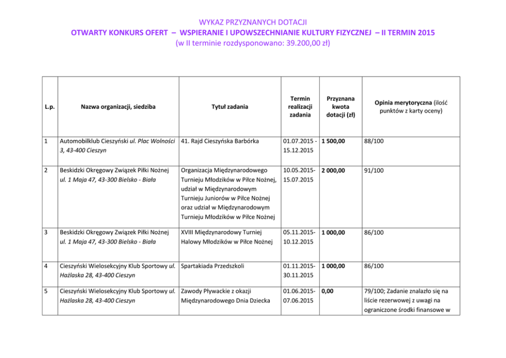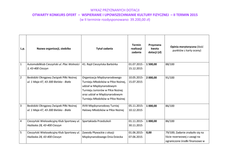 WYKAZ PRZYZNANYCH DOTACJI OTWARTY KONKURS OFERT – WSPIERANIE I UPOWSZECHNIANIE KULTURY FIZYCZNEJ – II TERMIN 2015 (w II terminie rozdysponowano: 39.200,00 zł) L.p. Nazwa organizacji, siedziba Tytuł zadania 1 Automobilklub Cieszyński ul. Plac Wolności 41. Rajd Cieszyńska Barbórka 3, 43-400 Cieszyn 2 Termin realizacji zadania Przyznana kwota dotacji (zł) Opinia merytoryczna (ilość punktów z karty oceny) 01.07.2015 - 1 500,00 15.12.2015 88/100 Beskidzki Okręgowy Związek Piłki Nożnej ul. 1 Maja 47, 43-300 Bielsko - Biała Organizacja Międzynarodowego 10.05.2015- 2 000,00 Turnieju Młodzików w Piłce Nożnej, 15.07.2015 udział w Międzynarodowym Turnieju Juniorów w Piłce Nożnej oraz udział w Międzynarodowym Turnieju Młodzików w Piłce Nożnej 91/100 3 Beskidzki Okręgowy Związek Piłki Nożnej ul. 1 Maja 47, 43-300 Bielsko - Biała XVIII Międzynarodowy Turniej Halowy Młodzików w Piłce Nożnej 05.11.2015- 1 000,00 10.12.2015 86/100 4 Cieszyński Wielosekcyjny Klub Sportowy ul. Spartakiada Przedszkoli Hażlaska 28, 43-400 Cieszyn 01.11.2015- 1 000,00 30.11.2015 86/100 5 Cieszyński Wielosekcyjny Klub Sportowy ul. Zawody Pływackie z okazji Hażlaska 28, 43-400 Cieszyn Międzynarodowego Dnia Dziecka 01.06.2015- 0,00 07.06.2015 79/100; Zadanie znalazło się na liście rezerwowej z uwagi na ograniczone środki finansowe w WYKAZ PRZYZNANYCH DOTACJI OTWARTY KONKURS OFERT – WSPIERANIE I UPOWSZECHNIANIE KULTURY FIZYCZNEJ – II TERMIN 2015 (w II terminie rozdysponowano: 39.200,00 zł) budżecie powiatu 6 Fundacja TALENT Cieszyn ul. Błogocka 49, 43-400 Cieszyn I Turniej Tenisa Stołowego o Puchar 10.09.2015- 1 000,00 Starosty Cieszyńskiego 30.11.2015 82/100 7 Integracyjne Stowarzyszenie Sportu i Rehabilitacji "Start" Wisła w Wiśle Pl. B. Hoffa 5, 43-460 Wisła Gramy bo lubimy - organizacja i uczestnictwo w meczach koszykarskich dziewcząt w ramach Śląskiej Ligi Koszykówki i o wejście do I Ligi Kobiet Region Południe 01.09.2015- 1 500,00 31.12.2015 85/100 8 Klub Jeździecki Cieszyn - Pastwiska ul. Owocowa 4, 43-400 Cieszyn Organizacja imprez jeździeckich "Święto Konia" i "I Mistrzostw Śląska Cieszyńskiego w Jeździectwie" 01.05.2015- 0,00 30.09.2015 78/100; Zadanie znalazło się na liście rezerwowej z uwagi na ograniczone środki finansowe w budżecie powiatu 9 Klub Jeździecki Cieszyn - Pastwiska ul. Owocowa 4, 43-400 Cieszyn Organizacja XII Zawodów Jeździeckich KJ Cieszyn 01.07.2015- 1 400,00 30.09.2015 89/100 10 Klub Nordic Walking "WŁÓCZYKIJE" IV Błękitny Marsz Nordic Walking Skoczów ul. Mickiewicza 9, 43-430 Skoczów 01.08.2015- 0,00 31.10.2015 79/100; Zadanie znalazło się na liście rezerwowej z uwagi na ograniczone środki finansowe w budżecie powiatu WYKAZ PRZYZNANYCH DOTACJI OTWARTY KONKURS OFERT – WSPIERANIE I UPOWSZECHNIANIE KULTURY FIZYCZNEJ – II TERMIN 2015 (w II terminie rozdysponowano: 39.200,00 zł) 11 Klub Piłkarski LUKAM Skoczów ul. Sportowa 6, 43-430 Skoczów III Turniej Piłkarski pod hasłem "Zdrowie i Fair Play" 01.05.2015- 0,00 30.06.2015 79/100; Zadanie znalazło się na liście rezerwowej z uwagi na ograniczone środki finansowe w budżecie powiatu 12 Klub Sportowy "Brzezówka" w Brzezówce ul. Jagodowa 3, Brzezówka 43-418 Pogwizdów VII Międzynarodowy Turniej Halowy 05.11.2015- 1 100,00 w Piłce Nożnej 12.12.2015 85/100 13 Klub Sportowy MARIOSPORT ul. Ks. Świeżego 5/1, 43-400 Cieszyn Jesienne zawody pływackie JUŻ PŁYWAM 01.09.2015- 1 200,00 18.12.2015 88/100 14 Kobiecy Klub Sportowy "Wisła" Skoczów ul.Bielska 34, 43-430 Skoczów Turniej powiatowy w piłce nożnej dziewcząt dla młodzieży gimnazjalnej i ponagimnazjalnej pn." Puchar Rzeki Wisły 2015" 01.05.2015- 0,00 30.07.2015 77/100; Zadanie znalazło się na liście rezerwowej z uwagi na ograniczone środki finansowe w budżecie powiatu 15 Kolejowy Klub Sportowy "Spójnia" Zebrzydowice ul. Wojska Polskiego 1a, 43410 Zebrzydowice Wakacyjny turniej żaków w piłce nożnej 01.06.2015- 0,00 30.09.2015 78/100; Zadanie znalazło się na liście rezerwowej z uwagi na ograniczone środki finansowe w budżecie powiatu 16 Ludowy Klub Sportowy "Olimpia" Goleszów Międzynarodowy Konkurs Skoków Narciarskich dzieci i młodzieży ul. Grabowa 1, 43-440 Goleszów "Memoriał im. Leopolda i Władysława Tajnerów" 20.04.2015- 1 200,00 08.05.2015 87/100 WYKAZ PRZYZNANYCH DOTACJI OTWARTY KONKURS OFERT – WSPIERANIE I UPOWSZECHNIANIE KULTURY FIZYCZNEJ – II TERMIN 2015 (w II terminie rozdysponowano: 39.200,00 zł) 17 Ludowy Klub Sportowy "Olimpia" Goleszów Międzynarodowy Konkurs Skoków Narciarskich dzieci i młodzieży ul. Grabowa 1, 43-440 Goleszów "Mikołaj w Goleszowie" 23.11.2015- 1 200,00 11.12.2015 87/100 18 Ludowy Klub Sportowy "POGÓRZE" ul. Krosowa 89, Pogórze, 43-430 Skoczów Cykl zawodów pod nazwą: "Czwartki 13.04.2015- 1 500,00 lekkoatletyczne" 30.10.2015 92/100 19 Ludowy Klub Sportowy "POGÓRZE" ul. Krosowa 89, Pogórze, 43-430 Skoczów XXVII Cross Świętojański im. Jana Marka 11.04.2015- 2 500,00 14.07.2015 100/100 20 Miejski Uczniowski Klub Sportowy "Szkolny XIV Regionalny Turniej w Związek Sportowy" Cieszyn Al. Jana Łyska Zespołowych Grach Sportowych (Koszykówce i Piłce Nożnej) Szkół 21, 43-400 Cieszyn Ponagimnazjalnych 28.09.2015- 1 300,00 15.12.2015 88/100 21 MotoBrothers Klub ul. Śrutarska 39, 43-400 "MOTO Aktywnie - Cieszyn 2015" konkursy motocyklowe dla Cieszyn najmłodszych i nie tylko… 03.05.2015- 0,00 31.07.2015 78/100; Zadanie znalazło się na liście rezerwowej z uwagi na ograniczone środki finansowe w budżecie powiatu 22 Parafia Rzymskokatolicka Dobrego Pasterza "Parafiada 2015" - przygotowanie i uczestnictwo w międzynarodowej ul. Polańska 95, 43-450 Ustroń imprezie sportowo-rekreacyjnej 01.06.2015- 1 200,00 31.07.2015 86/100 WYKAZ PRZYZNANYCH DOTACJI OTWARTY KONKURS OFERT – WSPIERANIE I UPOWSZECHNIANIE KULTURY FIZYCZNEJ – II TERMIN 2015 (w II terminie rozdysponowano: 39.200,00 zł) 23 Robotniczy Klub Sport