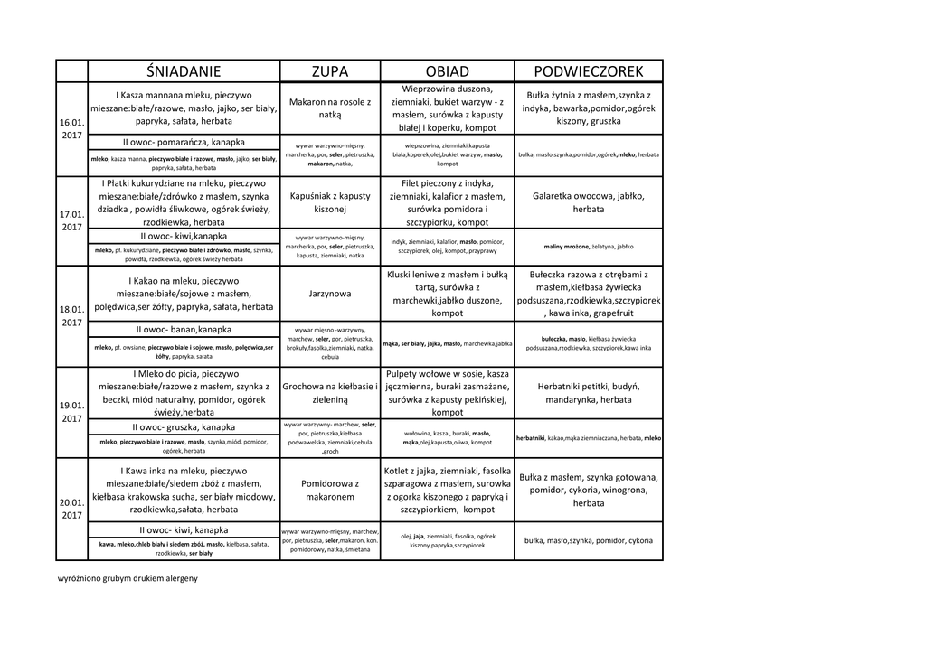 ŚNIADANIE I Kasza mannana mleku, pieczywo mieszane:białe/razowe, masło, jajko, ser biały, papryka, sałata, herbata 16.01. 2017 II owoc- pomarańcza, kanapka mleko, kasza manna, pieczywo białe i razowe, masło, jajko, ser biały, papryka, sałata, herbata 17.01. 2017 I Płatki kukurydziane na mleku, pieczywo mieszane:białe/zdrówko z masłem, szynka dziadka , powidła śliwkowe, ogórek świeży, rzodkiewka, herbata II owoc- kiwi,kanapka mleko, pł. kukurydziane, pieczywo białe i zdrówko, masło, szynka, powidła, rzodkiewka, ogórek świeży herbata I Kakao na mleku, pieczywo mieszane:białe/sojowe z masłem, 18.01. polędwica,ser żółty, papryka, sałata, herbata 2017 II owoc- banan,kanapka mleko, pł. owsiane, pieczywo białe i sojowe, masło, polędwica,ser żółty, papryka, sałata 19.01. 2017 I Mleko do picia, pieczywo mieszane:białe/razowe z masłem, szynka z beczki, miód naturalny, pomidor, ogórek świeży,herbata II owoc- gruszka, kanapka mleko, pieczywo białe i razowe, masło, szynka,miód, pomidor, ogórek, herbata I Kawa inka na mleku, pieczywo mieszane:białe/siedem zbóż z masłem, kiełbasa krakowska sucha, ser biały miodowy, 20.01. rzodkiewka,sałata, herbata 2017 II owoc- kiwi, kanapka kawa, mleko,chleb biały i siedem zbóż, masło, kiełbasa, sałata, rzodkiewka, ser biały wyróżniono grubym drukiem alergeny ZUPA OBIAD PODWIECZOREK Makaron na rosole z natką Wieprzowina duszona, ziemniaki, bukiet warzyw - z masłem, surówka z kapusty białej i koperku, kompot Bułka żytnia z masłem,szynka z indyka, bawarka,pomidor,ogórek kiszony, gruszka wywar warzywno-mięsny, marcherka, por, seler, pietruszka, makaron, natka, wieprzowina, ziemniaki,kapusta biała,koperek,olej,bukiet warzyw, masło, kompot bułka, masło,szynka,pomidor,ogórek,mleko, herbata Kapuśniak z kapusty kiszonej Filet pieczony z indyka, ziemniaki, kalafior z masłem, surówka pomidora i szczypiorku, kompot Galaretka owocowa, jabłko, herbata wywar warzywno-mięsny, marcherka, por, seler, pietruszka, kapusta, ziemniaki, natka indyk, ziemniaki, kalafior, masło, pomidor, szczypiorek, olej, kompot, przyprawy maliny mrożone, żelatyna, jabłko Jarzynowa wywar mięsno -warzywny, marchew, seler, por, pietruszka, brokuły,fasolka,ziemniaki, natka, cebula Kluski leniwe z masłem i bułką Bułeczka razowa z otrębami z tartą, surówka z masłem,kiełbasa żywiecka marchewki,jabłko duszone, podsuszana,rzodkiewka,szczypiorek kompot , kawa inka, grapefruit mąka, ser biały, jajka, masło, marchewka,jabłka Pulpety wołowe w sosie, kasza Grochowa na kiełbasie i jęczmienna, buraki zasmażane, zieleniną surówka z kapusty pekińskiej, kompot wywar warzywny- marchew, seler, por, pietruszka,kiełbasa podwawelska, ziemniaki,cebula ,groch Pomidorowa z makaronem wywar warzywno-mięsny, marchew, por, pietruszka, seler,makaron, kon. pomidorowy, natka, śmietana wołowina, kasza , buraki, masło, mąka,olej,kapusta,oliwa, kompot bułeczka, masło, kiełbasa żywiecka podsuszana,rzodkiewka, szczypiorek,kawa inka Herbatniki petitki, budyń, mandarynka, herbata herbatniki, kakao,mąka ziemniaczana, herbata, mleko Kotlet z jajka, ziemniaki, fasolka Bułka z masłem, szynka gotowana, szparagowa z masłem, surowka pomidor, cykoria, winogrona, z ogorka kiszonego z papryką i herbata szczypiorkiem, kompot olej, jaja, ziemniaki, fasolka, ogórek kiszony,papryka,szczypiorek bułka, masło,szynka, pomidor, cykoria