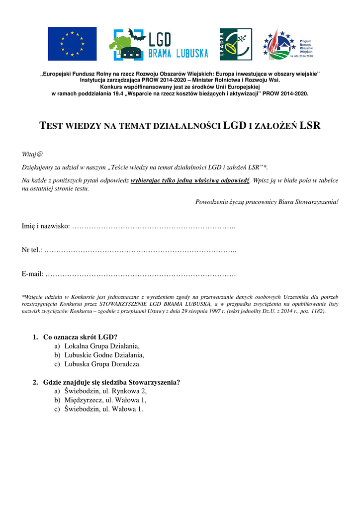 „Europejski Fundusz Rolny na rzecz Rozwoju Obszarów Wiejskich: Europa inwestująca w obszary wiejskie” Instytucja zarządzająca PROW 2014-2020 – Minister Rolnictwa i Rozwoju Wsi. Konkurs współfinansowany jest ze środków Unii Europejskiej w ramach poddziałania 19.4 „Wsparcie na rzecz kosztów bieżących i aktywizacji” PROW 2014-2020. TEST WIEDZY NA TEMAT DZIAŁALNOŚCI LGD I ZAŁOŻEŃ LSR Witaj☺ Dziękujemy za udział w naszym „Teście wiedzy na temat działalności LGD i założeń LSR”*. Na każde z poniższych pytań odpowiedz wybierając tylko jedną właściwą odpowiedź. Wpisz ją w białe pola w tabelce na ostatniej stronie testu. Powodzenia życzą pracownicy Biura Stowarzyszenia! Imię i nazwisko: ………………………………………………………….. Nr tel.: …………………………………………………………………….. E-mail: ……………………………………………………………………. *Wzięcie udziału w Konkursie jest jednoznaczne z wyrażeniem zgody na przetwarzanie danych osobowych Uczestnika dla potrzeb rozstrzygnięcia Konkursu przez STOWARZYSZENIE LGD BRAMA LUBUSKA, a w przypadku zwyciężenia na opublikowanie listy nazwisk zwycięzców Konkursu – zgodnie z przepisami Ustawy z dnia 29 sierpnia 1997 r. (tekst jednolity Dz.U. z 2014 r., poz. 1182). 1. Co oznacza skrót LGD? a) Lokalna Grupa Działania, b) Lubuskie Godne Działania, c) Lubuska Grupa Doradcza. 2. Gdzie znajduje się siedziba Stowarzyszenia? a) Świebodzin, ul. Rynkowa 2, b) Międzyrzecz, ul. Wałowa 1, c) Świebodzin, ul. Wałowa 1. „Europejski Fundusz Rolny na rzecz Rozwoju Obszarów Wiejskich: Europa inwestująca w obszary wiejskie” Instytucja zarządzająca PROW 2014-2020 – Minister Rolnictwa i Rozwoju Wsi. Konkurs współfinansowany jest ze środków Unii Europejskiej w ramach poddziałania 19.4 „Wsparcie na rzecz kosztów bieżących i aktywizacji” PROW 2014-2020. 3. Prawidłowe logo Stowarzyszenia prezentuje podpunkt: a) b) c) 4. Poprzednia nazwa STOWARZYSZENIA LGD BRAMA LUBUSKA to Stowarzyszenie „LGD Działaj z Nami”. Kiedy zmieniono nazwę Stowarzyszenia? a) w 2014 r., b) w 2015 r., c) w 2016 r. 5. Do czego nawiązuje obecna nazwa STOWARZYSZENIA LGD BRAMA LUBUSKA? a) do aspektów historycznych, b) do aspektów architektonicznych, c) do położenia geograficznego. 6. Jakie powiaty są objęte działaniem Stowarzyszenia? a) międzyrzecki, sulęciński, świebodziński, b) krośnieński, międzyrzecki, świebodziński, c) międzyrzecki, strzelecko-drezdenecki, świebodziński. 7. Sektory, jakie występują we wszystkich organach Stowarzyszenia to: a) kulturowy, publiczny, społeczny, b) kulturowy, gospodarczy, społeczny, publiczny, c) gospodarczy, społeczny, publiczny. 8. Ile jest gmin członkowskich w Stowarzyszeniu? a) 10, b) 14, c) 15. „Europejski Fundusz Rolny na rzecz Rozwoju Obszarów Wiejskich: Europa inwestująca w obszary wiejskie” Instytucja zarządzająca PROW 2014-2020 – Minister Rolnictwa i Rozwoju Wsi. Konkurs współfinansowany jest ze środków Unii Europejskiej w ramach poddziałania 19.4 „Wsparcie na rzecz kosztów bieżących i aktywizacji” PROW 2014-2020. 9. Jaka kwota dofinansowań jest przewidziana dla grupy docelowej osób chcących podjąć działalność gospodarczą lub rozwinąć działalność gospodarczą? a) 13 300 000 zł, b) 6 650 000 zł, c) 6 750 000 zł. 10. „Strategia Rozwoju Lokalnego Kierowanego przez Społeczność STOWARZYSZENIA LGD BRAMA LUBUSKA na lata 2014-2020” jest strategią jednofunduszową, która realizowana będzie w całości w oparciu o: a) Europejski Fundusz Rolny na rzecz Rozwoju Obszarów Wiejskich w ramach Programu Rozwoju Obszarów Wiejskich na lata 2014-2020, b) Europejski Fundusz Społeczny na rzecz Rozwoju Obszarów Wiejskich w ramach Programu Rozwoju Obszarów Wiejskich na lata 2014-2020. c) Europejski Fundusz Rozwoju Regionalnego w ramach Programu Rozwoju Obszarów Wiejskich na lata 2014-2020. 11. Ile projektów współpracy w ramach „Strategii Rozwoju Lokalnego Kierowanego przez Społeczność STOWARZYSZENIA LGD BRAMA LUBUSKA na lata 2014-2020” będzie realizowało nasze Stowarzyszenie? a) 1, b) 2, c) 3. 12. Jednym z projektów współpracy realizowanym przez Stowarzyszenie jest MAK. Co oznacza ten skrót? a) „Młodzieżowa Akademia Kultury”, b) „Międzynarodowa Akademia Komunikacji”, c) „Młodzieżowa Akademia Komunikacji”. 13. Zgodnie ze „Strategią Rozwoju Lokalnego Kierowanego przez Społeczność STOWARZYSZENIA LGD BRAMA LUBUSKA na lata 2014-2020” Stowarzyszenie i lokalna społeczność realizuje 3 cele ogólne oznaczone numerami 1.0, 2.0 i 3.0. Który z poniższych zapisów przedstawia prawidłowe przyporządkowanie nazwy celów do numerów? a) 1.0 Turystyka źródłem dochodu dla mieszkańców STOWARZYSZENIA LGD BRAMA LUBUSKA, 2.0 Rozwinięta przedsiębiorczość na obszarze STOWARZYSZENIA LGD BRAMA LUBUSKA, 3.0 Obszar STOWARZYSZENIA LGD BRAMA LUBUSKA obszarem przyjaznym do życia, b) 1.0 Rozwinięta przedsiębiorczość na obszarze STOWARZYSZENIA LGD BRAMA LUBUSKA, „Europejski Fundusz Rolny na rzecz Rozwoju Obszarów Wiejskich: Europa inwestująca w obszary wiejskie” Instytucja zarządzająca PROW 2014-2020 – Minister Rolnictwa i Rozwoju Wsi. Konkurs współfinansowany jest ze środków Unii Europejskiej w ramach poddziałania 19.4 „Wsparcie na rzecz kosztów bieżących i aktywizacji” PROW 2014-2020. 2.0 Obszar STOWARZYSZENIA LGD BRAMA LUBUSKA obszarem przyjaznym do życia, 3.0 Turystyka źródłem dochodu dla mieszkańców STOWARZYSZENIA LGD BRAMA LUBUSKA, c) 1.0 Obszar STOWARZYSZENIA LGD BRAMA LUBUSKA obszarem przyjaznym do życia, 2.0 Rozwinięta przedsiębiorczość na obszarze STOWARZYSZENIA LGD BRAMA LUBUSKA, 3.0 Turystyka źródłem dochodu dla mieszkańców STOWARZYSZENIA LGD BRAMA LUBUSKA. 14. Organ Stowarzyszenia, do którego kompetencji należy wybór operacji, które mają być rea