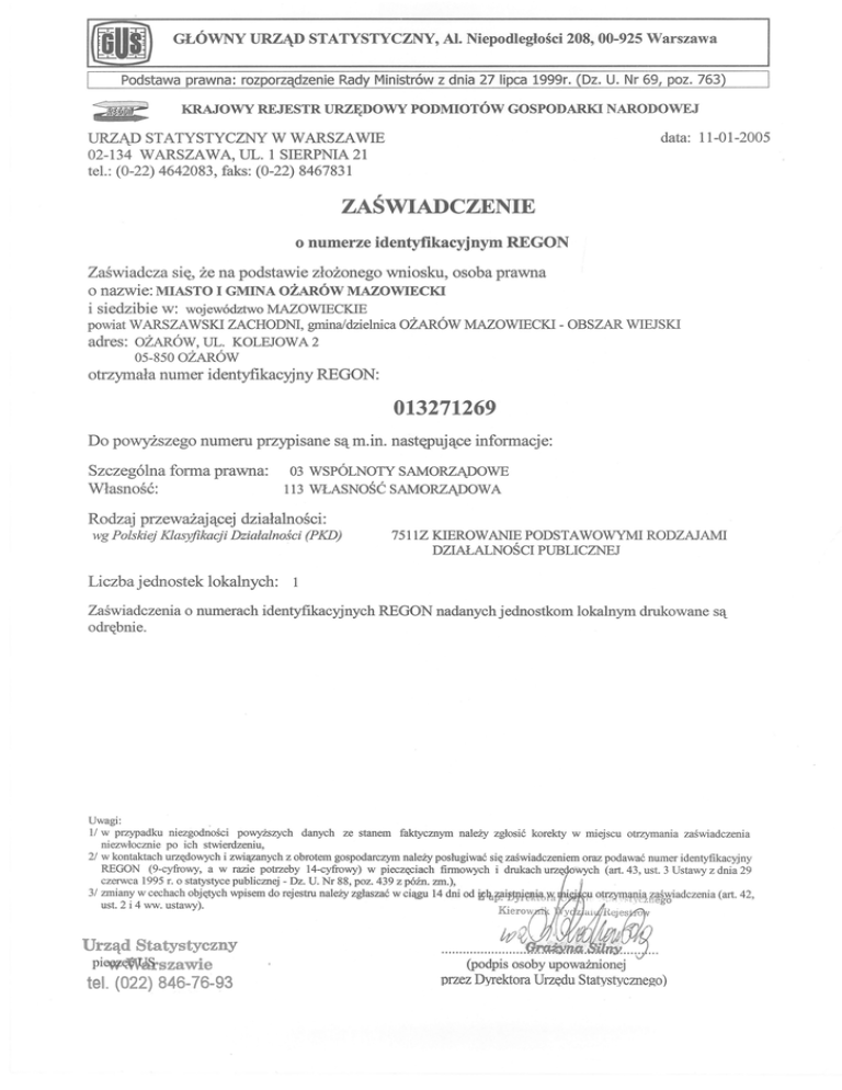 : rozporządzenie Rady Ministrów z dnia 27 lipca 1999r. (Dz. U. Nr 69, poz. 763) ^ggjp KRAJOWY REJESTR URZĘDOWY PODMIOTÓW GOSPODARKI NARODOWEJ URZĄD STATYSTYCZNY W WARSZAWIE 02-134 WARSZAWA, UL. 1 SIERPNIA 21 tel.: (0-22) 4642083, faks: (0-22) 8467831 data: 11-01 -2005 ZAŚWIADCZENIE o numerze identyfikacyjnym REGON Zaświadcza się, że na podstawie złożonego wniosku, osoba prawna 0 nazwie: MIASTO I GMINA OŻARÓW MAZOWIECKI 1 siedzibie w: województwo MAZOWIECKIE powiat WARSZAWSKI ZACHODNI, gmina/dzielnica OŻARÓW MAZOWIECKI - OBSZAR WIEJSKI adres: OŻARÓW, UL. KOLEJOWA 2 05-850 OŻARÓW otrzymała numer identyfikacyjny REGON: 013271269 Do powyższego numeru przypisane sąm.in. następujące informacje: Szczególna forma prawna: 03 WSPÓLNOTY SAMORZĄDOWE Własność: 113 WŁASNOŚĆ SAMORZĄDOWA Rodzaj przeważającej działalności: wg Polskiej Klasyfikacji Działalności (PKD) 751 IZ KIEROWANIE PODSTAWOWYMI RODZAJAMI DZIAŁALNOŚCI PUBLICZNEJ Liczba j ednostek lokalnych: 1 Zaświadczenia o numerach identyfikacyjnych REGON nadanych jednostkom lokalnym drukowane są odrębnie. Uwagi: 1/ w przypadku niezgodności powyższych danych ze stanem faktycznym należy zgłosić korekty w miejscu otrzymania zaświadczenia niezwłocznie po ich stwierdzeniu, 2/ w kontaktach urzędowych i związanych z obrotem gospodarczym należy posługiwać się zaświadczeniem oraz podawać numer identyfikacyjny REGON (9-cyfrowy, a w razie potrzeby 14-cyfrowy) w pieczęciach firmowych i drukach urzędowych (art. 43, ust. 3 Ustawy z dnia 29 czerwca 1995 r. o statystyce publicznej - Dz. U. Nr 88, poz. 439 z późn. zm.), / j 3/ zmiany w cechach objętych wpisem do rejestru należy zgłaszać w ciągu 14 dni od j ę ^ i g ^ j u ^ ^ ń ^ d a i otoym^ma zaświadczenia (art. 42, ust. 2 i 4 ww. ustawy). ' ., l / f ) / /-'go v. Kieroyrrk Wyrfziau^Kejes>fx>y Urząd Statystyczny pi^W^WSrszawie tel. (022) 846-76-93 .^toMS^I...., • (podpis osoby upoważnionej przez Dyrektora Urzędu Statystycznego) POLTAX NACZELNIK URZĘDU SKARBOWEGO aRcy^wA-riet. ANY 01-844 El? NACZELNIK URZĘDU SKARBOWEGO WAR S ZAWA-BIELANY W A R S Z A W A -i- Warszawa, dnia 26.01.2005 VAT-5 POTWIERDZENIE ZAREJESTROWANIA PODMIOTU JAKO P O D A T N I K A VAT Na podstawie art.96 ust.4 ustawy z dnia 11 marca 2004 r. o podatku od towarów i usług (Dz.U. Nr 54, poz. 535) naczelnik urzędu skarbowego potwierdza zarejestrowanie podatnika o nazwie M I A S T O I GMINA OŻARÓW MAZOWIECKI zgiąć j ako: o Numerze Identyfikacji Podatkowej P O D A T N I K A VAT 1181766202 CZYNNEGO ZWOLNIONEGO / N rbowetjo * Kierownik Działu Ewidencji i Identyfikacji Podatników i Płatników (podpis z podaniem imienia, nazwiska i stanowiska służbowecjoj Podatnik ma obowiązek posługiwania się Numerem Identyfikacji Podatkowej na zasadach określonych w art.96 ust.11 ustawy z dnia 11 marca 2004 r. o podatku od towarów i usług. *) Niepotrzebne skreślić. Nadawca: URZĄD SKARBOWY WARSZAWA-BIELANY SKALBMIERSKA 5 WARSZAWA 01-844 WARSZAWA Adresat: MIASTO I GMINA OŻARÓW MAZOWIECKI KOLEJOWA 2 OŻARÓW MAZOWIECKI 05-850 OŻARÓW MAZOWIECKI
