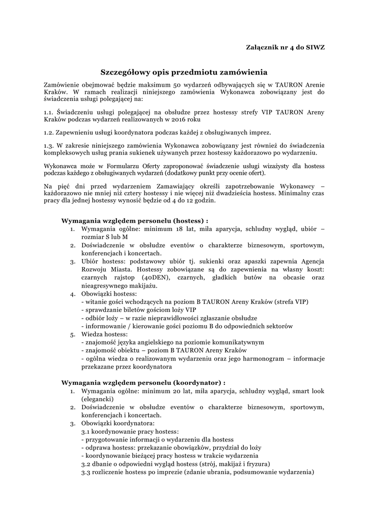 Załącznik nr 4 do SIWZ Szczegółowy opis przedmiotu zamówienia Zamówienie obejmować będzie maksimum 50 wydarzeń odbywających się w TAURON Arenie Kraków. W ramach realizacji niniejszego zamówienia Wykonawca zobowiązany jest do świadczenia usługi polegającej na: 1.1. Świadczeniu usługi polegającej na obsłudze przez hostessy strefy VIP TAURON Areny Kraków podczas wydarzeń realizowanych w 2016 roku 1.2. Zapewnieniu usługi koordynatora podczas każdej z obsługiwanych imprez. 1.3. W zakresie niniejszego zamówienia Wykonawca zobowiązany jest również do świadczenia kompleksowych usług prania sukienek używanych przez hostessy każdorazowo po wydarzeniu. Wykonawca może w Formularzu Oferty zaproponować świadczenie usługi wizażysty dla hostess podczas każdego z obsługiwanych wydarzeń (dodatkowy punkt przy ocenie ofert). Na pięć dni przed wydarzeniem Zamawiający określi zapotrzebowanie Wykonawcy – każdorazowo nie mniej niż cztery hostessy i nie więcej niż dwadzieścia hostess. Minimalny czas pracy dla jednej hostessy wynosić będzie od 4 do 12 godzin. Wymagania względem personelu (hostess) : 1. Wymagania ogólne: minimum 18 lat, miła aparycja, schludny wygląd, ubiór – rozmiar S lub M 2. Doświadczenie w obsłudze eventów o charakterze biznesowym, sportowym, konferencjach i koncertach. 3. Ubiór hostess: podstawowy ubiór tj. sukienki oraz apaszki zapewnia Agencja Rozwoju Miasta. Hostessy zobowiązane są do zapewnienia na własny koszt: czarnych rajstop (40DEN), czarnych, gładkich butów na obcasie oraz nieagresywnego makijażu. 4. Obowiązki hostess: - witanie gości wchodzących na poziom B TAURON Areny Kraków (strefa VIP) - sprawdzanie biletów gościom loży VIP - odbiór loży – w razie nieprawidłowości zgłaszanie obsłudze - informowanie / kierowanie gości poziomu B do odpowiednich sektorów 5. Wiedza hostess: - znajomość języka angielskiego na poziomie komunikatywnym - znajomość obiektu – poziom B TAURON Areny Kraków - ogólna wiedza o realizowanym wydarzeniu oraz jego harmonogram – informacje przekazane przez koordynatora Wymagania względem personelu (koordynator) : 1. Wymagania ogólne: minimum 20 lat, miła aparycja, schludny wygląd, smart look (elegancki) 2. Doświadczenie w obsłudze eventów o charakterze biznesowym, sportowym, konferencjach i koncertach. 3. Obowiązki koordynatora: 3.1 koordynowanie pracy hostess: - przygotowanie informacji o wydarzeniu dla hostess - odprawa hostess: przekazanie obowiązków, przydział do loży - koordynowanie bieżącej pracy hostess w trakcie wydarzenia 3.2 dbanie o odpowiedni wygląd hostess (strój, makijaż i fryzura) 3.3 rozliczenie hostess po imprezie (zdanie ubrania, podsumowanie wydarzenia) 4. Wiedza koordynatora: - znajomość języka angielskiego na poziomie komunikatywnym - znajomość obiektu – poziom B TAURON Areny Kraków - wiedza o realizowanym wydarzeniu oraz jego harmonogram – informacje przekazane przez Agencję Rozwoju Miasta Wykonawca zobowiązany jest do przesłania listy hostess oraz koordynatora obsługujących wydarzenie najpóźniej na trzy dni przed jego rozpoczęciem. Wykonawca zobowiązany jest do przekazywania wraz z listą portfolio ze zdjęciami wybranych hostess. Agencja Rozwoju Miasta każdorazowo dokonuje akceptacji personelu. Wykonawca zobowiązany jest do wyprania używanych przez hostessy sukienek za pomocą ogólnodostępnych detergentów, zgodnie z zaleceniami określonymi przez producenta odzieży. Usługa ta powinna być wykonana każdorazowo po zakończeniu wydarzenia, w czasie zapewniającym korzystanie z czystej odzieży na kolejnym wydarzeniu. Wykonawca zobowiązany jest do zapewnienia transportu odzieży.