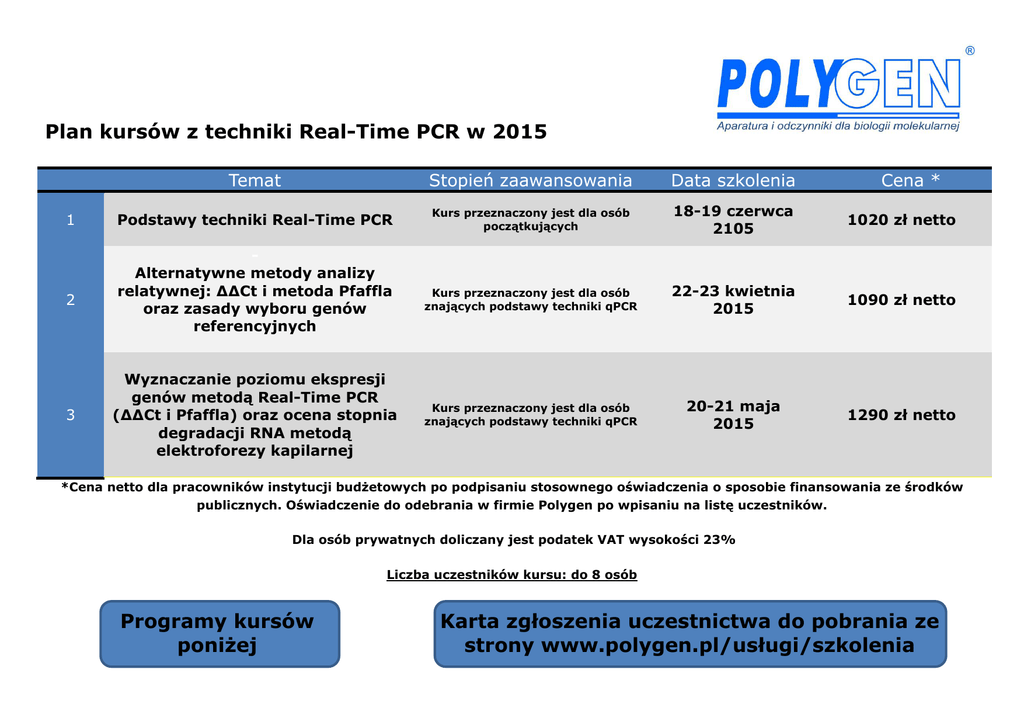 Plan kursów z techniki Real-Time PCR w 2015 Programy kursów