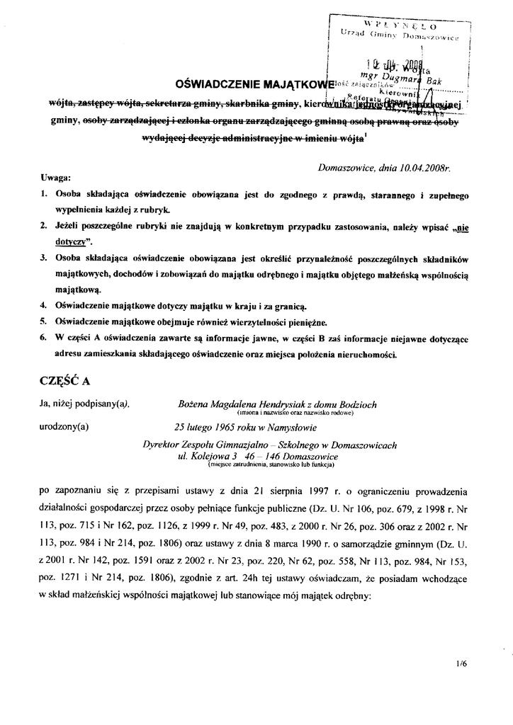 Hendrysiak Bożena - oświadczenie majątkowe za 2007r