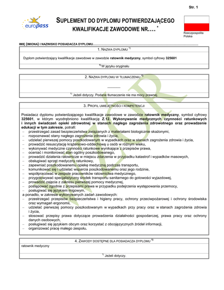 Str. 1 SUPLEMENT DO DYPLOMU POTWIERDZAJĄCEGO KWALIFIKACJE ZAWODOWE NR…. * Rzeczpospolita Polska IMIĘ (IMIONA) I NAZWISKO POSIADACZA DYPLOMU…………………………………………………………………………………… 1. NAZWA DYPLOMU 1) Dyplom potwierdzający kwalifikacje zawodowe w zawodzie ratownik medyczny, symbol cyfrowy 325601 1) W języku oryginału 2. NAZWA DYPLOMU W TŁUMACZENIU 1) _______ 1) Jeżeli dotyczy. Podane tłumaczenie nie ma mocy prawnej. 3. PROFIL UMIEJĘTNOŚCI I KOMPETENCJI Posiadacz dyplomu potwierdzającego kwalifikacje zawodowe w zawodzie ratownik medyczny, symbol cyfrowy 325601, w którym wyodrębniono kwalifikację Z.12. Wykonywanie medycznych czynności ratunkowych i innych świadczeń opieki zdrowotnej w stanach nagłego zagrożenia zdrowotnego oraz prowadzenie edukacji w tym zakresie, potrafi: – przestrzegać zasad bezpieczeństwa związanych z materiałami biologicznie skażonymi, – rozpoznawać stany nagłego zagrożenia zdrowia i życia, – udzielać pierwszej pomocy poszkodowanym w wypadkach oraz w stanach zagrożenia zdrowia i życia, – prowadzić resuscytację krążeniowo-oddechową u osób w różnym wieku, – wykonywać medyczne czynności ratunkowe wynikające z przepisów prawa, – oceniać i monitorować stan ogólny poszkodowanego, – prowadzić działania ratownicze w miejscu zdarzenia w przypadku katastrof i wypadków masowych, – obsługiwać sprzęt medyczny ratunkowy, – zapewniać poszkodowanemu opiekę medyczną podczas transportu, – komunikować się i udzielać wsparcia poszkodowanemu oraz jego rodzinie, – współpracować w zespole pracowników ratownictwa medycznego, – przygotowywać specjalistyczny środek transportu sanitarnego do gotowości wyjazdowej, – prowadzić zajęcia z zakresu pierwszej pomocy medycznej, – postępować zgodnie z przepisami prawa w przypadku podejrzenia występowania przemocy, – posługiwać się językiem migowym, a ponadto, w zakresie wykonywanych zadań zawodowych: – przestrzegać przepisów bezpieczeństwa i higieny pracy, ochrony przeciwpożarowej i ochrony środowiska oraz wymagań ergonomii, – udzielać pierwszej pomocy poszkodowanym w wypadkach przy pracy oraz w stanach zagrożenia zdrowia i życia, – stosować przepisy prawa dotyczące prowadzenia działalności gospodarczej, prawa pracy oraz ochrony danych osobowych, – posługiwać się językiem obcym oraz korzystać z obcojęzycznych źródeł informacji, – organizować pracę małego zespołu. 4. ZAWODY DOSTĘPNE DLA POSIADACZA DYPLOMU ratownik medyczny 1) Jeżeli dotyczy. 1) Str. 2 5.PODSTAWA WYDANIA DYPLOMU Nazwa podmiotu wydającego dyplom Okręgowa Komisja Egzaminacyjna w …………………………. Nazwa władz sprawujących nadzór nad podmiotem wydającym dyplom Minister Edukacji Narodowej Poziom wykształcenia (krajowy lub międzynarodowy) ISCED 4 Warunki zdania egzaminu potwierdzającego kwalifikacje w zawodzie Egzamin przeprowadzany jest z każdej kwalifikacji wyodrębnionej w zawodzie. Warunkiem zdania egzaminu zawodowego, złożonego z dwóch części, jest uzyskanie: 1) z części pisemnej - co najmniej 50% punktów możliwych do uzyskania, 2) z części praktycznej - co najmniej 75% punktów możliwych do uzyskania. Dostęp do następnego poziomu kształcenia Jeżeli posiadacz dyplomu uzyskał świadectwo dojrzałości, może kontynuować kształcenie w szkole wyższej. Umowy międzynarodowe _______ Podstawa prawna wydania dyplomu stosowne rozporządzenie 6. OFICJALNIE UZNANE SPOSOBY UZYSKANIA DYPLOMU Posiadacz dyplomu uzyskał wykształcenie średnie oraz zdał egzamin potwierdzający kwalifikację Z.12. Wykonywanie medycznych czynności ratunkowych i innych świadczeń opieki zdrowotnej w stanach nagłego zagrożenia zdrowotnego oraz prowadzenie edukacji w tym zakresie w zawodzie ratownik medyczny. Kwalifikacja wyodrębniona w tym zawodzie jest możliwa do uzyskania w ramach poniższych sposobów nabywania kwalifikacji: Możliwe sposoby nabywania kwalifikacji w zawodzie ratownik medyczny Udział kształcenia teoretycznego/praktycznego (%) Kształcenie w szkole (2-letnia szkoła policealna) Kształcenie ustawiczne w formach pozaszkolnych (minimalna liczba godzin kształcenia określona w podstawie programowej kształcenia w zawodach) Potwierdzanie kwalifikacji w trybie egzaminów eksternistycznych dla osób, które ukończyły gimnazjum albo 8-letnią szkołę podstawową oraz: a) co najmniej 2 lata kształciły się w zawodzie lub b) co najmniej 2 lata pracowały w zawodzie 50/50 – – Informacje dodatkowe: Okręgowa Komisja Egzaminacyjna w ………………………, e-mail: Więcej informacji (w tym opis krajowego systemu kwalifikacji) można znaleźć w Internecie pod adresem: www.men.gov.pl, www.koweziu.edu.pl Krajowy punkt informacyjny: www.europass.org.pl *Nota objaśniająca Niniejszy dokument ma na celu dostarczenie dodatkowych informacji na temat dyplomu potwierdzającego kwalifikacje zawodowe i sam w sobie nie ma mocy prawnej. Podstawą opisu są następujące teksty: Rezolucja Rady nr 93/C 49/01 z dnia 3 grudnia 1992 r. dotycząca przejrzystości kwalifikacji, Rezolucja Rady nr 96/C 224/04 z dnia 15 lipca 1996 r. dotycząca przejrzystości dyplomów szkolenia zawodowego, Zalecenie Parlamentu Europejskiego oraz Rady nr 2001/613/EC z dnia 10 lipca 2001 r. w sprawie mobilności w ramach Wspólnoty studentów, osób przechodzących szkolenia, wolontariuszy, nauczycieli i instruktorów. Więcej informacji można uzyskać pod adresem: http://europass.cedefop.eu.int © European Communities 2002