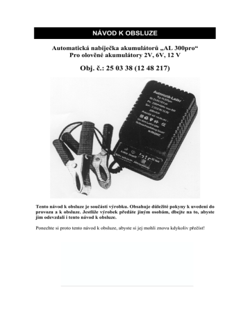 NÁVOD K OBSLUZE Automatická nabíječka akumulátorů „AL 300pro“ Pro olověné akumulátory 2V, 6V, 12 V Obj. č.: 25 03 38 (12 48 217) Tento návod k obsluze je součástí výrobku. Obsahuje důležité pokyny k uvedení do provozu a k obsluze. Jestliže výrobek předáte jiným osobám, dbejte na to, abyste jim odevzdali i tento návod k obsluze. Ponechte si proto tento návod k obsluze, abyste si jej mohli znovu kdykoliv přečíst! h-tronic wegierski2 Přečtete si pozorně tento návod k obsluze. Neručíme za škody způsobené nedodržením pokynů, které jsou v tomto návodu k obsluze uvedeny, ani za následné škody, které by z toho vyplynuly. V takovémto případě zanikají jakékoliv nároky ze záruky. Tento přístroj opustil výrobní závod v bezvadném bezpečnostně technickém stavu. Abyste přístroj uchovali v dobrém stavu a zajistili jeho bezpečný provoz, je třeba abyste tento návod k obsluze dodržovali! Obsah Strana POUŽITÍ NABÍJEČKY AKUMULÁTORŮ ........................................................................................... 2 BEZPEČNOSTNÍ PŘEDPISY.................................................................................................................. 3 POPIS FUNKCE PŘÍSTROJE................................................................................................................. 4 POZNÁMKY K PROVOZU NABÍJEČKY............................................................................................. 4 OBSLUHA PŘÍSTROJE ........................................................................................................................... 5 POZNÁMKY PRO MANIPULACI S AKUMULÁTORY..................................................................... 5 TECHNICKÉ ÚDAJE ............................................................................................................................... 5 VYŘAZENÍ PŘÍSTROJE Z PROVOZU......................... CHYBA! ZÁLOŽKA NENÍ DEFINOVÁNA. Použití nabíječky akumulátorů Přístroj je určen k nabíjení obyčejných olověných, gelových olověných nebo akumulátorů s mikrodeskami z alkalického skla (AGM) o napětí 2 V, 6 V a 12 V. Nabíječka je vhodná i pro kompaktní akumulátorové baterie, které nevyžadují žádnou údržbu. Jiný způsob používání přístroje než bylo uvedeno výše by mohl vést k poškození tohoto přístroje. Na výrobku nesmějí být prováděny změny nebo přestavby (přepojování)! Dodržujte bezpodmínečně bezpečnostní předpisy! 2 Bezpečnostní předpisy Vzniknou-li škody nedodržením tohoto návodu k obsluze, zanikne nárok na záruku! Neručíme za následné škody, které by z toho vyplynuly. Neodpovídáme za věcné škody, úrazy osob, které byly způsobeny neodborným zacházením nebo nedodržováním bezpečnostních předpisů. V těchto případech zaniká jakýkoliv nárok na záruku. • Přístroj lze výlučně napájet pouze ze sítě se střídavým napětím 230 V / 50 Hz. • Přístroj můžete při používání umístit do libovolné polohy. • Nabíječku nelze používat ve vlhkých prostorách a venkovním prostředí! • Chraňte nabíječku přes vlhkostí, stříkající vodou a nevystavujte ji vysokým teplotám. • Touto nabíječkou lze nabíjet pouze olověné akumulátory o napětí 2-6-12 V. • V žádném případě nesmíte touto nabíječkou nabíjet suché baterie! • Přístroj nesmí být používán v prostorách, kde se vyskytují snadno vznětlivé kapaliny a výpary. • Tento přístroj není žádná dětská hračka a není určen pro mladistvé (do 14 let). • Přístroj smí být uveden do provozu jen pod dozorem dospělých osob nebo odborníků. • V průmyslových zařízeních je nutno dodržovat předpisy úrazové zábrany, které se týkají elektrických zařízení a provozních prostředků. • Ve školách, v učňovských zařízeních a amatérských dílnách by mělo být kontrolováno zacházení s měřícími přístroji odpovědným odborným personálem. • Nepracujte s přístrojem v prostorách s nepříznivými okolními podmínkami, ve kterých se nacházejí nebo kde by se mohly vyskytovat hořlavé plyny, výpary nebo prach. • Opravy přístroje je nutno provádět pouze s použitím originálních náhradních dílů. Použití jiných dílů může způsobit poškození přístroje. • Opravy přístroje mohou provádět pouze zkušení a kvalifikovaní odborníci. • Po použití odpojte přístroj od síťového napájení. Nejdříve odpojte akumulátor, teprve poté síťové napájení. • Pokud si nebudete jisti s použitím přístroje (elektrické charakteristiky, zapojení externích přístrojů atd.), je třeba abyste se poradili se zkušeným odborníkem. 3 Popis funkce přístroje Pomocí této malé automatické nabíječky můžete automaticky (bez dozoru) nabíjet olověné akumulátory o napětí 2, 6 nebo 12 V. Jakmile dosáhne nabíjený akumulátor koncového nabíjecího napětí, sníží přístroj nabíjecí proud takovým způsobem, aby v žádném případě nemohlo dojít k přebití akumulátoru. Elektronická regulace napětí a proudu udržuje dále připojený akumulátor nabitý na optimální kapacitu a současně brání přebití akumulátoru a s tím spojené tvorbě nebezpečného třaskavého plynu. Přístroj se vyznačuje následujícími charakteristikami: • Krátkodobá ochrana proti zkratu a přepólování • Konstantní koncové nabíjecí napětí • Optická indikace nabíjení a přepólování • Nastavení nabíjecího napětí pomocí posuvného přepínače Poznámky k provozu nabíječky Oproti obyčejným jednoduchým nabíječkám nezůstává nabíjecí proud této automatické nabíječky na konstantní úrovni a je ovlivňován několika faktory. Mezi tyto faktory patří například stav nabití akumulátoru, stáří akumulátoru, typ aku