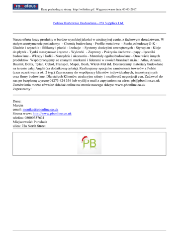 Dane pochodzą ze strony: http://wiltshire.pl/. Wygenerowano dnia: 03-03-2017. Polska Hurtownia Budowlana - PB Supplies Ltd Nasza oferta łączy produkty o bardzo wysokiej jakości w atrakcyjnej cenie, z fachowym doradztwem. W stałym asortymencie posiadamy: - Chemię budowlaną - Profile metalowe - Suchą zabudowę G-K Gładzie i szpachle - Silikony i pianki - Izolacje - Systemy dociepleń zewnętrznych - Styropian - Kleje do płytek - Tynki maszynowe i ręczne - Wylewki - Zaprawy - Pokrycia dachowe - papy - łączniki budowlane - Wkręty i kołki - Narzędzia i akcesoria - Materiały ogólnobudowlane - Oraz wiele innych produktów Współpracujemy ze znanymi markami i liderami w swoich branżach m.in.: Atlas, Arsanit, Baumit, Bolix, Tytan, Cekol, Franspol, Mapei, Bosh, Wkret-Met itd. Dostarczamy materiały budowlane na terenie całej Anglii (za dodatkową opłatą). Realizujemy specjalne zamówienia towarów z Polski (czas oczekiwania ok. 2 tyg.) Zapraszamy do współpracy klientów indywidualnych, inwestycyjnych oraz firmy budowlane. Dla stałych Klientów atrakcyjne rabaty i możliwość negocjacji cen. Zadzwoń do nas po bezpłatną wycenę 01273 424 356 lub wyślij e-mail z zapytaniem na adres: [email protected] Zamówienia można również składać online na stronie naszego sklepu: www.pbonline.co.uk Zapraszamy! Dane: Marcin email: [email protected] Strona www: http://www.pbonline.co.uk telefon: 08000337631 Miejscowość: Portslade ulica: 72a North Street