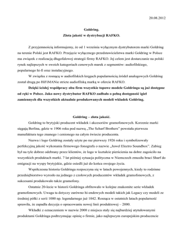 20.08.2012 Goldring. Złota jakość w dystrybucji RAFKO. Z przyjemnością informujemy, że od 1 września wyłącznym dystrybutorem marki Goldring na terenie Polski jest RAFKO. Przejęcie wyłącznego przedstawicielstwa marki Goldring w Polsce ma związek z realizacją długofalowej strategii firmy RAFKO. Jej celem jest dostarczanie na polski rynek najlepszych w swoich kategoriach cenowych marek z segmentów: audiofilskiego, popularnego hi-fi oraz instalacyjnego. W związku z rosnącą w audiofilskich kręgach popularnością źródeł analogowych Goldring został drugą po HiFiMANie stricte audiofilską marką w ofercie RAFKO. Dzięki ścisłej współpracy obu firm wszystkie topowe modele Goldringa są już dostępne od ręki w Polsce. Jako nowy dystrybutor RAFKO zadbało o pełną dostępność igieł zamiennych dla wszystkich aktualnie produkowanych modeli wkładek Goldring. Goldring – złota jakość. Goldring to brytyjski producent wkładek i akcesoriów gramofonowych. Korzenie marki sięgają Berlina, gdzie w 1906 roku pod nazwą „The Scharf Brothers” powstała pierwsza manufaktura tego znanego i cenionego na całym świecie producenta. Nazwa i logo Goldring zostały użyte po raz pierwszy 1926 roku i symbolizowały perfekcyjną jakość wykonania firmowego fonografu o nazwie „Juwel Electro Soundbox”. Zabieg był na tyle dobrze odebrany przez klientów, że logo w kształcie pierścienia na dobre zagościło na wszystkich produktach marki. 7 lat później sytuacja polityczna w Niemczech zmusiła braci Sharf do emigracji na wyspy brytyjskie, gdzie osiedli już do końca swojego życia. Współczesna historia Goldringa rozpoczyna się w latach powojennych, kiedy to rodzinne przedsiębiorstwo wyrosło na jednego z czołowych producentów wkładek gramofonowych, z sukcesami produkowało także gramofony. Ostatnie 20-lecie w historii Goldringa obfitowało w kolejne znakomite serie wkładek gramofonowych. Uwaga ta dotyczy zarówno hi-endowych modeli takich jak Legacy czy modeli ze średniej półki z serii 1000 np. legendarnego już 1042. Rosnąca w ostatnich latach popularność sprawiła, że zapadła decyzja o opracowaniu nowej linii produktowej – 2000. Wkładki z oznaczeniem w nazwie 2000 z miejsca stały się najbardziej utytułowanymi produktami Goldringa podtrzymując opinię o firmie, jako najlepszym europejskim producencie wkładek gramofonowych. Seria 2000 podtrzymuje dumną tradycję ręcznej produkcji wkładek Goldringa – w fabrykach na terenie Wielkiej Brytanii i Japonii. Goldring – wkładki typu MM. Seria Elan/Elektra. Elan i Elektra to wejściowe wkładki Goldringa, które są przeznaczone dla wymagających użytkowników tańszych gramofonów. W obu przypadkach zastosowano diamentową igłę oraz sztywną i w pełni zamkniętą konstrukcję wkładki. Zarówno Elan jak i Elektra wyróżniają się bardzo dobrą kompatybilnością sprzętową oraz dźwiękową z różnorodnymi ramionami, gramofonami oraz przedwzmacniaczami. W przypadku Elan zastosowano szlif typu sferycznego, zaś w przypadku Elektry szlif typu eliptycznego, który dodatkowo poprawia przetwarzanie wysokich tonów. Wkładki posiadają wymienne igły. Oba modele produkowane są na terenie Japonii. Seria 1000. Firmowa seria oparta przede wszystkim na dwóch modelach. Pierwszy to legendarny 1042 oparty o szlif Gyger S dostępny zazwyczaj w dużo droższych hi-endowych wkładkach. Drugi model z serii 1000 to 1012GX (szlif Gyger II), który z miejsca stał się najlepiej sprzedającą się wkładką w historii firmy. 1012GX słynie z bardzo rozdzielczych wysokich tonów przy minimalnych zniekształceniach oraz rewelacyjnej dynamiki przekazu. Wkładki serii 1000 posiadają ten sam typ elektroniki, zaś brzmieniowe i jakościowe różnice między nimi wynikają z innych typów szlifów w kolejnych modelach. Wejściowy model 1006 został wyposażony w klasyczny szlif eliptyczny, 1012GX oraz 1042, jak już zostało wspomniane w różne odmiany szlifu Gygera, zaś 1022GX w szlif typu Vital PH. Dzięki ultralekkiej i minimalistycznej konstrukcji producent poleca 1022GX do wnikliwego, analitycznego odsłuchu. Wszystkie modele serii 1000 są produkowane na terenie Wielkiej Brytanii. Seria 2000. Najczęściej w ostatnich latach nagradzana w prasie seria od Goldringa, która wprowadziła zasadnicze różnice w stylistyce brytyjskich wkładek. Magazyn What Hi-Fi wyróżnił najwyższą notą 5 gwiazdek aż trzy modele z tej serii: 2100, 2400 oraz 2500. Najważniejsze wspólne cechy serii 2000 to: − produkcja w Japonii – dla najwyższej precyzji wykonania − gwintowane otwory na mocowanie do ramienia – dla najwyższej wygody i bezpieczeństwa montażu, − pozłacane wtyki – dla wyeliminowania korozji oraz najwyższej jakości styku, − obudowa wkładki pokryta materiałem ekranującym „Super Permalloy” – dla zapewnienia najwyższej czułości oraz redukcji niechcianych pogłosów w momencie opuszczania i podnoszenia ramienia, − armaturowa budowa igły z unikalnego stopu niklu i stali – dla zmniejszenia bezwładności wspornika igły, − magnes samarowo-kobaltowy – dla zapewnienia wysokiej czułości wkładki. Modele 2100 oraz 2200 zostały wyposażone w igłę ze szlifem eliptycznym. Szczególnie godnym uwagi jest model 2100, który oferuje jedną z najlepszych relacji ceny do jakości. Model 2300 jest przeznaczony do gramofonów ze średniej półki i jest odpowiednikiem 1012GX. Modele 2400 oraz 2500 to najwyższej klasy modele Goldring typu MM. Dzięki unikalnym typom szlifu: Vital w 2400 oraz 2 SD w 2500, stanowią podstawę do budowy hiendowego systemu opartego na źródle gramofonowym. Dodatkowo, modele 2400/2500 zostały wyposażone w pełni metalową obudowę, której zwiększona masa pozwala na wygenerowanie pełnego i mocnego basu. Goldring – wkładki typu MC. Eroica H/Eroica LX. Eroica to wysokiej klasy wkładki typu MC, których konstrukcje opierają się na mocnych mag