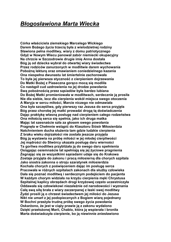 Błogosławiona Marta Wiecka Córka właściciela ziemskiego Marcelego Wickiego Darem Bożego życia trzecią była z wielodzietnej rodziny Sławiona pełna modlitwy, wiary z domu patriotycznego Gdyż w Nowym Wiecu panował zabór niemiecki okupacyjny Na chrzcie w Szczodrowie drugie imię Anna dostała Bóg ją od dziecka wybrał do otwartej wiary świadectwa Przez rodziców zanurzonych w modlitwie darem wychowania Pobożną lekturą oraz omawianiem coniedzielnego kazania Ona niespełna dwunastu lat śmiertelnie zachorowała To była jej pierwsza styczność z cierpieniem dojrzewania Do Matki Bożej z Piaseczna gorąco mocą się modliła Co nastąpił cud uzdrowienia na jej drodze powołania Swą pobożnością przez sąsiadów była bardzo lubiana Do Bożej Matki promieniowała w modlitwach, serdecznie ją prosiła Nie dla siebie, lecz dla cierpienia wokół miejsca swego otoczenia A Maryja w sercu miłości, Marcie niczego nie odmawiała Ona była szczęśliwa, gdy pierwszy raz Jezusa do serca przyjęła Bóg przez chorobę jej matki prowadzi drogą tą doświadczenia Dając praktykę własną posługę nad cierpieniem całego rodzeństwa Ona miłością serca się spełnia, jako ich druga matka Mając lat szesnaście szła za głosem swego powołania Pragnęła w Chełmnie wstąpić do Klasztoru Sióstr Miłosierdzia Natchnieniem ducha służenia tam gdzie ludzkie cierpienia Z braku wieku dojrzałości nie została jeszcze przyjęta Bóg ją wystawia na próbę miłości w jej młodej cierpliwości Jej mądrości do Stwórcy ukazała posługę daru wierności Ta gorliwa modlitwa przybliżała ją do swego daru spełnienia Osiągając osiemnaście lat spełniają się jej życiowe pragnienia Żegnając się ze wszystkimi sąsiadami udaje się do Krakowa Zostaje przyjęta do zakonu i pracą miłosierną dla chorych szpitala Jako siostra zakonna o stroju szaratynek miłosierdzia Kochała chorych z poświęceniem dając im posługę serca Pracowała w różnych szpitalach zakonach dla służby człowieka Dała się poznać modlitwą i serdecznym podejściem do pacjenta W każdym chorym widziała na krzyżu cierpienia męki Chrystusa Szpitalnej kaplicy obrzędach drogi krzyżowej często uczestniczyła Oddawała się człowiekowi niezależnie od narodowości i wyznania Całą swą siłą brała z wiary zaczerpanej z łaski swej modlitwy Żydzi prosili ją o chrzest świadectwem jej miłości do Jezusa Nikt nie umarł z jej podopiecznych z Bogiem wiarą pojednany W Bochni przeżyła trudną próbę swego życia powołania Oskarżono, że jest w ciąży prawie ją z zakonu wydalono Dzięki przełożonej Marii, Chablo, która ją wspierała i broniła Marta doświadczyła cierpienie, bo ją niewinnie zniesławiono Swe posądzenie w umartwianiu całkowicie w Bogu zawierzyła Okazała się niewinna doświadczyła sądu skazanego Chrystusa Przeniesiono ją z posługą do szpitala i klasztoru w Światynie Miejscowy proboszcz swym parafianom powierza jej miłosierdzie Kochała każdego cierpiącego człowieka na duszy i jego ciała Niezależnie od narodowości poglądów i jego wyznania Marta nikomu pomocy nie odmawiała tylko pomagała Przepowiedziała własną śmierć objawioną Jezusa z krzyża Ona go widziała i słyszała, że zabierze ją do siebie to są fakty Co tak się stało dla miłości młodego ojca i jego rodziny Dobrowolnie składa największy dar jej miłosiernego życia Ona szła drogą do końca na podobieństwo samego Chrystusa W tym szpitalu był tyfus plamisty to beznadziejna choroba Ten pracownik miał przeprowadzić dezynfekcję pomieszczenia Całe jej życie to miłość i wiara dla dobra drugiego człowieka Świadoma zagrożeniem życia sama dezynfekcję przeprowadza Gdy pojawiły się pierwsze objawy śmiertelnej jej choroby Wszyscy się modlili nawet Żydzi o łaskę dobroci do Boga O uzdrowienie Marty młodej trzydziestoletniej zakonnicy Ona od dziecka prowadzona przez Ducha Św. szła w ramiona Jezusa Po przyjęciu sakramentu namaszczenia w tej ciężkiej chorobie Zmarła szczęśliwa spokojna w drodze do chwały serca Chrystusa Trzydziestego maja w Światynie następuje jej wielkie pożegnanie Niezwykłą siostrę miłosierdzia łaską pełna błogosławieństwa To jest fakt potwierdzili dawne i dzisiejsze lata jej uwielbienia Na grób Marty Wickiej ciągle przychodzą tłumy, bo ona wciąż pomaga Niezależnie od narodowości wieku i ludzkiego wyznania Marta uzdrawia we wszystkich sprawach taka jest tam wiara Hieronim Borkowski