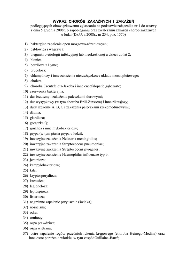 WYKAZ CHORÓB ZAKAŹNYCH I ZAKAŻEŃ podlegających obowiązkowemu zgłaszaniu na podstawie załącznika nr 1 do ustawy z dnia 5 grudnia 2008r. o zapobieganiu oraz zwalczaniu zakażeń chorób zakaźnych u ludzi (Dz.U. z 2008r., nr 234, poz. 1570) 1) 2) 3) 4) 5) 6) 7) 8) 9) 10) 11) 12) 13) 14) 15) 16) 17) 18) 19) 20) 21) 22) 23) 24) 25) 26) 27) 28) 29) 30) 31) 32) 33) 34) 35) 36) 37) bakteryjne zapalenie opon mózgowo-rdzeniowych; bąblowica i wągrzyca; biegunki o etiologii infekcyjnej lub nieokreślonej u dzieci do lat 2; błonica; borelioza z Lyme; bruceloza; chlamydiozy i inne zakażenia nierzeżączkowe układu moczopłciowego; cholera; choroba Creutzfeldta-Jakoba i inne encefalopatie gąbczaste; czerwonka bakteryjna; dur brzuszny i zakażenia pałeczkami durowymi; dur wysypkowy (w tym choroba Brill-Zinssera) i inne riketsjozy; dury rzekome A, B, C i zakażenia pałeczkami rzekomodurowymi; dżuma; giardioza; gorączka Q; gruźlica i inne mykobakteriozy; grypa (w tym ptasia grypa u ludzi); inwazyjne zakażenia Neisseria meningitidis; inwazyjne zakażenia Streptococcus pneumoniae; inwazyjne zakażenia Streptococcus pyogenes; inwazyjne zakażenie Haemophilus influenzae typ b; jersinioza; kampylobakterioza; kiła; kryptosporydioza; krztusiec; legioneloza; leptospirozy; listerioza; nagminne zapalenie przyusznic (świnka); nosacizna; odra; ornitozy; ospa prawdziwa; ospa wietrzna; ostre zapalenie rogów przednich rdzenia kręgowego (choroba Heinego-Medina) oraz inne ostre porażenia wiotkie, w tym zespół Guillaina-Barré; 38) 39) 40) 41) 42) płonnica; pryszczyca; różyczka i zespół różyczki wrodzonej; rzeżączka; salmonelozy inne niż wywołane przez pałeczki Salmonella Typhi i Salmonella Paratyphi A, B, C oraz zakażenia przez nie wywołane; 43) tężec; 44) toksoplazmoza wrodzona; 45) tularemia; 46) wąglik; 47) wirusowe gorączki krwotoczne, w tym żółta gorączka; 48) wirusowe zapalenia wątroby (A, B, C, inne) oraz zakażenia wywołane przez wirusy zapalenia wątroby typu B i C; 49) wirusowe zapalenie opon mózgowo-rdzeniowych, mózgu i rdzenia (z wyłączeniem wścieklizny); 50) włośnica; 51) wścieklizna; 52) zakażenia i zatrucia pokarmowe o etiologii infekcyjnej nieustalonej; 53) zakażenia szpitalne; 54) zakażenia wirusem zachodniego Nilu; 55) zakażenie ludzkim wirusem niedoboru odporności (HIV) i zespół nabytego niedoboru odporności (AIDS); 56) zatrucie jadem kiełbasianym (botulizm); 57) zespół hemolityczno-mocznicowy i inne postaci zakażenia enterokrwotocznymi i werocytotoksycznymi pałeczkami Escherichia coli (EHEC); 58) zespół ostrej niewydolności oddechowej (SARS); 59) zimnica (malaria).
