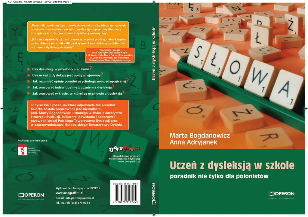 XD1-Okladka_w8:XD1-Okladka 1/27/09 3:18 PM Page 1 XD1-00 [tyt tech wstep spis]Q8:XD1-00 [tyt tech wstep spis] 1/27/09 12:57 PM Page 1 Marta Bogdanowicz Anna Adryjanek Uczeƒ z dysleksjà w szkole Poradnik nie tylko dla polonistów Wydanie trzecie zmienione Gdynia 2009 XD1-00 [tyt tech wstep spis]Q8:XD1-00 [tyt tech wstep spis] 1/27/09 12:58 PM Page 2 Recenzja merytoryczna: dr hab. Gra˝yna Krasowicz-Kupis, prof. UMCS Redaktor prowadzàcy: Aleksandra Giba∏a Redakcja j´zykowa: Ma∏gorzata Makowska, El˝bieta Pa∏asz Korekta: Honorata Jasicka Projekt ok∏adki: Krzysztof Godlewski Redakcja graficzna i sk∏ad: Kamila Kwiek Ilustracje: Kornel Kowalski Pomys∏y ilustracji ze stron 11, 34, 40, 56, 64, 77, 121: Marta Bogdanowicz Publikacja zalecana przez Polskie Towarzystwo Dysleksji © Copyright by Wydawnictwo Pedagogiczne OPERON Sp. z o.o. & Marta Bogdanowicz, Anna Adryjanek Gdynia 2005 Wszelkie prawa zastrze˝one. Kopiowanie w ca∏oÊci lub we fragmentach bez zgody wydawcy zabronione. 1-9/XIV Wydawca: Wydawnictwo Pedagogiczne OPERON Sp. z o.o. 81-212 Gdynia, ul. Hutnicza 3 tel. 058 679 00 00 e -mail: [email protected] http://www.operon.pl ISBN 978-83-7461-872-4 XD1-00 [tyt tech wstep spis]Q8:XD1-00 [tyt tech wstep spis] 1/27/09 12:58 PM Page 3 Spis treÊci Od Wydawcy . . . . . . . . . . . . . . . . . . . . . . . . . . . . . . . . . . . . . . . . . . . . . . . . . 5 Wst´p . . . . . . . . . . . . . . . . . . . . . . . . . . . . . . . . . . . . . . . . . . . . . . . . . . . . . . 7 CZ¢Âå I. Co nale˝y wiedzieç o dysleksji rozwojowej? Wprowadzenie teoretyczne (Marta Bogdanowicz) . . . . . 9 1. Czy wszyscy mo˝emy si´ nauczyç czytania i pisania równie dobrze i szybko? . . . . . . . . . . . . . . . . . . . . . . . . . . . . . . 10 2. Od jak dawna znane sà specyficzne trudnoÊci w czytaniu i pisaniu? . . . . . . . . . . . . . . . . . . . . . . . . . . . . . . . . . . . . . . . . . 17 3. Jak nazywaç przypadki trudnoÊci w czytaniu i pisaniu? . . . . . . 20 4. Na jakiej podstawie rozpoznaje si´ specyficzne trudnoÊci w czytaniu i pisaniu? . . . . . . . . . . . . . . . . . . . . . . . . . . . . . . . . 25 5. Dlaczego przybywa uczniów z dysleksjà? Ilu ich jest? . . . . . . . . 32 6. Jak objawiajà si´ specyficzne trudnoÊci w czytaniu i pisaniu? Czy objawy dysleksji zawsze sà takie same? . . . . . . . . . . . . . . . 37 6.1. Jakie sà objawy dysleksji u dzieci w wieku przedszkolnym i uczniów klasy „0”? . . . . . . . . . . . . . . . . . . . . . . . . . . . . . . . . . . . . . . . . . . . . . . 39 6.2. Jakie sà objawy dysleksji u uczniów klas I–III szko∏y podstawowej? . . 41 6.3. Jakie sà objawy dysleksji u uczniów klas IV–VI szko∏y podstawowej?. . 46 6.4. Jakie sà objawy dysleksji u uczniów szkó∏ ponadpodstawowych? . . . 53 6.5. Na czym polega zmiennoÊç symptomów dysleksji rozwojowej? . . . . . 57 7. Co jest przyczynà dysleksji? . . . . . . . . . . . . . . . . . . . . . . . . . . . 61 7.1. Jakie sà pierwotne przyczyny dysleksji? . . . . . . . . . . . . . . . . . . . . . . . 63 7.2. Dlaczego ka˝de dziecko dyslektyczne jest inne, ma trudnoÊci innego rodzaju? . . . . . . . . . . . . . . . . . . . . . . . . . . . . . . . . . . . . . . . . . . . . . . . 65 8. Jakie wyró˝nia si´ typy dysleksji? . . . . . . . . . . . . . . . . . . . . . . . 71 9. Jak diagnozowaç dysleksj´ rozwojowà? . . . . . . . . . . . . . . . . . . 74 10. Co robiç, zamiast „usiàÊç i p∏akaç”? . . . . . . . . . . . . . . . . . . . . . 81 11. Czy uczeƒ z dysleksjà jest uprzywilejowany? . . . . . . . . . . . . . . . 85 12. O czym nale˝y pami´taç, b´dàc nauczycielem uczniów z dysleksjà? . . . . . . . . . . . . . . . . . . . . . . . . . . . . . . . . . . . . . . . . 97 CZ¢Âå II. Jak pracowaç z uczniami z dysleksjà? Wskazówki metodyczne (Anna Adryjanek) . . . . . . . . . . . . . . . . . . . 99 1. Zamiast wst´pu, czyli historia pewnego polonisty . . . . . . . . . 100 2. Dlaczego ucznia z dysleksjà dotyczy problem pustej kartki? . . . 102 3 XD1-00 [tyt tech wstep spis]Q8:XD1-00 [tyt tech wstep spis] 1/27/09 12:58 PM Page 4 Spis treÊci 3. Jak rozumieç opini´ poradni psychologiczno-pedagogicznej? Leksykon poj´ç . . . . . . . . . . . . . . . . . . . . . . . . . . . . . . . . . . . . 123 4. Na czym polega specyfika trudnoÊci uczniów z dysleksjà w zakresie kompetencji doskonalonych i kszta∏towanych na lekcjach j´zyka polskiego w szkole ponadgimnazjalnej? . . . . . 146 4.1. Dlaczego uczeƒ z dysleksjà ma trudnoÊci w gromadzeniu, selekcjonowaniu i korzystaniu z ró˝nych êróde∏ informacji? . . . . . . . 146 4.2. Dlaczego uczeƒ z dysleksjà ma trudnoÊci w pos∏ugiwaniu si´ s∏ownikami, wydawnictwami encyklopedycznymi i leksykonami? . . . 149 4.3. Szukanie kameleona w gàszczu, czyli jakie trudnoÊci w analizowaniu tekstów majà uczniowie z dysleksjà? . . . . . . . . . . . . . . . . . . . . . . . . 150 4.4. Dlaczego owce mo˝na pomyliç z owocami? Jakie trudnoÊci w czytaniu charakterystyczne sà dla uczniów dyslektycznych? . . . . . 152 4.5. Jakie trudnoÊci ma uczeƒ dyslektyczny w tworzeniu i w ocenie poprawnoÊci w∏asnych tekstów? . . . . . . . . . . . . . . . . . . . . . . . . . . . 155 4.6. Jakie trudnoÊci ma uczeƒ dyslektyczny w wypowiadaniu si´ i w dyskusji? 156 4.7. Dlaczego nie∏atwo jest notowaç, streÊciç, opowiedzieç? . . . . . . . . . 157 4.8. Dlaczego trudno pracowaç w grupie? . . . . . . . . . . . . . . . . . . . . . . . 158 5. Jakie sà cechy pisemnych i ustnych wypowiedzi uczniów z dysleksjà? . . . . . . . . . . . . . . . . . . . . . . . . . . . . . . . . . . . . . . . 159 6. Jak pracowaç indywidualnie z uczniem z dysleksjà? . . . . . . . . 171 6.1. Pomagaç opanowaç chaos powstajàcy na kartce papieru . . . . . . . . . 171 6.2. Pomagaç opanowaç chaos zapisany w podr´czniku lub tekÊcie literackim . . . . . . . . . . . . . . . . . . . . . . . . . . . . . . . . . . . . . . . . . . . . . 172 6.3. Pomagaç opanowaç 