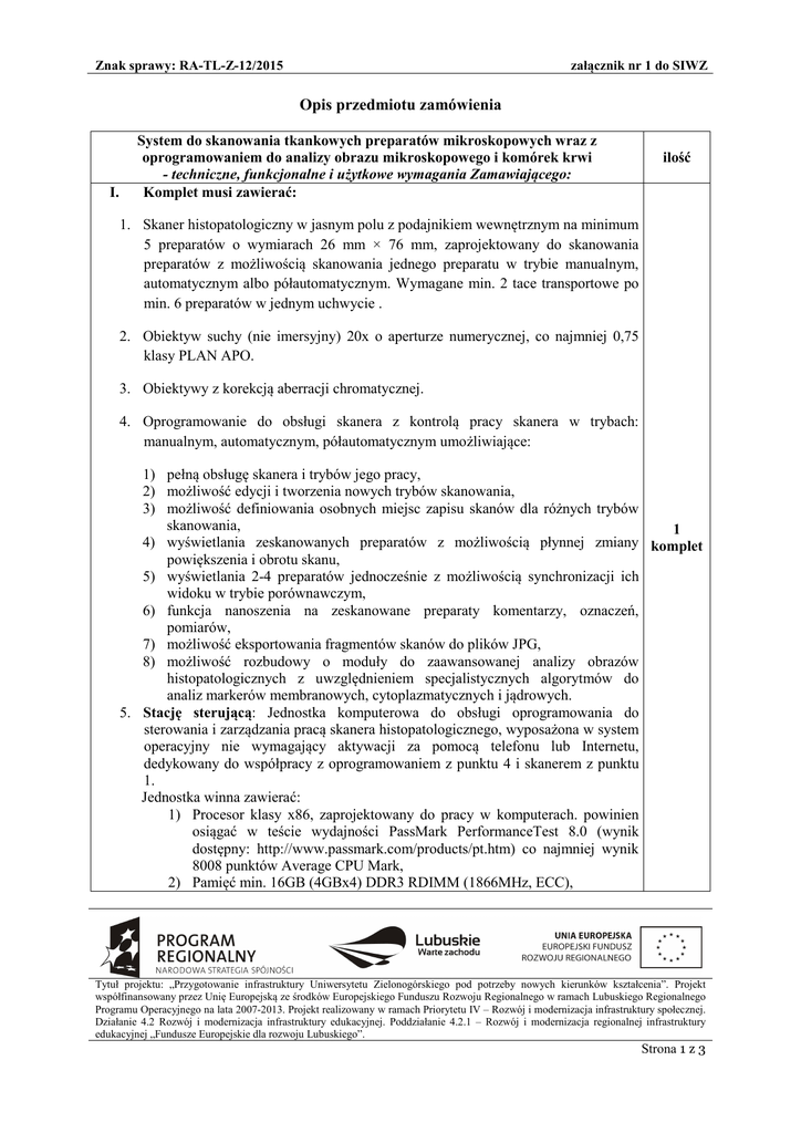 Znak sprawy: RA-TL-Z-12/2015 załącznik nr 1 do SIWZ Opis przedmiotu zamówienia I. System do skanowania tkankowych preparatów mikroskopowych wraz z oprogramowaniem do analizy obrazu mikroskopowego i komórek krwi - techniczne, funkcjonalne i użytkowe wymagania Zamawiającego: Komplet musi zawierać: ilość 1. Skaner histopatologiczny w jasnym polu z podajnikiem wewnętrznym na minimum 5 preparatów o wymiarach 26 mm × 76 mm, zaprojektowany do skanowania preparatów z możliwością skanowania jednego preparatu w trybie manualnym, automatycznym albo półautomatycznym. Wymagane min. 2 tace transportowe po min. 6 preparatów w jednym uchwycie . 2. Obiektyw suchy (nie imersyjny) 20x o aperturze numerycznej, co najmniej 0,75 klasy PLAN APO. 3. Obiektywy z korekcją aberracji chromatycznej. 4. Oprogramowanie do obsługi skanera z kontrolą pracy skanera w trybach: manualnym, automatycznym, półautomatycznym umożliwiające: 1) pełną obsługę skanera i trybów jego pracy, 2) możliwość edycji i tworzenia nowych trybów skanowania, 3) możliwość definiowania osobnych miejsc zapisu skanów dla różnych trybów skanowania, 1 4) wyświetlania zeskanowanych preparatów z możliwością płynnej zmiany komplet powiększenia i obrotu skanu, 5) wyświetlania 2-4 preparatów jednocześnie z możliwością synchronizacji ich widoku w trybie porównawczym, 6) funkcja nanoszenia na zeskanowane preparaty komentarzy, oznaczeń, pomiarów, 7) możliwość eksportowania fragmentów skanów do plików JPG, 8) możliwość rozbudowy o moduły do zaawansowanej analizy obrazów histopatologicznych z uwzględnieniem specjalistycznych algorytmów do analiz markerów membranowych, cytoplazmatycznych i jądrowych. 5. Stację sterującą: Jednostka komputerowa do obsługi oprogramowania do sterowania i zarządzania pracą skanera histopatologicznego, wyposażona w system operacyjny nie wymagający aktywacji za pomocą telefonu lub Internetu, dedykowany do współpracy z oprogramowaniem z punktu 4 i skanerem z punktu 1. Jednostka winna zawierać: 1) Procesor klasy x86, zaprojektowany do pracy w komputerach. powinien osiągać w teście wydajności PassMark PerformanceTest 8.0 (wynik dostępny: http://www.passmark.com/products/pt.htm) co najmniej wynik 8008 punktów Average CPU Mark, 2) Pamięć min. 16GB (4GBx4) DDR3 RDIMM (1866MHz, ECC), Tytuł projektu: „Przygotowanie infrastruktury Uniwersytetu Zielonogórskiego pod potrzeby nowych kierunków kształcenia”. Projekt współfinansowany przez Unię Europejską ze środków Europejskiego Funduszu Rozwoju Regionalnego w ramach Lubuskiego Regionalnego Programu Operacyjnego na lata 2007-2013. Projekt realizowany w ramach Priorytetu IV – Rozwój i modernizacja infrastruktury społecznej. Działanie 4.2 Rozwój i modernizacja infrastruktury edukacyjnej. Poddziałanie 4.2.1 – Rozwój i modernizacja regionalnej infrastruktury edukacyjnej „Fundusze Europejskie dla rozwoju Lubuskiego”. Strona 1 z 3 Znak sprawy: RA-TL-Z-12/2015 załącznik nr 1 do SIWZ 3) Pamięć dyskowa: min. 1TB, 4) Karta graficzna min. 1GB RAM, niskoprofilowa, PCI Express dedykowana do pracy w oprogramowaniu CAD i aplikacjach do wizualizacji, wyposażona w 1xDVI-I Dual Link oraz 1x DisplayPort, Rodzaj pamięci RAM - DDR3; Rozdzielczość: 2560x1600, 3840x2160, Obsługiwane standardy: DirectX 11, OpenGl 4.3’, 5) Karta sieciowa Gigabit Ethernet, 6) Klawiatura, 7) Mysz laserowa. 6. Wyświetlacz stacji: Ekran LCD-LED o przekątnej min 24” o parametrach: 1) rozm. plamki max. 0,277mm, 2) Jasność / Kontrast min 250 CD/m2 / min. 1000:1, 3) Czas reakcji matrycy: max 8 ms., 4) Rozdzielczość: min. 1920x1080, 5) Regulacja: pochylenia i obrotu, 6) Wbudowane złącza: DVI-D, Display-Port, min. 2 złącza USB 2.0. 7. Oprogramowanie do analizy obrazu krwi: 1) Funkcja automatycznego wykrywania komórek krwi w obrazie mikroskopowym, 2) Funkcja pre-klasyfikacji komórek krwi 3) Funkcja rozróżniania i zliczania: leukocytów; erytrocytów; trombocytów, 4) Możliwość wykonywania pomiarów geometrycznych badanych obiektów, 5) Możliwość nanoszenia adnotacji na przechwyconym obrazie mikroskopowym, 6) Funkcja generowania raportów, 7) Możliwość tworzenia indywidualnych szablonów generowanych raportów, 8) Minimalne wymagania do zawartości raportu: nazwa laboratorium, dane pacjenta; WBC Differential Count; krzywa Price-Jones , identyfikacja erytrocytów po: rozmiarze, kolorze, kształcie, 9) Możliwość zapisywania i eksportowania raportów w formatach: PDF; DOC; XLS; JPEG. 10) Możliwość prezentowania raportów w postaci histogramów i tabel, 11) Możliwość tworzenia bazy danych obrazów mikroskopowych, 12) Możliwość integracji oprogramowania z systemami laboratoryjnymi LIS i szpitalnymi HIS. 8. Stacja robocza do analizy obrazu krwi: Procesor min. Procesor klasy x86, zaprojektowany do pracy w komputerach. powinien osiągać w teście wydajności PassMark PerformanceTest 8.0 (wynik dostępny: http://www.passmark.com/products/pt.htm) co najmniej wynik 9372 punktów Average CPU Mark; RAM 16GB; dysk twardy min. 1TB; karta video: PCI-E 512 MB; klawiatura i mysz LCD; min. 23”; rozdzielczość 1920x1980; Złącza DVI; USB 2.0 Hub. Kontrast 1000:1; Jasność 400 cd/m2. II. Metoda skanowania: Tryb skanowania liniowy - liniowy sensor skanujący TDI (Time Delay Integration). Bez konieczności wykonywania dla skanowanych preparatów stichingu czyli łączenia w płaszczyźnie X,Y kolejnych pojedynczych fragmentów skanowanego Tytuł projektu: „Przygotowanie infrastruktury Uniwersytetu Zielonogórskiego pod potrzeby nowych kierunków kształcenia”. Projekt współfinansowany przez Unię Europejską ze środków Europejskiego Funduszu Rozwoju Regionalnego w ramach Lubuskiego Regionalnego Programu Operacyjnego na lata 2007-2013. Projekt realizowany w ramach Priorytetu IV – Rozwój i modernizacja infrastruktury społecznej. Działanie 4.2 Rozwój i modernizacja infrastruktury edukacyjne