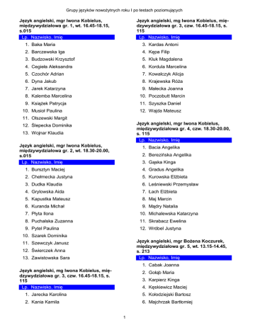 Grupy języków nowożytnych roku I po testach poziomujących Język angielski, mgr Iwona Kobielus, międzywydziałowa gr. 1, wt. 16.45-18.15, s.015 Lp. Nazwisko, Imię Język angielski, mg Iwona Kobielus, międzywydziałowa gr. 3, czw. 16.45-18.15, s. 115 Lp. Nazwisko, Imię 1. Baka Maria 3. Kardas Antoni 2. Barczewska Iga 4. Kępa Filip 3. Budzowski Krzysztof 5. Kluk Magdalena 4. Cegieła Aleksandra 6. Kordula Marcelina 5. Czochór Adrian 7. Kowalczyk Alicja 6. Dyna Jakub 8. Krajewska Róża 7. Jarek Katarzyna 9. Małecka Joanna 8. Kalemba Marcelina 10. Poczobutt Marcin 9. Książek Patrycja 11. Szyszka Daniel 10. Musioł Paulina 12. Wajda Mateusz 11. Olszewski Margit Język angielski, mgr Iwona Kobielus, międzywydziałowa gr. 4, czw. 18.30-20.00, s. 115 Lp. Nazwisko, Imię 12. Ślepecka Dominika 13. Wojnar Klaudia Język angielski, mgr Iwona Kobielus, międzywydziałowa gr. 2, wt. 18.30-20.00, s.015 Lp. Nazwisko, Imię 1. Bacia Angelika 2. Berezińska Angelika 3. Gąska Kinga 1. Bursztyn Maciej 4. Gradus Angelika 2. Chełmecka Justyna 5. Kurowska Elżbieta 3. Dudka Klaudia 6. Leśniewski Przemysław 4. Grylowska Aida 7. Łach Elżbieta 5. Kapustka Mateusz 8. Maj Marcin 6. Kuranda Michał 9. Mądry Natalia 7. Płyta Ilona 10. Michalewska Katarzyna 8. Puchalska Zuzanna 11. Skrabacz Ewelina 9. Pytel Paulina 12. Wróbel Justyna 10. Szarek Dominika Język angielski, mgr Bożena Koczurek, międzywydziałowa gr. 5, wt. 13.15-14.45, s. 213 Lp. Nazwisko, Imię 11. Szewczyk Janusz 12. Świerczek Anna 13. Zawistowska Sara 1. Cabak Joanna Język angielski, mg Iwona Kobielus, międzywydziałowa gr. 3, czw. 16.45-18.15, s. 115 Lp. Nazwisko, Imię 2. Gołąb Maria 3. Karpierz Kinga 4. Kęskiewicz Maciej 1. Jarecka Karolina 5. Kołodziejski Bartosz 2. Kania Kamila 6. Majchrzak Bartłomiej 1 Grupy języków nowożytnych roku I po testach poziomujących Język angielski, mgr Bożena Koczurek, międzywydziałowa gr. 5, wt. 13.15-14.45, s. 213 Lp. Nazwisko, Imię Język angielski, mgr Tomasz Kniaź, międzywydziałowa gr. 7, wt. 15.00-16.30, s. 301 Lp. Nazwisko, Imię 7. Michalski Piotr 8. Putyra Magdalena 8. Płazińska Magdalena 9. Rogala Aleksandra 9. Siurnicka Aleksandra 10. Smyth Monika 10. Suder Dominika 11. Spyrka Arkadiusz 11. Świegoda Konrad 12. Śliz Justyna 12. Tłuszcz Katarzyna 13. Wilkos Patrycja 13. Wydro Wioletta Język angielski, mgr Bożena Koczurek, międzywydziałowa gr. 6, wt. 15.00-16.30, s. 213 Lp. Nazwisko, Imię 1. Adamczyk Joanna 2. Bogacz Eliza 3. Kiełb Izabela 4. Kołodziejczyk Natalia 5. Kozłowska Agnieszka 6. Krzyszycha Magdalena 7. Kubaszowska Edyta 8. Kulig Kinga 9. Malczyk Kornelia 10. Miętus Renata 11. Muszyńska Anna 12. Radwańska Katarzyna 13. Radwańska Katarzyna 14. Sobarnia Michał Język angielski, mgr Tomasz Kniaź, międzywydziałowa gr. 7, wt. 15.00-16.30, s. 301 Lp. Nazwisko, Imię 1. Bednarska Izabella 2. Bubula Sylwia 3. Grzesiak Michał 4. Klimczyk Agnieszka 5. Lisowski Filip 6. Mazurczyk Anna 7. Pamuła Dominika 2