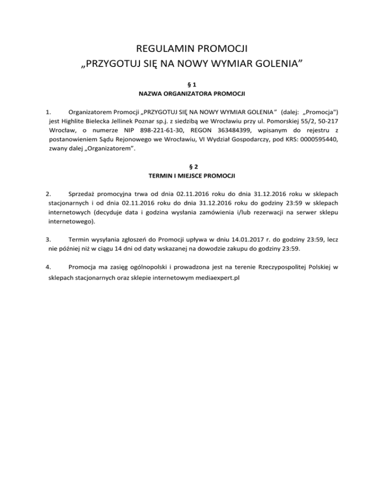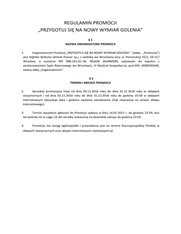 REGULAMIN PROMOCJI „PRZYGOTUJ SIĘ NA NOWY WYMIAR GOLENIA” §1 NAZWA ORGANIZATORA PROMOCJI 1. Organizatorem Promocji „PRZYGOTUJ SIĘ NA NOWY WYMIAR GOLENIA ” (dalej: „Promocja") jest Highlite Bielecka Jellinek Poznar sp.j. z siedzibą we Wrocławiu przy ul. Pomorskiej 55/2, 50-217 Wrocław, o numerze NIP 898-221-61-30, REGON 363484399, wpisanym do rejestru z postanowieniem Sądu Rejonowego we Wrocławiu, VI Wydział Gospodarczy, pod KRS: 0000595440, zwany dalej „Organizatorem”. §2 TERMIN I MIEJSCE PROMOCJI 2. Sprzedaż promocyjna trwa od dnia 02.11.2016 roku do dnia 31.12.2016 roku w sklepach stacjonarnych i od dnia 02.11.2016 roku do dnia 31.12.2016 roku do godziny 23:59 w sklepach internetowych (decyduje data i godzina wysłania zamówienia i/lub rezerwacji na serwer sklepu internetowego). 3. Termin wysyłania zgłoszeń do Promocji upływa w dniu 14.01.2017 r. do godziny 23:59, lecz nie później niż w ciągu 14 dni od daty wskazanej na dowodzie zakupu do godziny 23:59. 4. Promocja ma zasięg ogólnopolski i prowadzona jest na terenie Rzeczypospolitej Polskiej w sklepach stacjonarnych oraz sklepie internetowym mediaexpert.pl §3 PRODUKTY OBJĘTE SPRZEDAŻĄ PROMOCYJNĄ 5. Sprzedażą promocyjną objęte są wybrane produkty spośród maszynek do włosów, zestawów do osobistej pielęgnacji, golarek męskich, trymerów do brody, do ciała i higienicznych oraz szczoteczek do zębów Remington (dalej: „Produkty promocyjne"). Lista produktów promocyjnych stanowi Załącznik nr 2. §4 UCZESTNICY PROMOCJI 6. Uczestnikiem Promocji może być każda pełnoletnia osoba fizyczna posiadająca pełną zdolność do czynności prawnej oraz każda osoba fizyczna, która ukończyła 13 rok życia za zgodą przedstawiciela ustawowego (dalej „Uczestnik”). W przypadku wątpliwości co do wieku Uczestnika, Organizator może poprosić o okazanie dokumentu potwierdzającego wiek Uczestnika pod warunkiem nie wydania nagrody. 7. W Promocji nie mogą brać udziału pracownicy Organizatora, Loyal Concept i Spectrum Brands Poland Sp. z o.o. oraz członkowie ich rodzin. Przez członków rodziny rozumie się: rodziców, dzieci, małżonków i rodzeństwo, przy czym zastrzeżenie dotyczy osób, które brały bezpośredni udział przy realizacji Promocji oraz tych, które pracowały nad projektem i wdrożeniem Promocji. Organizator zwolniony jest z pobierania oświadczeń w tym zakresie. §5 DANE OSOBOWE 8. Dane osobowe Uczestników będą przetwarzane w celu przeprowadzenia niniejszej Promocji oraz wydania Gratisów przez Highlite Bielecka Jellinek Poznar sp.j. z siedzibą we Wrocławiu przy ul. Pomorskiej 55/2, 50-217 Wrocław i Loyal Concept Sp. z o.o. z siedzibą w Warszawie przy ul. Tużyckiej 8 lok. 6, 03-683 Warszawa. Administratorem danych osobowych jest Spectrum Brands Poland sp. z o.o. z siedzibą w Warszawie, przy ul. Bitwy Warszawskiej 1920r. 7a, 02-366 Warszawa. Podanie danych jest dobrowolne, lecz niezbędne dla potrzeb przeprowadzenia Promocji i wydania Gratisów. Dane osobowe Uczestników – po wyrażeniu przez nich zgody, będą również przetwarzane do celów marketingowych przez Spectrum Brands Poland oraz Highlite Bielecka Jellinek Pozar sp.j. zgodnie z ustawą z dn. 29.08.1997 r. o ochronie danych osobowych (tekst jedn. Dz.U. z 2002, Nr 101, poz. 926 z późn. zm.). Uczestnikom Promocji przysługuje prawo dostępu do treści swoich danych oraz ich poprawiania. §6 NAGRODY W PROMOCJI 9. W Promocji przewidziano gratisy (dalej: „Gratisy”) za zakup produktu Remington objętego Promocją: powerbank VARTA o pojemności 2600 mAh o wartości 42,99 PLN brutto każdy. Liczba Gratisów jest ograniczona do 2000 sztuk (słownie: dwa tysiące sztuk). 10. W przypadku wyczerpania puli Gratisów Organizator poinformuje o tym na stronie www.nowywymiargolenia.pl w zakładce Weź udział. §7 WARUNKI UCZESTNICTWA W PROMOCJI 11. Podstawą do wzięcia udziału w Promocji może być jedynie zakup produktów nowych, dostępnych tylko i wyłącznie w sklepach określonych w punkcie 4 niniejszego Regulaminu, w stosunku do których gwarantem jest Spectrum Brands Poland Sp. z o.o., oraz w terminie, o którym jest mowa w punkcie 2 niniejszego Regulaminu. 12. Aby wziąć udział w Promocji Uczestnik zobowiązany jest spełnić łącznie następujące warunki: 12.1. Dokonać w terminie od dnia 02.11.2016 r. do dnia 31.12.2016 r. zakupu produktu spośród wybranych maszynek do włosów, zestawów do osobistej pielęgnacji, golarek męskich, trymerów do brody, do ciała i higienicznych oraz szczoteczek do zębów marki Remington. Listę Produktów Promocyjnych stanowi Załącznik nr 2. Zakup Produktów Promocyjnych musi być udokumentowany jednym dowodem zakupu (paragon lub faktura VAT), upoważniającym do wysłania jednego Zgłoszenia do Promocji, 12.2. W ciągu 14 dni od daty wskazanej na dowodzie zakupu, ale nie później niż do 14.01.2017 roku do godziny 23:59, przekazać swoje zgłoszenie poprzez wypełnienie formularza rejestracyjnego w wersji elektronicznej na stronie www.nowywymiargolenia.pl (w tym dodanie zdjęć lub skanów wyciętego z opakowania produktu kodu EAN i paragonu lub faktury VAT potwierdzającej zakup) oraz kliknięcie w link aktywacyjny w mailu weryfikacyjnym. 13. W skład prawidłowego Zgłoszenia do Promocji wchodzi: a) Kopia, zdjęcie lub skan dowodu zakupu Produktu Promocyjnego (faktura VAT lub paragon fiskalny), oraz b) Oryginalny kod kreskowy wycięty z opakowania Produktu Promocyjnego (lub jego zdjęcie lub skan), oraz c) Kompletnie wypełniony, w formie elektronicznej, formularz rejestracyjny w Promocji „PRZYGOTUJ SIĘ NA NOWY WYMIAR GOLENIA”, który dostępny jest na stronie www.nowywymiargolenia.pl, a którego wzór stanowi Załącznik nr 1. 14. Dokumenty, o których mowa powyżej powinny zostać wysłane na adres Organizatora listem poleconym lub przesyłką kurierską w ciągu 14 dni od daty zakupu produktów, lecz nie później niż do 15.01.2017 roku (