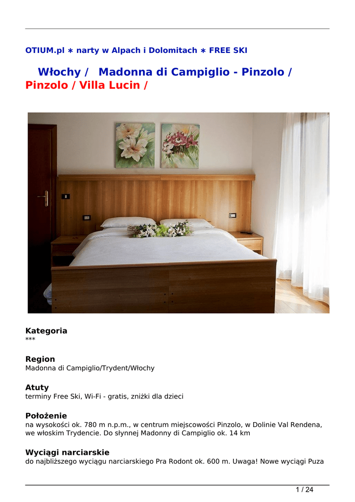 OTIUM.pl ∗ narty w Alpach i Dolomitach ∗ FREE SKI Włochy / Madonna di Campiglio - Pinzolo / Pinzolo / Villa Lucin / Kategoria *** Region Madonna di Campiglio/Trydent/Włochy Atuty terminy Free Ski, Wi-Fi - gratis, zniżki dla dzieci Położenie na wysokości ok. 780 m n.p.m., w centrum miejscowości Pinzolo, w Dolinie Val Rendena, we włoskim Trydencie. Do słynnej Madonny di Campiglio ok. 14 km Wyciągi narciarskie do najbliższego wyciągu narciarskiego Pra Rodont ok. 600 m. Uwaga! Nowe wyciągi Puza 1 / 24 dai Fo' - Patascoss łączące Pinzolo z Madonna di Campiglio (łącznie ok. 150 km tras narciarskich - Pinzolo-Madonna di Campiglio - Folgarida-Marilleva). Przystanek skibusa (za opłatą ok. 10 euro/os/tydz.) znajduje się ok. 50 m od obiektu Wyposażenie recepcja, winda, sala śniadaniowa, sala TV, przechowalnia sprzętu narciarskiego, parking (gratis, ograniczona ilość miejsc). Obiekt posiada 3 piętra Internet tak (Wi-Fi, gratis) Karty kredytowe tak (Visa, Mastercard) Szkolenie narciarskie Madonna di Campiglio w terminach 14.01-26.02.2017 proponujemy (dodatkowo płatne) 6-dniowe grupowe szkolenia narciarskie na różnych poziomach zaawansowania dla dzieci od 4 lat, młodzieży i dorosłych - 2,5 h dziennie i dla jeżdżących w stopniu min. podstawowym dzieci 6-12 lat 4,5 h dziennie (Uwaga! w regionie Madonna di Campiglio nie prowadzimy szkoleń na poziomie 0). Fakultatywna dopłata przy rezerwacji. Szczegóły i ceny na stronie www Szkolenia narciarskie - info Pokoje (ok. 15 m<sup>2</sup>), obiekt dysponuje dwuosobowymi pokojami z możliwością jednej lub dwóch dostawek; łazienka z WC, suszarka do włosów; TV-sat, telefon. Większość pokoi posiada balkon Wyżywienie śniadania w formie bufetu Pieski nie Kategoria lokalna *** Świadczenia 7 noclegów (Uwaga! w terminie 17-23.12.2016 - oferta z dojazdem własnym, 6 noclegów; w terminie 17-22.12.2016 - oferta z przejazdem autokarem, 5 noclegów, wykwaterowanie 22.12 ok. 18.00), wyżywienie 1 x dziennie wg opisu, ubezpieczenie Signal Iduna Bezpieczne Podróże (w tym rekreacyjne uprawianie narciarstwa zjazdowego, biegowego lub snowboardu na oznakowanych trasach zjazdowych) - KL, KR, NNW i bagażu, opieka włoskiego kontrahenta Uwaga Zalecamy dodatkowe ubezpieczenie OC/SS (w tym sprzęt sportowy) Signal Iduna - 35 2 / 24 zł/os/pobyt Obowiązkowa opłata na miejscu taksa klimatyczna ok. 1-2,5 euro/os./dzień Zakwaterowanie przyjazd - od godz. 15.00, wyjazd - do godz. 10.00 Autokar przejazd komfortowym autokarem (klimatyzacja, WC, bar, video), warunki przewozu, cennik, program i rozkład jazdy na stronie organizatora (Uwaga! W terminie 16-23.12.2016 tylko dla pobytów 5-dniowych) Zniżki (na dostawkach) i dopłaty dzieci do 7,9 lat - gratis, dzieci 8-14,9 lat - 50% zniżki, od 15 lat - 20% zniżki. Pokoje jednoosobowe (na zapytanie) zgodnie z cenami w systemie. Dopłata do ubezpieczenia od kosztów rezygnacji 2,4% Oferta Free Ski w terminach 03-17.12.2016 i 18.03-01.04.2017 karnet 6-dniowy Superskirama Adamello Brenta w cenie, w terminach 17-22.12.2016 (oferta autokarowa) i 17-23.12.2016 karnet 5-dniowy Skiarea Campiglio Dolomiti di Brenta w cenie. Uwaga! Wszystkie karnety odbiera się w kasach w Madonna di Campiglio. Nie ma możliwości odbioru karnetów w kasach w Pinzolo Uwaga Na podstawie Vouchera we wszystkich kasach w Madonna di Campiglio zniżka 5% dla Klientów Otium na karnety typu Madonna di Campiglio lub Skiarea Campiglio Dolomiti di Brenta (Madonna, Pinzolo, Folgarida-Marilleva, Pejo). Uwaga! Zniżka nie obowiązuje w kasach w Pinzolo Promocje Niezmienność ceny - dla rezerwacji potwierdzonych do 30.11.2016. Oferta Early Booking 3% zniżki na rezerwacje potwierdzone do 30.11.2016. Ceny w systemie uwzględniają promocję data skąd pobyt opis cena / os 10.03.2017 Bielsko - Biała 8 dni Pokój: Pokój 2 osobowy Wyżywienie: śniadania 1369 zł / os 10.03.2017 Bielsko - Biała 8 dni Pokój: Pokój 2 osobowy + dostawką Wyżywienie: śniadania 1369 zł / os 3 / 24 10.03.2017 Bielsko - Biała 8 dni Pokój: Pokój 2 osobowy + 2 dostawki Wyżywienie: śniadania 1369 zł / os 10.03.2017 Katowice 8 dni Pokój: Pokój 2 osobowy Wyżywienie: śniadania 1398 zł / os 10.03.2017 Katowice 8 dni Pokój: Pokój 2 osobowy + dostawką Wyżywienie: śniadania 1398 zł / os 10.03.2017 Katowice 8 dni Pokój: Pokój 2 osobowy + 2 dostawki Wyżywienie: śniadania 1398 zł / os 10.03.2017 Częstochowa 8 dni Pokój: Pokój 2 osobowy Wyżywienie: śniadania 1408 zł / os 10.03.2017 Częstochowa 8 dni Pokój: Pokój 2 osobowy + dostawką Wyżywienie: śniadania 1408 zł / os 10.03.2017 Częstochowa 8 dni Pokój: Pokój 2 osobowy + 2 dostawki Wyżywienie: śniadania 1408 zł / os 10.03.2017 Warszawa 8 dni Pokój: Pokój 2 osobowy Wyżywienie: śniadania 1428 zł / os 10.03.2017 Łódź 8 dni Pokój: Pokój 2 osobowy Wyżywienie: śniadania 1428 zł / os 10.03.2017 Piotrków Trybunalski 8 dni Pokój: Pokój 2 osobowy Wyżywienie: śniadania 1428 zł / os 4 / 24 10.03.2017 Piotrków Trybunalski 8 dni Pokój: Pokój 2 osobowy + dostawką Wyżywienie: śniadania 1428 zł / os 10.03.2017 Warszawa 8 dni Pokój: Pokój 2 osobowy + dostawką Wyżywienie: śniadania 1428 zł / os 10.03.2017 Łódź 8 dni Pokój: Pokój 2 osobowy + dostawką Wyżywienie: śniadania 1428 zł / os 10.03.2017 Piotrków Trybunalski 8 dni Pokój: Pokój 2 osobowy + 2 dostawki Wyżywienie: śniadania 1428 zł / os 10.03.2017 Warszawa 8 dni Pokój: Pokój 2 osobowy + 2 dostawki Wyżywienie: śniadania 1428 zł / os 10.03.2017 Łódź 8 dni Pokój: Pokój 2 osobowy + 2 dostawki Wyżywienie: śniadania 1428 zł / os 10.03.2017 Gdańsk 8 dni Pokój: Pokój 2 osobowy Wyżywienie: śniadania 1518 zł / os 10.03.2017 Gdańsk 8 dni Pokój: Pokój 2 osobowy + dostawką Wyżywienie: śniadania 1518 zł / os 10.03.2017 Gdańsk 8 dni Pokój: Pokój 2 osobowy + 2 dostawki Wyżywienie: śniadania 1518 zł / os 10.03.2017 Bielsko - Biała 8 dni Pokój: Pokój 1 osobowy Wyżywieni
