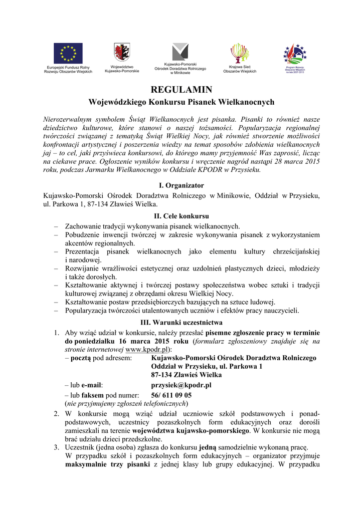 Europejski Fundusz Rolny Rozwoju Obszarów Wiejskich Województwo Kujawsko-Pomorskie Kujawsko-Pomorski Ośrodek Doradztwa Rolniczego w Minikowie Krajowa Sieć Obszarów Wiejskich REGULAMIN Wojewódzkiego Konkursu Pisanek Wielkanocnych Nierozerwalnym symbolem Świąt Wielkanocnych jest pisanka. Pisanki to również nasze dziedzictwo kulturowe, które stanowi o naszej tożsamości. Popularyzacja regionalnej twórczości związanej z tematyką Świąt Wielkiej Nocy, jak również stworzenie możliwości konfrontacji artystycznej i poszerzenia wiedzy na temat sposobów zdobienia wielkanocnych jaj – to cel, jaki przyświeca konkursowi, do którego mamy przyjemność Was zaprosić, licząc na ciekawe prace. Ogłoszenie wyników konkursu i wręczenie nagród nastąpi 28 marca 2015 roku, podczas Jarmarku Wielkanocnego w Oddziale KPODR w Przysieku. I. Organizator Kujawsko-Pomorski Ośrodek Doradztwa Rolniczego w Minikowie, Oddział w Przysieku, ul. Parkowa 1, 87-134 Zławieś Wielka. – – – – – – – II. Cele konkursu Zachowanie tradycji wykonywania pisanek wielkanocnych. Pobudzenie inwencji twórczej w zakresie wykonywania pisanek z wykorzystaniem akcentów regionalnych. Prezentacja pisanek wielkanocnych jako elementu kultury chrześcijańskiej i narodowej. Rozwijanie wrażliwości estetycznej oraz uzdolnień plastycznych dzieci, młodzieży i także dorosłych. Kształtowanie aktywnej i twórczej postawy społeczeństwa wobec sztuki i tradycji kulturowej związanej z obrzędami okresu Wielkiej Nocy. Kształtowanie postaw przedsiębiorczych bazujących na sztuce ludowej. Popularyzacja twórczości utalentowanych uczniów i efektów pracy nauczycieli. III. Warunki uczestnictwa 1. Aby wziąć udział w konkursie, należy przesłać pisemne zgłoszenie pracy w terminie do poniedziałku 16 marca 2015 roku (formularz zgłoszeniowy znajduje się na stronie internetowej www.kpodr.pl): – pocztą pod adresem: Kujawsko-Pomorski Ośrodek Doradztwa Rolniczego Oddział w Przysieku, ul. Parkowa 1 87-134 Zławieś Wielka – lub e-mail: [email protected] – lub faksem pod numer: 56/ 611 09 05 (nie przyjmujemy zgłoszeń telefonicznych) 2. W konkursie mogą wziąć udział uczniowie szkół podstawowych i ponadpodstawowych, uczestnicy pozaszkolnych form edukacyjnych oraz dorośli zamieszkali na terenie województwa kujawsko-pomorskiego. W konkursie nie mogą brać udziału dzieci przedszkolne. 3. Uczestnik (jedna osoba) zgłasza do konkursu jedną samodzielnie wykonaną pracę. W przypadku szkół i pozaszkolnych form edukacyjnych – organizator przyjmuje maksymalnie trzy pisanki z jednej klasy lub grupy edukacyjnej. W przypadku zespołów szkół dotyczy to każdej ze szkół wchodzących w skład zespołu. Zaleca się, aby przed przystąpieniem do etapu wojewódzkiego zrobić wstępne eliminacje na poziomie szkoły lub grupy edukacyjnej. 4. Pisankę należy opatrzyć w metryczkę zawierającą następujące dane: imię i nazwisko, adres, telefon, kategoria wiekowa. 5. Pisankę należy dostarczyć w terminie do 20 marca 2015 roku (piątek), do godziny 1700, do siedziby KPODR w Przysieku. 6. Pisanki niezgłoszone lub niedostarczone w wymaganym terminie nie będą brały udziału w konkursie. 7. Wystawiana w konkursie pisanka nie może być surowym jajem. 8. Za zabezpieczenie pisanki podczas transportu odpowiada uczestnik konkursu. Pisanki uszkodzone nie wezmą udziału w konkursie. 9. Prace należy odebrać w dniu 28 marca 2015 roku, po zakończeniu Jarmarku Wielkanocnego (około godz. 14). Pisanki nie odebrane w terminie 7 dni po tej dacie zostaną zniszczone. 10. Pisemne zgłoszenie jest równoznaczne z wyrażeniem zgody przez uczestnika na przetwarzanie danych osobowych wyłącznie do celów konkursu (w tym publikacji prasowej). Zgłoszenie osoby, która nie ukończyła 18 lat, musi być podpisane przez jej opiekuna (rodzica). IV. Ocena konkursowa 1. Kryteria oceny: – walory plastyczne (kompozycja, kolorystyka, technika wykonania), – zastosowanie motywów regionalnych i religijnych, – oryginalność pomysłu, dobór i wykorzystanie materiałów (preferowane naturalne), – samodzielność wykonania i wkład pracy. 2. Prace oceniane będą przez specjalnie powołaną Komisję Konkursową, w trzech kategoriach wiekowych: 1) uczniowie szkół podstawowych 2) uczniowie szkół ponadpodstawowych 3) dorośli 3. Trzy najlepsze prace w każdej kategorii zostaną nagrodzone. 4. Prace niezgodne z regulaminem konkursu nie będą oceniane. 5. Komisja zastrzega sobie prawo niedopuszczenia do konkursu prac o niskim poziomie artystycznym. V. Rozstrzygnięcie konkursu 1. Rozstrzygnięcie konkursu i ogłoszenie wyników odbędzie się w Oddziale KPODR w Przysieku, w dniu 28 marca 2015 roku (sobota) o godz. 1015, podczas Jarmarku Wielkanocnego. 2. Wyniki konkursu zawierające dane nagrodzonych autorów zostaną podane do publicznej wiadomości w mediach i na stronie internetowej www.kpodr.pl. Informacje związane z konkursem można uzyskać na stronie www.kpodr.pl lub pod numerami telefonu: 56 611 09 31 lub 56 611 09 04. Serdecznie zapraszamy do udziału w konkursie!