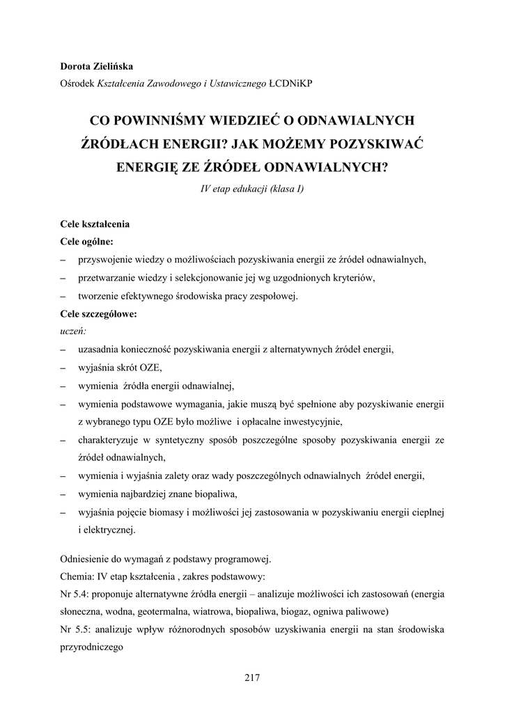 Dorota Zielińska Ośrodek Kształcenia Zawodowego i Ustawicznego ŁCDNiKP CO POWINNIŚMY WIEDZIEĆ O ODNAWIALNYCH ŹRÓDŁACH ENERGII? JAK MOŻEMY POZYSKIWAĆ ENERGIĘ ZE ŹRÓDEŁ ODNAWIALNYCH? IV etap edukacji (klasa I) Cele kształcenia Cele ogólne: przyswojenie wiedzy o możliwościach pozyskiwania energii ze źródeł odnawialnych, przetwarzanie wiedzy i selekcjonowanie jej wg uzgodnionych kryteriów, tworzenie efektywnego środowiska pracy zespołowej. Cele szczegółowe: uczeń: uzasadnia konieczność pozyskiwania energii z alternatywnych źródeł energii, wyjaśnia skrót OZE, wymienia źródła energii odnawialnej, wymienia podstawowe wymagania, jakie muszą być spełnione aby pozyskiwanie energii z wybranego typu OZE było możliwe i opłacalne inwestycyjnie, charakteryzuje w syntetyczny sposób poszczególne sposoby pozyskiwania energii ze źródeł odnawialnych, wymienia i wyjaśnia zalety oraz wady poszczególnych odnawialnych źródeł energii, wymienia najbardziej znane biopaliwa, wyjaśnia pojęcie biomasy i możliwości jej zastosowania w pozyskiwaniu energii cieplnej i elektrycznej. Odniesienie do wymagań z podstawy programowej. Chemia: IV etap kształcenia , zakres podstawowy: Nr 5.4: proponuje alternatywne źródła energii – analizuje możliwości ich zastosowań (energia słoneczna, wodna, geotermalna, wiatrowa, biopaliwa, biogaz, ogniwa paliwowe) Nr 5.5: analizuje wpływ różnorodnych sposobów uzyskiwania energii na stan środowiska przyrodniczego 217 Metody kształcenia: pogadanka, składanka ekspercka. Formy pracy: praca grupowa i zbiorowa. Czas pracy: 1 godzina dydaktyczna (2 godziny w wersji rozszerzonej) Środki dydaktyczne: karty pracy, materiały źródłowe, prezentacja multimedialna/ lub film o OZE/ lub wydruk materiałów z prezentacji [lub 4. modele OZE] Przebieg zajęć: I. Część organizacyjna (sprawdzenie obecności, zapoznanie z tematem lekcji, wyjaśnienie, na czym będzie polegała praca na lekcji z wykorzystaniem składanki eksperckiej, podział na grupy i przydzielenie zadań) [3min] II. Część zasadnicza zajęć. 1. Nauczyciel [N] wprowadza w tematykę zajęć. 2. [N] prosi uczniów o podanie powodów dla których ludzie poszukują i rozwijają technologie pozyskiwania energii ze źródeł odnawialnych. 3. [N] pyta, czy uczniowie zaobserwowali w otoczeniu rozwój i wykorzystanie technologii pozyskiwania energii ze źródeł odnawialnych. 4. [N] prosi uczniów, aby wymienili rodzaje odnawialnych źródeł energii. 5. [N] dzieli klasę na 6 grup tematycznych: każda grupa otrzymuje materiał źródłowy i pomocniczy do pracy w zespole Gr 1: Energia wiatrowa Gr 2. Energia wodna Gr 3. Energia słoneczna Gr 4. Energia geotermalna Gr 5. Energia z biomasy i biogazu Gr 6. Ogniwa paliwowe w każdej grupie uczniowie wybierają lidera. 6. [N] wyjaśnia, na czym będzie polegała praca grupy i rolę lidera grupy (nadzoruje i koordynuje pracę grupy). 7. [N] rozdaje uczniom karty pracy. 8. Uczniowie opracowują w grupie domowej zadany temat, uczą się i rejestrują najważniejsze informacje, które staną się podstawą przekazywanej wiedzy w grupach eksperckich. [ czas 12 min] 9. [N] dzieli uczniów z grup domowych tak, by powstało 6 grup eksperckich. 218 10. Uczniowie pracują w nowych grupach eksperckich – gdzie lider grupy przekazuje wiedzę z opracowanego podtematu pozostałym uczestnikom grupy. Uczniowie uczą się i notują informacje z podtematu prezentowanego przez eksperta. [10 min. ] 11. Uczniowie wracają do grup domowych i wspólnie uczą się pozostałych podtematów od członków grupy, którzy byli w innych grupach eksperckich. [15min.] 12. [N] prosi aby przedstawiciele każdej z grupy wymienili po 2 argumenty za i przeciw (plusy i minusy) wykorzystywaniu poszczególnych źródeł energii odnawialnych. III. Część podsumowująca [5min] 13. [N] pyta uczniów, które wg nich rodzaje źródeł energii odnawialnych powinny być w Polsce szczególnie rozbudowywane i doinwestowane. 14. [N] pyta uczniów, jakie korzyści (indywidualne, gospodarcze, regionalne i globalne) daje możliwość wykorzystywania odnawialnych źródeł energii. 15. [N] podsumowuje lekcję i pracę uczniów. Zadaje pracę domową. Praca domowa: Wykorzystując zasoby Internetu wyszukaj informacje o eko-samochodach (auta zasilane energią elektryczną, itp.) Podaj najważniejsze informacje (jakie auto, rodzaj wykorzystywanego paliwa/energii, prototyp/wdrożenie/faza projektowa) oraz wymień, gdzie są już wykorzystywane wskazane samochody. Pamiętaj o podaniu źródła informacji. Uwagi do realizacji zajęć. 1. Zajęcia można przeprowadzić w sali komputerowej, tak, by każdy zespół miał możliwość obejrzenia na monitorze materiałów, prezentacji lub filmów w zakresie omawianych podtematów. Możliwość wykorzystania komputerów lub tabletów w każdej grupie ułatwi prace zespołom i uatrakcyjni uczniom sposoby pozyskiwania informacji w zakresie możliwości wykorzystania OZE. 2. W przypadku możliwości prowadzenia 2-godzinnych zajęć, powinny być przygotowane materiały źródłowe wzbogacone o dodatkowe treści. 3. Na zakończenie zajęć można zaproponować uczniom przygotowanie plakatu na temat: Dlaczego powinniśmy rozwijać technologie pozyskiwania energii ze źródeł odnawialnych? 4. Do scenariusza dołączono przykładowy materiał źródłowy do jednego z podtematów „Energia geotermalna”. Nauczyciel powinien dostosować treści materiałów źródłowych do możliwości intelektualnych uczniów. 219 Załącznik nr 1 Karta pracy Odnawialne źródła energii Uzupełnij podaną tabelkę wpisując najważniejsze informacje o możliwościach pozyskiwania energii z poszczególnych źródeł odnawialnych Źródło Podstawowe informacje: - warunki i wymagania, Zalety Wady energii - dostęp do wykorzystania źródła energii, wykorzystywania źródła wykorzystywania źródła - charakterystyka sposobów pozyskiwania energii- aspekt kos