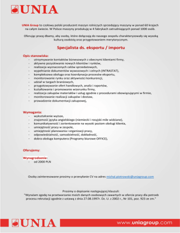UNIA Group to czołowy polski producent maszyn rolniczych sprzedający maszyny w ponad 60 krajach na całym świecie. W Polsce maszyny produkuję w 4 fabrykach zatrudniających ponad 1000 osób. Oferując pracę dbamy, aby osoby, które dołączają do naszego zespołu charakteryzowały się wysoką kulturą osobistą oraz przygotowaniem merytorycznym. Specjalista ds. eksportu / importu Opis stanowiska:             utrzymywanie kontaktów biznesowych z obecnymi klientami firmy, aktywne pozyskiwanie nowych klientów i rynków, realizacja wyznaczonych celów sprzedażowych, wypełnianie dokumentów wywozowych i celnych (INTRASTAT), kompleksowa obsługa oraz koordynacja procesów eksportu, monitorowanie rynku oraz aktywności konkurencji, udział w targach branżowych, przygotowywanie ofert handlowych, analiz i raportów, kształtowanie i promowanie wizerunku firmy, realizacja zakupów materiałów i usług zgodnie z procedurami obowiązującymi w firmie, monitorowanie realizacji zakupów i dostaw, prowadzenie dokumentacji zakupowej, Wymagania:        wykształcenie wyższe, znajomość języka angielskiego (niemiecki i rosyjski mile widziane), komunikatywność i zorientowanie na wysoki poziom obsługi klienta, umiejętność pracy w zespole, umiejętność planowania i organizacji pracy, odpowiedzialność, samodzielność, dokładność, dobra obsługa komputera (Programy biurowe OFFICE), Oferujemy: Wynagrodzenie:  od 2000 PLN Osoby zainteresowane prosimy o przesyłanie CV na adres [email protected] Prosimy o dopisanie następującej klauzuli: "Wyrażam zgodę na przetwarzanie moich danych osobowych zawartych w ofercie pracy dla potrzeb procesu rekrutacji zgodnie z ustawą z dnia 27.08.1997r. Dz. U. z 2002 r., Nr 101, poz. 923 ze zm."