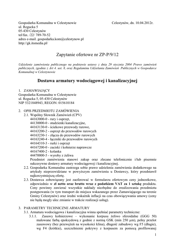 Gospodarka Komunalna w Celestynowie ul. Regucka 5 05-430 Celestynów tel/fax. /22/ 789-70-52 adres e-mail. [email protected] http://gk.itsmedia.pl/ Celestynów, dn. 10.04.2012r. Zapytanie ofertowe nr ZP-P/9/12 Udzielenie zamówienia publicznego na podstawie ustawy z dnia 29 stycznia 2004 Prawo zamówień publicznych, zgodnie z Art 4. ust. 8, oraz Regulaminu Udzielania Zamówień Publicznych w Gospodarce Komunalnej w Celestynowie Dostawa armatury wodociągowej i kanalizacyjnej 1. ZAMAWIAJĄCY Gospodarka Komunalna w Celestynowie ul. Regucka 5, 05-430 Celestynów NIP 5321848943, REGON: 015610184 2. OPIS PRZEDMIOTU ZAMÓWIENIA 2.1. Wspólny Słownik Zamówień (CPV) 44163000-0 - rury i osprzęt, 44130000-0 - studzienki kanalizacyjne, 44163130-0 - ściekowe przewody rurowe, 44163200-2 - osprzęt do przewodów rurowych 44163230-1 - złącza do przewodów rurowych 44163240-4 - łączniki do przewodów rurowych 44164310-3 - rurki i osprzęt 44167200-0 - zaciski i kołnierze naprawcze 44167400-2 - kolanka 44470000-5 - wyroby z żeliwa Przedmiot zamówienia stanowi zakup oraz zlecane telefonicznie i/lub pisemnie sukcesywne dostawy armatury wodociągowej i kanalizacyjnej. 2.2. Gospodarka Komunalna zastrzega sobie prawo udzielenia zamówienia dodatkowego na artykuły nieprzewidziane w powyższym zamówieniu u Dostawcy, który przedstawił najkorzystniejszą ofertę. 2.3. Dostawca zobowiązany jest zaoferować w formularzu ofertowym ceny jednostkowe, odpowiednio w zł netto oraz brutto wraz z podatkiem VAT za 1 sztukę produktu. Ceny powinny zawierać wszystkie nakłady niezbędne do zrealizowania przedmiotu postępowania (w tym transport do miejsca wskazanego przez Zamawiającego na terenie Gminy Celestynów) oraz średni wskaźnik inflacji na czas obowiązywania umowy (ceny nie będą mogły ulec zmianie w trakcie realizacji usług). 3. PARAMETRY TECHNICZNE ARMATURY 3.1. Armatura wodociągowa i kanalizacyjna winna spełniać parametry techniczne: 3.1.1. Zasuwy kołnierzowe – wykonanie korpusu żeliwo sferoidalne (GGG 50) malowane farbą epoksydową z godnie z normą GSK (min 250 µm), pełny przelot zasuwowy (bez przewężeń na wysokości klina), długość zabudowy wg F5 (długie), wg F4 (krótkie), uszczelnienie pokrywy z korpusem za pomocą profilowanej 1 uszczelki zagłębionej w korpusie, śruby łączące korpus z pokrywą wpuszczane i zalewane masą na gorąco, trzpień ze stali nierdzewnej walcowany na zimno, potrójne uszczelnienia trzpienia (pierścień górny, 4 o-ringi, uszczelka manszetowa), klin z żeliwa sferoidalnego na wulkanizowany zewnętrznie i wewnętrznie powłoką EPDM z pełnym przelotem, prowadzenie klina w prowadnicach będących integralną częścią korpusu zasuwy, stała nakrętka klina wykonana z mosiądzu lub materiału porównywalnego, obudowy do zasuw teleskopowe (1050-1750) (wykonane z rury ocynkowanej w rurze ochronnej z PE z uniwersalnym kołpakiem górnym oraz trwałym oznakowaniem na rurze wymiarów na zasuwy i długości przedłużacza). 3.1.2. Hydraty nadziemne – z podwójnym zamknięciem, ciśnienie nominalne PN 16, wymiary kołnierza po dopasowaniu na kolanie stopowym dla PN 10 wg PN_EN 1092-2:1999 „Kołnierze żeliwne i ich połączenia. Kołnierze okrągłe do rur, armatury i osprzętu z oznaczeniem PN. Kołnierze żeliwne”, korpus oraz zawór kulowy wykonane z żeliwa sferoidalnego, pełne zabezpieczenie antykorozyjne (zewnętrzne – farbą proszkową produkowaną na bazie żywic epoksydowych o minimalnej grubości 250 µ oraz wewnętrznie – emaliowane), grzybek zamykający pokryty gumą lub odpowiednim tworzywem gwarantującym szczelność, wrzeciono i trzpień uruchamiający wykonane ze stali nierdzewnej, klasa żeliwa, nazwa producenta, średnica oraz ciśnienie nominalne oznakowane w formie odlewu w widocznym miejscu korpusu, uszczelnienie wrzeciona co najmniej podwójne o-ringowe wykonanie z NBR lub EPDM, uszczelki płaskie z poliamidu, odwodnienie powinno działać tylko przy pełnym zamknięciu hydrantu – w położeniach pośrednich i przy otwarciu odwodnienie powinno być szczelne, nakrętka wrzecionowa i tuleja prowadząca tłok uszczelniający wykonane z mosiądzu utwardzonego, otulina podziemnej części hydrantu zamykana zatrzaskowo zabezpieczająca odwodnienie hydrantu w warunkach podwyższonej wilgotności oraz zapychaniem strefy odwodnienia (dostarczona w komplecie z hydrantem). 3.1.3. Skrzynki do zasuw – korpus materiał Typu PE lub PA+, wieczko żeliwne (GG) z wtopioną wkładką stalową, min. waga skrzynki 5 kg 4. WYMAGANIA STAWIANE WYKONAWCY 4.1. Dostawca powinien dostarczyć produkty zgodne z aktualnymi wymaganiami przepisów prawa oraz dostarczyć odpowiednie dokumenty potwierdzające ich zgodność np. certyfikaty, karty katalogowe, deklaracje zgodności, atesty techniczne PZH. 4.2. Dostawca zobowiązany są do dostarczenia wyrobów fabrycznie nowych pochodzących z bieżącej produkcji oraz autoryzowanego źródła dystrybucji. 4.3. Dostawca jest odpowiedzialny za jakość dostarczonych produktów, na które udzieli gwarancji na warunkach ogólnych. 4.4. Dostawca musi zapewnić Zamawiającemu ciągłość dostaw w okresie trwania umowy i zagwarantować realizację jednorazowych dostaw w ciągu 7 dni od zgłoszenia takiej potrzeby przez Zamawiającego przesłanej za pośrednictwem poczty, faksu lub telefonicznie. 4.5. W przypadku stwierdzenia, że dostarczone artykuły są uszkodzone, mają wady uniemożliwiające użytkowanie, a wady i uszkodzenia te nie powstały z winy Zamawiającego lub nie spełniają wymagań określonych przez Zamawiającego, Dostawca wymieni je na nowe prawidłowe na własny koszt, w terminie wyznaczony przez Zamawiającego. 4.6. Dostawca przedstawi Zamawiającemu osoby, które będą upoważnione do kontaktów i ustalania szczegółów dotyczących wykonania zamówienia, podając ich dane kontaktowe. 2 5. WYMAGANIA ZWIĄZANE Z WYKONANIEM ZAMÓWIENIA 5.1. Z wyłonionym Dostawcą zostanie za