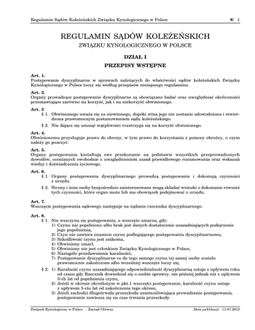 Regulamin Sądów Koleżeńskich Związku Kynologicznego w Polsce 8/ 1 REGULAMIN SĄDÓW KOLEŻEŃSKICH ZWIĄZKU KYNOLOGICZNEGO W POLSCE DZIAŁ I PRZEPISY WSTĘPNE Art. 1. Postępowanie dyscyplinarne w sprawach należących do właściwości sądów koleżeńskich Związku Kynologicznego w Polsce toczy się według przepisów niniejszego regulaminu. Art. 2. Organy prowadzące postępowanie dyscyplinarne są obowiązane badać oraz uwzględniać okoliczności przemawiające zarówno na korzyść, jak i na niekorzyść obwinionego. Art. 3 § 1. Obwinionego uważa się za niewinnego, dopóki wina jego nie zostanie udowodniona i stwierdzona prawomocnym postanowieniem sądu koleżeńskiego. § 2. Nie dające się usunąć wątpliwości rozstrzyga się na korzyść obwinionego. Art. 4. Obwinionemu przysługuje prawo do obrony, w tym prawo do korzystania z pomocy obrońcy, o czym należy go pouczyć. Art. 5. Organy postępowania kształtują swe przekonanie na podstawie wszystkich przeprowadzonych dowodów, ocenianych swobodnie z uwzględnieniem zasad prawidłowego rozumowania oraz wskazań wiedzy i doświadczenia życiowego. Art. 6. § 1. Organy postępowania dyscyplinarnego prowadzą postępowanie i dokonują czynności z urzędu. § 2. Strony i inne osoby bezpośrednio zainteresowane mogą składać wnioski o dokonanie również tych czynności, które organ może lub ma obowiązek podejmować z urzędu. Art. 7. Wszczęcie postępowania sądowego następuje na żądanie rzecznika dyscyplinarnego. Art. 8. § 1. Nie wszczyna się postępowania, a wszczęte umarza, gdy: 1) Czynu nie popełniono albo brak jest danych dostatecznie uzasadniających podejrzenie jego popełnienia, 2) Czyn nie zawiera znamion czynu podlegającego postępowaniu dyscyplinarnemu, 3) Szkodliwość czynu jest znikoma, 4) Obwiniony zmarł, 5) Obwiniony nie jest członkiem Związku Kynologicznego w Polsce, 6) Nastąpiło przedawnienie karalności, 7) Postępowanie dyscyplinarne co do tego samego czynu tej samej osoby zostało prawomocnie zakończone albo wcześniej wszczęte toczy się, § 2. 1) Karalność czynu uzasadniającego odpowiedzialność dyscyplinarną ustaje z upływem roku od czasu gdy Rzecznik dowiedział się o osobie sprawcy, nie później jednak niż z upływem 3-ch lat od popełnienia czynu, 2) Jeżeli w okresie określonym w pkt.1 wszczęto postępowanie, karalność czynu ustaje z upływem 5-ciu lat od zakończenia tego okresu, 3) Jeżeli zachodzi długotrwała przeszkoda uniemożliwiająca prowadzenie postępowania, postępowanie zawiesza się na czas trwania przeszkody. Związek Kynologiczny w Polsce - Zarząd Główny Data publikacji: 11.07.2013 8/ 2 Regulamin Sądów Koleżeńskich Związku Kynologicznego w Polsce 4) Na postanowienie w przedmiocie zawieszenia postępowania stronom przysługuje zażalenie. § 3. W czasie zawieszenia postępowania należy jednak dokonać odpowiednich czynności w celu zabezpieczenia dowodów przed ich utratą. Art. 9. § 1. Z chwilą zatarcia kary uważa się ją za niebyłą, a wpis o karze usuwa się z rejestru, § 2. W razie wymierzenia: 1) kary wykluczenia ze Związku, zatarcie skazania następuje po upływie lat 7-miu. 2) kary zawieszenia w prawach członka ZKwP po okresie równym okresowi zawieszenia, którego bieg rozpoczyna się z dniem odbycia kary, 3) kary innego rodzaju po upływie roku od uprawomocnienia się orzeczenia. DZIAŁ II SĄD Rozdział 1 - Właściwość i skład sądu Art. 10. Oddziałowy Sąd Koleżeński orzeka w pierwszej instancji we wszystkich sprawach, z wyjątkiem spraw przekazanych do właściwości innego sądu. Art. 11. § 1. Główny Sąd Koleżeński orzeka w pierwszej instancji w sprawach: 1) przeciwko członkom władz wybieralnych ZKwP, 2) sędziów kynologicznych. § 2. Główny Sąd Koleżeński rozpoznaje ponadto środki odwoławcze od orzeczeń wydanych w pierwszej instancji w Oddziałowym Sądzie Koleżeńskim, Głównym Sądzie Koleżeńskim działającym jako sąd I instancji, uchwał zarządów oddziałów i Zarządu Głównego zawieszających uprawnienia związane z członkowstwem w ZKwP na czas trwania postępowania. Art. 12. Sąd orzeka w składzie trzyosobowym. Art. 13. Przed sądem II instancji sąd orzeka w składzie trzyosobowym. Rozpoznając odwołanie od orzeczenia Głównego Sądu Koleżeńskiego jako sądu I instancji, Główny Sąd Koleżeński orzeka w składzie pięcioosobowym. Rozdział 2 - Wyłączenie członka składu orzekającego Art. 14. Członek składu orzekającego ulega wyłączeniu, jeżeli istnieje okoliczność tego rodzaju, że mogłaby wywołać uzasadnioną wątpliwość co do jego bezstronności w danej sprawie. Art. 15. § 1. Wyłączenie następuje na żądanie członka składu orzekającego, z urzędu albo na wniosek strony. § 2. O wyłączeniu orzeka sąd, przed którym toczy się postępowanie; w składzie orzekającym w kwestii wyłączenia nie może brać udziału osoba, której dotyczy wyłączenie. W razie niemożności utworzenia takiego składu sądu, w kwestii wyłączenia orzeka sąd wyższego rzędu. § 3. Znane z urzędu przesłanki wyłączenia członka składu orzekającego, Przewodniczący danego sądu uwzględnia przy wyznaczaniu składu orzekającego. Związek Kynologiczny w Polsce - Zarząd Główny Regulamin Sądów Koleżeńskich Związku Kynologicznego w Polsce 8/ 3 Art. 16. § 1. Jeżeli z powodu wyłączenia członków składu orzekającego, lub niemożliwości powołania składu orzekającego rozpoznanie sprawy w danym sądzie jest niemożliwe, sąd wyższego rzędu przekazuje sprawę innemu sądowi równorzędnemu. § 2. Jeżeli okoliczność określona w § 1 dotyczy Głównego Sądu Koleżeńskiego, Przewodniczący Głównego Sądu Koleżeńskiego może powołać do składu orzekającego na zasadzie delegacji członka oddziałowego sądu koleżeńskiego. DZIAŁ III STRONY I OBROŃCY Rozdział 1 - Oskarżyciel Art. 17. Oskarżycielem przed wszystkimi sądami jest r