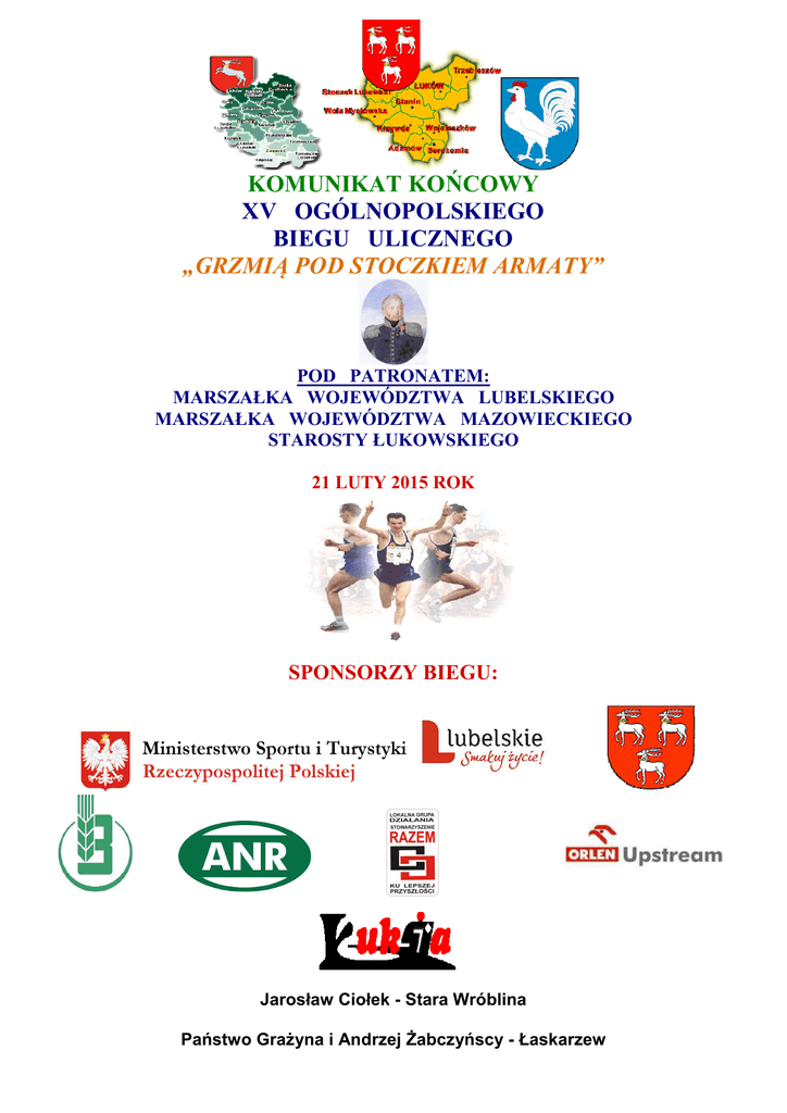 KOMUNIKAT KOŃCOWY XV OGÓLNOPOLSKIEGO BIEGU ULICZNEGO „GRZMIĄ POD STOCZKIEM ARMATY” POD PATRONATEM: MARSZAŁKA WOJEWÓDZTWA LUBELSKIEGO MARSZAŁKA WOJEWÓDZTWA MAZOWIECKIEGO STAROSTY ŁUKOWSKIEGO 21 LUTY 2015 ROK SPONSORZY BIEGU: Jarosław Ciołek - Stara Wróblina Państwo Grażyna i Andrzej Żabczyńscy - Łaskarzew XV OGÓLNOPOLSKI BIEG ULICZNY „GRZMIĄ POD STOCZKIEM ARMATY” POD PATRONATEM: MARSZAŁKA WOJEWÓDZTWA LUBELSKIEGO, MARSZAŁKA WOJEWÓDZTWA MAZOWIECKIEGO, STAROSTY ŁUKOWSKIEGO BIEG - 1600 metrów – CHŁOPCY ZE SZKÓŁ PONADGIMNAZJALNYCH. MIEJSCE IMIĘ I NAZWISKO SZKOŁA – MIEJSCOWOŚĆ 1 Mateusz Kondej LO Garwolin 2 Bartosz Przybysz LO Garwolin 3 Kamil Lada LO Garwolin 4 Albert Gendyk ZSP Nr 2 Garwolin 5 Karol Szeńczyk Puławy 6 Andrzej Celejewski ZSZ Nr 1 Dęblin 7 Karol Pawlak ZSP Nr 2 Garwolin 8 Mateusz Domański ZSP Nr 2 Garwolin 9 Maksym Staniszewski ZS Stoczek Łukowski 10 Marcin Gaładyk ZS Stoczek Łukowski 11 Jakub Rombel ZS Stoczek Łukowski 12 Przemysław Kusio ZS Stoczek Łukowski 13 Hubert Miernicki ZS Stoczek Łukowski 14 Sebastian Sobiech ZS Stoczek Łukowski 15 Łukasz Piskorz ZS Stoczek Łukowski 16 Marek Bala ZS Stoczek Łukowski 17 Patryk Mizeracki ZS Stoczek Łukowski XV OGÓLNOPOLSKI BIEG ULICZNY „GRZMIĄ POD STOCZKIEM ARMATY” POD PATRONATEM: MARSZAŁKA WOJEWÓDZTWA LUBELSKIEGO, MARSZAŁKA WOJEWÓDZTWA MAZOWIECKIEGO, STAROSTY ŁUKOWSKIEGO BIEG - 800 metrów – DZIEWCZĘTA ZE SZKÓŁ PONADGIMNAZJALNYCH. MIEJSCE IMIĘ I NAZWISKO SZKOŁA - MIEJSCOWOŚĆ 1 Katarzyna Szczegoł ZSP Nr 1 Garwolin 2 Paulina Bogusz ZS Stoczek Łukowski 3 Adrianna Lipińska LO Łuków 4 Dominika Rychta LO Łuków 5 Milena Smółka ZS Stoczek Łukowski 6 Magdalena Sobiech ZS Stoczek Łukowski 7 Joanna Lasota ZS Stoczek Łukowski 8 Katarzyna Osińska ZS Stoczek Łukowski 9 Karolina Drosio ZS Stoczek Łukowski 10 Dominika Woźny ZS Stoczek Łukowski 11 Kamila Zasuwik ZS Stoczek Łukowski 12 Agata Osiak ZS Stoczek Łukowski XV OGÓLNOPOLSKI BIEG ULICZNY „GRZMIĄ POD STOCZKIEM ARMATY” POD PATRONATEM: MARSZAŁKA WOJEWÓDZTWA LUBELSKIEGO, MARSZAŁKA WOJEWÓDZTWA MAZOWIECKIEGO, STAROSTY ŁUKOWSKIEGO BIEG - 800 metrów – CHŁOPCY ZE SZKÓŁ GIMNAZJALNYCH. MIEJSCE IMIĘ I NAZWISKO SZKOŁA - MIEJSCOWOŚĆ 1 Karol Kluziak Puławy 2 Adrian Gasek Stara Prawda 3 Jakub Kołodziej Wojcieszków 4 Paweł Mikulski Unin 5 Michał Kałaska Garwolin 6 Arkadiusz Barcikowski Pilawa 7 Mateusz Wołoszka Stare Kobiałki 8 Jakub Zadrożny Garwolin 9 Artur Zdziebłowski Kisielsk 10 Tobiasz Domań Stoczek Łukowski 11 Jakub Gil Wojcieszków 12 Szymon Czub Stoczek Łukowski 13 Patryk Bareja PG Nr 6 Siedlce 14 Cezary Kucharski Wojcieszków 15 Szymon Mrozowski Stoczek Łukowski 16 Kacper Rosa Stara Prawda 17 Patryk Miszkurka Stoczek Łukowski 18 Dawid Czapski Wojcieszków 19 Marcin Trochimiak Wojcieszków 20 Mateusz Świder Wojcieszków 21 Krystian Jończyk Stare Kobiałki 22 Mikołaj Rosa Stoczek Łukowski 23 Robert Brodzik Stara Róża 24 Marcin Izmer Stoczek Łukowski 25 Stanisław Wojecki Stoczek Łukowski 26 Adrian Kryjak Wojcieszków 27 Franciszek Waleruk Stoczek Łukowski 28 Damian Bucharski Stoczek Łukowski XV OGÓLNOPOLSKI BIEG ULICZNY „GRZMIĄ POD STOCZKIEM ARMATY” POD PATRONATEM: MARSZAŁKA WOJEWÓDZTWA LUBELSKIEGO, MARSZAŁKA WOJEWÓDZTWA MAZOWIECKIEGO, STAROSTY ŁUKOWSKIEGO 29 Jakub Brzozowski Stoczek Łukowski 30 Mikołaj Soćko Stoczek Łukowski 31 Filip Madej Stoczek Łukowski 32 Radosław Filipczak Stoczek Łukowski 33 Patryk Kunka Stoczek Łukowski 34 Rafał Gotlib Stoczek Łukowski 35 Krystian Kot Stoczek Łukowski XV OGÓLNOPOLSKI BIEG ULICZNY „GRZMIĄ POD STOCZKIEM ARMATY” POD PATRONATEM: MARSZAŁKA WOJEWÓDZTWA LUBELSKIEGO, MARSZAŁKA WOJEWÓDZTWA MAZOWIECKIEGO, STAROSTY ŁUKOWSKIEGO BIEG - 800 metrów – DZIEWCZĘTA ZE SZKÓŁ GIMNAZJALNYCH. MIEJSCE IMIĘ I NAZWISKO SZKOŁA – MIEJSCOWOŚĆ 1 Natalia Przybysz Unin 2 Karolina Mika Miastków Kościelny 3 Klaudia Gałązka Wola Rębkowska 4 Katarzyna Latuszek Unin 5 Dominika Warpas Wojcieszków 6 Zuzanna Adamiak Stoczek Łukowski 7 Martyna Świder Wojcieszków 8 Natalia Lotek Wojcieszków 9 Aleksandra Hajduk PG Nr 1 Siedlce 10 Wiktoria Szczęśniak Stare Kobiałki 11 Małgorzata Kołnacka Wojcieszków 12 Wiktoria Burdach Wojcieszków 13 Magdalena Ognik Wojcieszków 14 Katarzyna Misiak Wojcieszków 15 Kamila Soćko Stara Róża 16 Oliwia Jończyk Stare Kobiałki 17 Monika Łukasiewicz Stoczek Łukowski 18 Magdalena Zacharska Wojcieszków 19 Karolina Latoch Wojcieszków 20 Karolina Latuszek Wojcieszków 21 Patrycja Porębska Wojcieszków 22 Ewelina Woźna Stoczek Łukowski 23 Natalia Rombel Stara Róża 24 Klaudia Zalewska Wojcieszków 25 Aleksandra Kruk Stoczek Łukowski 26 Beata Barej Stoczek Łukowski 27 Martyna Warpas Wojcieszków 28 Patrycja Pajdowska Wojcieszków XV OGÓLNOPOLSKI BIEG ULICZNY „GRZMIĄ POD STOCZKIEM ARMATY” POD PATRONATEM: MARSZAŁKA WOJEWÓDZTWA LUBELSKIEGO, MARSZAŁKA WOJEWÓDZTWA MAZOWIECKIEGO, STAROSTY ŁUKOWSKIEGO 29 Aleksandra Stosio Stoczek Łukowski 30 Sylwia Kaczor Stare Kobiałki 31 Klaudia Czyżak Wojcieszków 32 Karolina Ciężka Wojcieszków 33 Marlena Łazuga Wojcieszków 34 Julia Romanowska Wojcieszków 35 Karolina Burdach Wojcieszków 36 Agata Pawlak Wojcieszków 37 Gabriela Kołnacka Wojcieszków XV OGÓLNOPOLSKI BIEG ULICZNY „GRZMIĄ POD STOCZKIEM ARMATY” POD PATRONATEM: MARSZAŁKA WOJEWÓDZTWA LUBELSKIEGO, MARSZAŁKA WOJEWÓDZTWA MAZOWIECKIEGO, STAROSTY ŁUKOWSKIEGO BIEG - 400 metrów – DZIEWCZĘTA ZE SZKÓŁ PODSTAWOWYCH. KLASY I - IV MIEJSCE IMIĘ I NAZWISKO SZKOŁA - MIEJSCOWOŚĆ 1 Patrycja Gładek Jarczew 2 Olga Łukaszewicz Stoczek Łukowski 3 Marta Kazanecka Stara Róża 4 Patrycja Maślak Jarczew 5 Julia Brodzik Stara Róża 6 Anna Gotlib Stoczek Łukowski 7 Oliwia Sikorska Stara Róża 8 Sylwia Barej Stoczek Łukowski 9 Paulina Jeżewska Jarczew 10 Patrycja Lacek Stoczek Łukowski 11 Ewelina Bogusz Stara Róża 12 Paulina Basek Stoczek Łukowski 13 Iz
