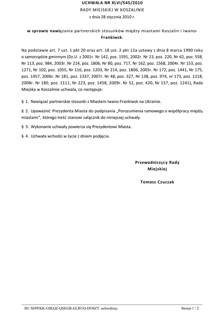 UCHWAŁA NR XLVI/545/2010 RADY MIEJSKIEJ W KOSZALINIE z dnia 28 stycznia 2010 r. w sprawie nawiązania partnerskich stosunków między miastami Koszalin i IwanoFrankiwsk. Na podstawie art. 7 ust. 1 pkt 20 oraz art. 18 ust. 2 pkt 12a ustawy z dnia 8 marca 1990 roku o samorządzie gminnym (Dz.U. z 2001r. Nr 142, poz. 1591, 2002r. Nr 23, poz. 220, Nr 62, poz. 558, Nr 113, poz. 984, 2003r. Nr 214, poz. 1806, Nr 80, poz. 717, Nr 162, poz. 1568, 2004r. Nr 153, poz. 1271, Nr 102, poz. 1055, Nr 116, poz. 1203, Nr 214, poz. 1806, 2005r. Nr 172, poz. 1441, Nr 175, poz. 1457, 2006r. Nr 181, poz. 1337, 2007r. Nr 48, poz. 327, Nr 138, poz. 974, nr 173, poz. 1218, 2008r. Nr 180, poz. 1111, Nr 223, poz. 1458, 2009r. Nr 52, poz. 420, Nr 157, poz. 1241), Rada Miejska w Koszalinie uchwala, co następuje: § 1. Nawiązać partnerskie stosunki z Miastem Iwano-Frankiwsk na Ukrainie. § 2. Upoważnić Prezydenta Miasta do podpisania „Porozumienia ramowego o współpracy między miastami”, którego treść stanowi załącznik do niniejszej uchwały. § 3. Wykonanie uchwały powierza się Prezydentowi Miasta. § 4. Uchwała wchodzi w życie z dniem podjęcia. Przewodniczący Rady Miejskiej Tomasz Czuczak Załącznik do uchwały Nr XLVI/545/2010 Rady Miejskiej w Koszalinie z dnia 28 stycznia 2010 r. POROZUMIENIE RAMOWE O WSPÓŁPRACY MIĘDZY MIASTAMI KOSZALINEM W RZECZPOSPOLITEJ POLSKIEJ A IWANO-FRANKIWSKIEM NA UKRAINIE Miasto Koszalin Rzeczpospolita Polska oraz Miasto Iwano-Frankiwsk Ukraina zawiązują na mocy postanowień Rady Miejskiej w Koszalinie z dnia 28 stycznia Komitetu Wykonawczego Rady Miejskiej w Iwano-Frankiwsku z dnia .............. ID: NHWKK-OJKQZ-QSEGB-GLRUQ-DOSZT. uchwalony. miast. partnerstwo Strona 1 / 2 Załącznik do uchwały Nr XLVI/545/2010 Rady Miejskiej w Koszalinie z dnia 28 stycznia 2010 r. POROZUMIENIE RAMOWE O WSPÓŁPRACY MIĘDZY MIASTAMI KOSZALINEM W RZECZPOSPOLITEJ POLSKIEJ A IWANO-FRANKIWSKIEM NA UKRAINIE Miasto Koszalin Rzeczpospolita Polska oraz Miasto Iwano-Frankiwsk Ukraina zawiązują na mocy postanowień Rady Miejskiej w Koszalinie z dnia 28 stycznia Komitetu Wykonawczego Rady Miejskiej w Iwano-Frankiwsku z dnia .............. partnerstwo miast. Porozumienie ramowe: Przedstawiciele miast Iwano-Frankiwska i Koszalina zawierają następujące porozumienie: § 1. Główne cele współpracy partnerskiej miast dotyczą w szczególności następujących dziedzin: - oświaty - wymiany kulturalnej i sportowej - współpracy gospodarczej § 2. Dla realizacji tych celów, obydwa miasta zobowiązują się popierać bezpośrednie kontakty miedzy mieszkańcami oraz między organizacjami: państwowymi, samorządowymi, społecznymi, gospodarczymi i młodzieżowymi. § 3. Wszystkie koszty związane z pobytem w mieście partnerskim będą regulowane poprzez wzajemne porozumienie stron. § 4. Niniejsze porozumienie zawiera się na 10 lat z możliwością jego przedłużenia. § 5. Wszelkie zmiany i aktualizacje dotyczące tego Porozumienia mogą być dokonywane tylko przy istnieniu obustronnej zgody w postaci aneksu. § 6. Porozumienie sporządzono w czterech egzemplarzach, po dwa w języku ukraińskim i polskim, przy czym brzmienie każdego jest jednakowo obowiązujące. Mer Miasta IwanoFrankiwska Prezydent Miasta Koszalina ...................., dnia ............................................2010 r. ID: NHWKK-OJKQZ-QSEGB-GLRUQ-DOSZT. uchwalony. Strona 2 / 2