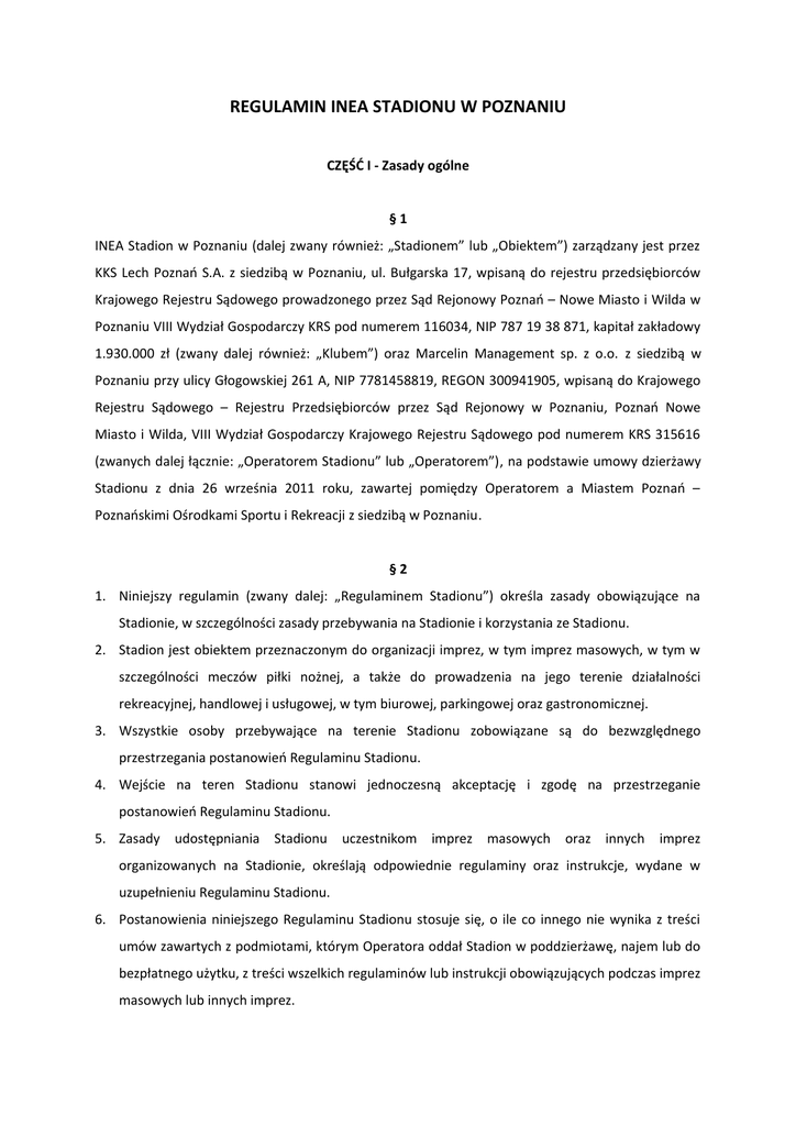 REGULAMIN INEA STADIONU W POZNANIU CZĘŚĆ I - Zasady ogólne §1 INEA Stadion w Poznaniu (dalej zwany również: „Stadionem” lub „Obiektem”) zarządzany jest przez KKS Lech Poznań S.A. z siedzibą w Poznaniu, ul. Bułgarska 17, wpisaną do rejestru przedsiębiorców Krajowego Rejestru Sądowego prowadzonego przez Sąd Rejonowy Poznań – Nowe Miasto i Wilda w Poznaniu VIII Wydział Gospodarczy KRS pod numerem 116034, NIP 787 19 38 871, kapitał zakładowy 1.930.000 zł (zwany dalej również: „Klubem”) oraz Marcelin Management sp. z o.o. z siedzibą w Poznaniu przy ulicy Głogowskiej 261 A, NIP 7781458819, REGON 300941905, wpisaną do Krajowego Rejestru Sądowego – Rejestru Przedsiębiorców przez Sąd Rejonowy w Poznaniu, Poznań Nowe Miasto i Wilda, VIII Wydział Gospodarczy Krajowego Rejestru Sądowego pod numerem KRS 315616 (zwanych dalej łącznie: „Operatorem Stadionu” lub „Operatorem”), na podstawie umowy dzierżawy Stadionu z dnia 26 września 2011 roku, zawartej pomiędzy Operatorem a Miastem Poznań – Poznańskimi Ośrodkami Sportu i Rekreacji z siedzibą w Poznaniu. §2 1. Niniejszy regulamin (zwany dalej: „Regulaminem Stadionu”) określa zasady obowiązujące na Stadionie, w szczególności zasady przebywania na Stadionie i korzystania ze Stadionu. 2. Stadion jest obiektem przeznaczonym do organizacji imprez, w tym imprez masowych, w tym w szczególności meczów piłki nożnej, a także do prowadzenia na jego terenie działalności rekreacyjnej, handlowej i usługowej, w tym biurowej, parkingowej oraz gastronomicznej. 3. Wszystkie osoby przebywające na terenie Stadionu zobowiązane są do bezwzględnego przestrzegania postanowień Regulaminu Stadionu. 4. Wejście na teren Stadionu stanowi jednoczesną akceptację i zgodę na przestrzeganie postanowień Regulaminu Stadionu. 5. Zasady udostępniania Stadionu uczestnikom imprez masowych oraz innych imprez organizowanych na Stadionie, określają odpowiednie regulaminy oraz instrukcje, wydane w uzupełnieniu Regulaminu Stadionu. 6. Postanowienia niniejszego Regulaminu Stadionu stosuje się, o ile co innego nie wynika z treści umów zawartych z podmiotami, którym Operatora oddał Stadion w poddzierżawę, najem lub do bezpłatnego użytku, z treści wszelkich regulaminów lub instrukcji obowiązujących podczas imprez masowych lub innych imprez. §3 1. Stadion jest dostępny dla korzystających codziennie w godzinach od 06:00 do 24:00 za wyjątkiem dni, w których na terenie Stadionu organizowane są imprezy masowe lub inne imprezy. 2. Na terenie Stadionu wyznaczone są strefy ograniczonego dostępu, w których znajdować się mogą wyłącznie osoby posiadające odpowiednie identyfikatory. Poza strefami ograniczonego dostępu poruszanie się po Stadionie jest dozwolone bez ograniczeń, z zastrzeżeniem ust. 3 i 4 poniżej. 3. Na terenie Stadionu ruch pieszych i pojazdów może się odbywać wyłącznie po drogach do tego przeznaczonych. Parkowanie pojazdów dozwolone jest wyłącznie w miejscach do tego przeznaczonych oraz w miejscu wynikającym z przepustki parkingowej wydanej przez Operatora. 4. Bez zezwolenia Operatora, zabrania się wchodzenia w miejsca nie przeznaczone dla publiczności. Zakaz powyższy dotyczy w szczególności: a) płyty głównej boiska, b) budowli i urządzeń nie przeznaczonych do powszechnego użytku, fasady Stadionu, płotów, murów, ogrodzeń, dachów Stadionu, urządzeń oświetleniowych, pomostów kamerowych, drzew, wszelkiego rodzaju masztów oraz wejścia do innych miejsc, urządzeń i pomieszczeń, do których dostęp mają wyłącznie służby specjalistyczne lub przedstawiciele Operatora. 5. Bez uprzedniego pisemnego zezwolenia Operatora, zabrania się wykonywania fotografii Stadionu dla celów komercyjnych. 6. Mapa terenu Stadionu stanowi załącznik do Regulaminu Stadionu. §4 1. Stadion jest nadzorowany za pomocą kamer monitoringu wizyjnego przez 24 godziny na dobę. 2. Stadion jest chroniony przez 24 godziny na dobę. 3. Stadion jest wyposażony w kompatybilny elektroniczny system identyfikacji osób, służący do sprzedaży biletów, kontroli przebywania na Stadionie w czasie trwania imprezy masowej oraz kontroli dostępu. 4. Osoby przebywające na Stadionie zobowiązane są do posiadania przy sobie i noszenia w widocznym miejscu identyfikatora albo akredytacji otrzymanej od Operatora (w przypadku imprez masowych). Operator oraz jego służby mają prawo sprawdzać otrzymane akredytacje i identyfikatory. Za brak identyfikatora lub akredytacji Operator może nałożyć karę umowną, o której mowa w § 7 ust. 2 pkt c) części I niniejszego Regulaminu. 5. W przypadku zagubienia, zniszczenia lub w przypadku każdej innej okoliczności utraty identyfikatora lub akredytacji fakt ten należy niezwłocznie zgłosić Operatorowi Stadionu. 6. Wydanie oryginału akredytacji lub identyfikatora jest nieodpłatne. Wydanie duplikatu dokumentów jest możliwe po uiszczeniu opłaty administracyjnej w wysokości 50 zł. 7. Wzór akredytacji oraz identyfikatora, sposób aplikowania o ich wydanie i proces ich dystrybucji określa Operator Stadionu w oświadczeniu przesłanym do podmiotów, którym Operatora oddał Stadion w poddzierżawę, najem lub do bezpłatnego użytku. §5 1. Zakazuje się wstępu na teren Stadionu osobie: a) znajdującej się pod widocznym wpływem alkoholu, środków odurzających i psychotropowych lub innych podobnie działających środków, b) zachowującej się agresywnie, prowokacyjnie albo w inny sposób stwarzającej zagrożenie dla bezpieczeństwa lub porządku publicznego. 2. Zabrania się wnoszenia i posiadania na Stadionie: a) jakiejkolwiek broni, b) wyrobów pirotechnicznych i innych podobnie działających przedmiotów oraz wszelkiego rodzaju materiałów potencjalnie pożarowo niebezpiecznych, c) alkoholu, d) środków odurzających i psychotropowych lub innych podobnie działających środków, e) pojemników do rozpylania gazu,