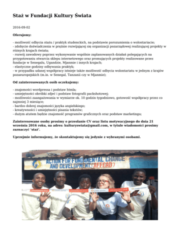 Staż w Fundacji Kultury Świata 2016-09-02 Oferujemy: - możliwość odbycia stażu / praktyk studenckich, na podstawie porozumienia o wolontariacie; - zdobycie doświadczenia w prężnie rozwijającej się organizacji pozarządowej realizującej projekty w różnych krajach świata; - rozwój zawodowy poprzez wykonywanie wspólnie zaplanowanych działań polegających na przygotowaniu otwarcia sklepu internetowego oraz promujących projekty realizowane przez fundacje w Senegalu, Ugandzie, Mjanmie i innych krajach; - elastyczne godziny odbywania praktyk; - w przypadku udanej współpracy istnieje także możliwość odbycia wolontariatu w jednym z krajów pozaeuropejskich (m.in. w Senegal, Tanzanii czy w Mjanmie); Od zainteresowanych osób oczekujemy: - znajomości wordpressa i podstaw htmla; - umiejętności obróbki zdjeć i podstaw fotografii packshotowej; - możliwości zaangażowania w wymiarze ok. 10 godzin tygodniowo, gotowość współpracy przez co najmniej 3 miesiące; - bardzo dobrej znajomości języka angielskiego; - kreatywności i umiejętności pisania tekstów; - dużym atutem będzie znajomość programów graficznych oraz podstaw marketingu; Zainteresowane osoby prosimy o przesłanie CV oraz listu motywacyjnego do dnia 21 września 2016 roku, na adres: [email protected], w tytule wiadomości prosimy zaznaczyć ‘staż’. Uprzejmie informujemy, że skontaktujemy się jedynie z wybranymi osobami. Aleksandra Kraszkiewicz była wolontariuszką z ramienia Fundacji Kultury Świata w ugandyjskiej organizacji AFFCAD w latach 2014-2016