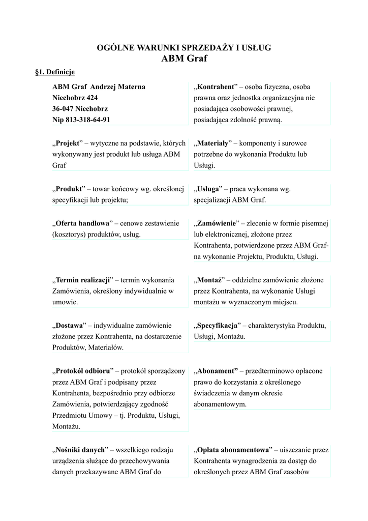 OGÓLNE WARUNKI SPRZEDAŻY I USŁUG ABM Graf §1. Definicje ABM Graf Andrzej Materna Niechobrz 424 36-047 Niechobrz Nip 813-318-64-91 „Kontrahent” – osoba fizyczna, osoba prawna oraz jednostka organizacyjna nie posiadająca osobowości prawnej, posiadająca zdolność prawną. „Projekt” – wytyczne na podstawie, których wykonywany jest produkt lub usługa ABM Graf „Materiały” – komponenty i surowce potrzebne do wykonania Produktu lub Usługi. „Produkt” – towar końcowy wg. określonej specyfikacji lub projektu; „Usługa” – praca wykonana wg. specjalizacji ABM Graf. „Oferta handlowa” – cenowe zestawienie (kosztorys) produktów, usług. „Zamówienie” – zlecenie w formie pisemnej lub elektronicznej, złożone przez Kontrahenta, potwierdzone przez ABM Grafna wykonanie Projektu, Produktu, Usługi. „Termin realizacji” – termin wykonania Zamówienia, określony indywidualnie w umowie. „Montaż” – oddzielne zamówienie złożone przez Kontrahenta, na wykonanie Usługi montażu w wyznaczonym miejscu. „Dostawa” – indywidualne zamówienie złożone przez Kontrahenta, na dostarczenie Produktów, Materiałów. „Specyfikacja” – charakterystyka Produktu, Usługi, Montażu. „Protokół odbioru” – protokół sporządzony przez ABM Graf i podpisany przez Kontrahenta, bezpośrednio przy odbiorze Zamówienia, potwierdzający zgodność Przedmiotu Umowy – tj. Produktu, Usługi, Montażu. „Abonament” – przedterminowo opłacone prawo do korzystania z określonego świadczenia w danym okresie abonamentowym. „Nośniki danych” – wszelkiego rodzaju urządzenia służące do przechowywania danych przekazywane ABM Graf do „Opłata abonamentowa” – uiszczanie przez Kontrahenta wynagrodzenia za dostęp do określonych przez ABM Graf zasobów wykonania zamówienia. informacji, w wyznaczonym okresie abonamentowym. „Nośnik Reklamy” – wszelkiego rodzaju ruchomości lub nieruchomości, które służą do eksponowania reklamy, między innym (tablice, billboardy, samochody, stojaki, kasetony, budynki, ogrodzenia, maszty, wiadukty, mosty inne obiekty budowlane, na których może być umieszczona reklama). „Okres abonamentu” – okres rozliczeniowy, za który Kontrahent dokonał płatności wynagrodzenia z góry, określony w ofercie ABM Graf. §2. Zawarcie umowy 2.1. Nawiązanie współpracy z ABM Graf, odbywa się poprzez kontakt Internetowy, telefoniczny i bezpośredni w Siedzibie firmy lub poprzez przedstawiciela ABM Graf w firmie klienta. Przyjęcie zamówienia do realizacji wymaga akceptacji obu stron: ABM Graf, Kontrahent. 2.2. Zamówienia przyjmujemy tylko w formie pisemnej. Wszelkie ustalenia poczynione z działem sprzedaży bądź innymi pracownikami ABM Graf nie są pojmowane jako zamówienie bądź zlecenie oraz nie stanowią podstaw do roszczeń. Każdorazowo wymagają pisemnej formy oraz pisemnego potwierdzenia przez pracownika ABM Graf. 2.3. Kontrahent składając zamówienie akceptuje Ogólne Warunki Umowy ABM Graf. 2.4. Potwierdzeniem złożonego zamówienia może stanowić: Umowa z ABM Graf, akceptacja i podpis Faktury Proforma, podpis faktury Zaliczkowej, akcept klienta na kosztorysie (Ofercie Handlowej). Potwierdzenie wybranego dokumentu, rozumie się jako zawarcie umowy, jednak zastrzega się iż Umowa z ABM Graf i Ogólne Warunki Sprzedaży i Usług są znane klientowi przy potwierdzaniu wyżej wymienionych dokumentów, świadczących o zawarciu współpracy. Potwierdzeniem na to jest informacja na każdym z tych dokumentów iż „Klient zapoznał się Ogólnymi Warunkami Sprzedaży i Usług ABM Graf.. 2.5. Kontrahent składając zamówienie poprzez Internet lub faksem, potwierdza zapoznanie się i akceptację Ogólnych Warunków Sprzedaży i Usług ABM Graf. 2.6. Ogólne Warunki Sprzedaży i Usług ABM Graf. są dostępne w siedzibie firmy i na stronach internetowych ABM Graf.. 2.7. Ważność zamówienia. Zamówienie wymaga pisemnego potwierdzenia jego wpłynięcia przez ABM Graf. Realizacja zamówienia następuje wyłącznie po otrzymaniu przez ABM Graf wszelkich informacji, danych oraz odpowiednio przygotowanych plików. (zgodnie z wytycznymi ABM Graf - informacje na stronie internetowej, pliki specyfikacji technicznej wykonywanej pracy – przesyłane na żądanie Klienta). 2.8. Wszelkie zmiany dokonywane telefonicznie, muszą zostać zgłoszone do ABM Graf w formie pisemnej. §3. Projekt 3.1. ABM Graf wykonuje każde zamówienie na podstawie projektu zatwierdzonego przez Kontrahenta, wyjątek stanowią Produkty lub Usługi wg. Specyfikacji opracowanej przez ABM Graf. 3.2. ABM Graf nie ponosi odpowiedzialności za treść, jakość, błędy literowe, kolorystyczne, różnicę w znakach graficznych plików przekazanych przez Kontrahenta do realizacji zamówienia oraz za odwzorowanie wydrukowanego koloru. Obowiązkiem Kontrahenta jest sprawdzenie plików i dostarczenie ich w bezbłędnej formie. 3.3. W przypadku konieczności wykonania przez ABM Graf Projektu, koszt jego wykonania ponosi Kontrahent. Cena Projektu w zależności od dalszej realizacji zamówienia zostanie doliczona do całości zamówienia. W przypadku rezygnacji przez Kontrahenta z wykonania Produktu, Usługi na podstawie wykonanego Projektu, Kontrahent zapłaci za wykonany Projekt. 3.4. W zależności od złożonego zamówienia ABM Graf wykona następujące typy projektu: a. projekt poglądowy obejmujący symulację wizualną bez szczegółowych wymiarów, przedstawiającą samą koncepcję projektową przejawiającą się w wizualnym podobieństwie Projektu do Produktu, Usługi z zachowaniem możliwej różnicy pomiędzy Projektem a Produktem, Usługą. b. projekt techniczny (wymiarówki, określające usytuowanie reklamy na wybranym nośniku, ew. gabaryty nośnika) dopuszcza się nieznaczne zmiany, podczas wykonania zamówienia. Zmiany znaczące mogą wystąpić w przypadku, nie ujętych w projekcie specyfikacji technicznych, zmien