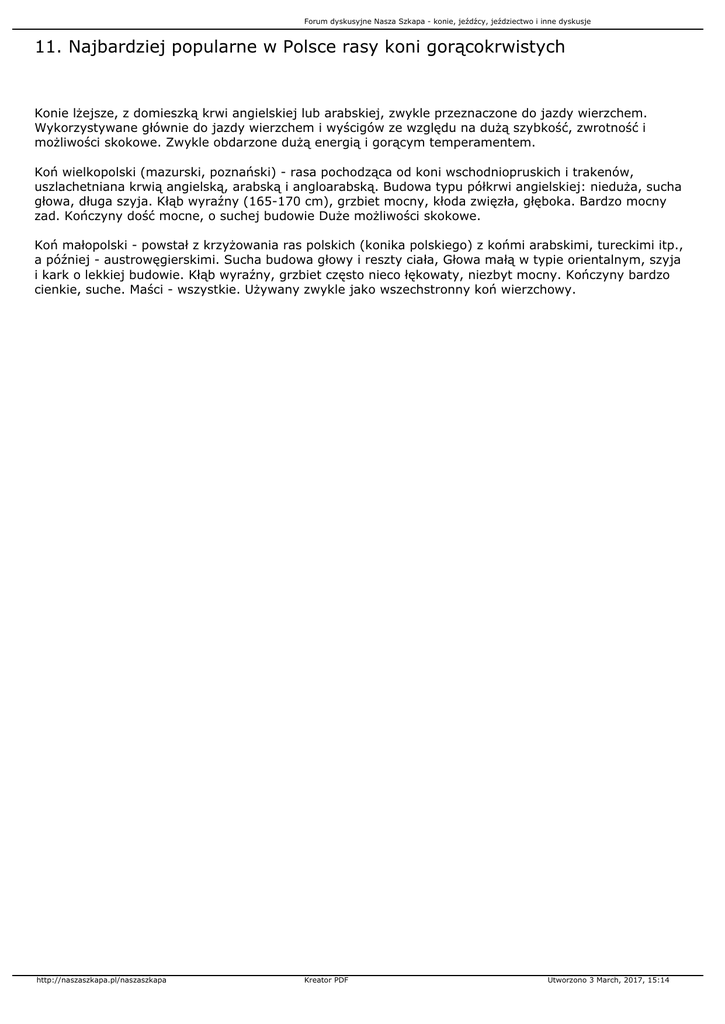Forum dyskusyjne Nasza Szkapa - konie, jeźdźcy, jeździectwo i inne dyskusje 11. Najbardziej popularne w Polsce rasy koni gorącokrwistych Konie lżejsze, z domieszką krwi angielskiej lub arabskiej, zwykle przeznaczone do jazdy wierzchem. Wykorzystywane głównie do jazdy wierzchem i wyścigów ze względu na dużą szybkość, zwrotność i możliwości skokowe. Zwykle obdarzone dużą energią i gorącym temperamentem. Koń wielkopolski (mazurski, poznański) - rasa pochodząca od koni wschodniopruskich i trakenów, uszlachetniana krwią angielską, arabską i angloarabską. Budowa typu półkrwi angielskiej: nieduża, sucha głowa, długa szyja. Kłąb wyraźny (165-170 cm), grzbiet mocny, kłoda zwięzła, głęboka. Bardzo mocny zad. Kończyny dość mocne, o suchej budowie Duże możliwości skokowe. Koń małopolski - powstał z krzyżowania ras polskich (konika polskiego) z końmi arabskimi, tureckimi itp., a później - austrowęgierskimi. Sucha budowa głowy i reszty ciała, Głowa małą w typie orientalnym, szyja i kark o lekkiej budowie. Kłąb wyraźny, grzbiet często nieco łękowaty, niezbyt mocny. Kończyny bardzo cienkie, suche. Maści - wszystkie. Używany zwykle jako wszechstronny koń wierzchowy. http://naszaszkapa.pl/naszaszkapa Kreator PDF Utworzono 3 March, 2017, 15:14