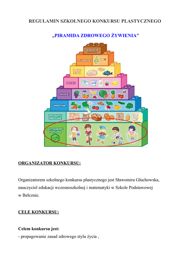 REGULAMIN SZKOLNEGO KONKURSU PLASTYCZNEGO „PIRAMIDA ZDROWEGO ŻYWIENIA” ORGANIZATOR KONKURSU: Organizatorem szkolnego konkursu plastycznego jest Sławomira Głuchowska, nauczyciel edukacji wczesnoszkolnej i matematyki w Szkole Podstawowej w Bełcznie. CELE KONKURSU: Celem konkursu jest: - propagowanie zasad zdrowego stylu życia , - propagowanie nowej piramidy żywienia, - kształtowanie prawidłowych nawyków żywieniowych, - rozumienie wpływu ruchu na nasze zdrowie, - kształtowanie umiejętności wyboru zdrowych, wartościowych produktów spożywczych , - rozwijanie zainteresowań plastycznych i wyobraźni twórczej dzieci, - rozwijanie różnorodnych form i technik plastycznych, - inspirowanie do pracy twórczej oraz pracy zespołowej. ZASADY I MIEJSCE PRZEPROWADZENIA KONKURSU: 1. Konkurs odbywa się w Szkole Podstawowej w Bełcznie. Konkurs ma charakter wewnątrzszkolny i przeznaczony jest dla uczniów klas I – VI. 2. Praca plastyczna ma być wykonana dowolną techniką plastyczną na formacie A1 /arkusz brystolu/ . Tematem pracy plastycznej jest: „ Piramida zdrowego żywienia” , Praca powinna przedstawiać nową piramidę żywienia poszerzoną o ruch. Gotowe prace muszą być podpisane: imię, nazwisko i klasa. Mile widziane będą prace zbiorowe tj. wykonane przez 2 lub 3 uczniów. 3. Konkurs przeprowadza powołana przez organizatora konkursu komisja, w której skład wchodzą: nauczyciel edukacji wczesnoszkolnej – M. Olejnik, dyrektor szkoły – Piotr Kielan oraz nauczyciel plastyki – A, Hrycaj. Zadaniem Komisji jest czuwanie nad prawidłowym przebiegiem konkursu, ocena prac konkursowych oraz wybór zwycięzców konkursu. 4. Przy ocenie prac pod uwagę będzie brana: zgodność pracy z tematem, pomysłowość, oryginalność, estetyka wykonania, walory artystyczne: kompozycja, gama kolorystyczna, technika wykonania. 5. Premiowane są : I. ,II. ,III. miejsce w dwóch kategoriach wiekowych: • kategoria klas 1 – 3 • kategoria klas 4 – 6 6. Zwycięzcy otrzymują nagrody rzeczowe. Przewiduje się również przyznanie kilku wyróżnień. 7. Organizator zastrzega sobie prawo do publikacji prac biorących udział w konkursie/ np. na stronie internetowej szkoły, w gazecie lokalnej /. TERMINY I ZGŁOSZENIA DO KONKURSU: 1. Prace należy dostarczyć pani Sławomirze Głuchowskiej lub pani Annie Hrycaj, do 04. 11. 2015r. 2. Wyniki konkursu zostaną ogłoszone 06.11.2015r. (piątek) w DNIU ŚNIADANIE DAJE MOC na apelu szkolnym. Organizator konkursu: Sławomira Głuchowska
