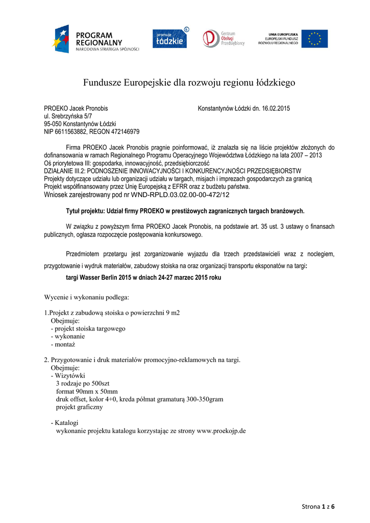 Fundusze Europejskie dla rozwoju regionu łódzkiego PROEKO Jacek Pronobis ul. Srebrzyńska 5/7 95-050 Konstantynów Łódzki NIP 6611563882, REGON 472146979 Konstantynów Łódzki dn. 16.02.2015 Firma PROEKO Jacek Pronobis pragnie poinformować, iż znalazła się na liście projektów złożonych do dofinansowania w ramach Regionalnego Programu Operacyjnego Województwa Łódzkiego na lata 2007 – 2013 Oś priorytetowa III: gospodarka, innowacyjność, przedsiębiorczość DZIAŁANIE III.2: PODNOSZENIE INNOWACYJNOŚCI I KONKURENCYJNOŚCI PRZEDSIĘBIORSTW Projekty dotyczące udziału lub organizacji udziału w targach, misjach i imprezach gospodarczych za granicą Projekt współfinansowany przez Unię Europejską z EFRR oraz z budżetu państwa. Wniosek zarejestrowany pod nr WND-RPLD.03.02.00-00-472/12 Tytuł projektu: Udział firmy PROEKO w prestiżowych zagranicznych targach branżowych. W związku z powyższym firma PROEKO Jacek Pronobis, na podstawie art. 35 ust. 3 ustawy o finansach publicznych, ogłasza rozpoczęcie postępowania konkursowego. Przedmiotem przetargu jest zorganizowanie wyjazdu dla trzech przedstawicieli wraz z noclegiem, przygotowanie i wydruk materiałów, zabudowy stoiska na oraz organizacji transportu eksponatów na targi: targi Wasser Berlin 2015 w dniach 24-27 marzec 2015 roku Wycenie i wykonaniu podlega: 1.Projekt z zabudową stoiska o powierzchni 9 m2 Obejmuje: - projekt stoiska targowego - wykonanie - montaż 2. Przygotowanie i druk materiałów promocyjno-reklamowych na targi. Obejmuje: - Wizytówki 3 rodzaje po 500szt format 90mm x 50mm druk offset, kolor 4+0, kreda półmat gramaturą 300-350gram projekt graficzny - Katalogi wykonanie projektu katalogu korzystając ze strony www.proekojp.de Strona 1 z 6 Fundusze Europejskie dla rozwoju regionu łódzkiego 5000szt, format A4 50 – 80stron, kolor 4+4 papier kreda półmat 170gram grzbiet zszywany okładka, kolor 4+0 papier kreda półmat 300gram - Płyty CD-R z katalogiem oraz materiałami multimedialnymi 1000szt koperta kreda półmat 350gram po złożeniu druk dwustronny (po rozłożeniu jednostronny) nadruk na płycie personalizacja oraz pakowania płyt do koperty projekt graficzny - Torby reklamowe z nadrukiem 5000szt rodzaj typu Market folia LDPE wymiary 400mm x 500mm 1 kolor nadruku projekt graficzny - Długopisy z logo 6000szt 1 kolor nadruku projekt 3. Transport eksponatów w tym wykonanej zabudowy oraz materiałów promocyjnych na teren targów i montaż stoiska na targach 4. Rezerwacja noclegów w Berlinie hotel ***, max 5km od targów 3 osoby 3 noce 5. Transport dla 3 przedstawicieli firmy na targi w Berlinie Strona 2 z 6 Fundusze Europejskie dla rozwoju regionu łódzkiego w/w pozycje obejmują poniższe punkty: 15.9. projekt z zabudową oraz obsługa techniczna stoiska - targi Berlin 2015 15.11. transport, ubezpieczenie oraz odprawa celna eksponatów - targi Berlin 2015 15.12. przygotowanie, druk materiałów reklamowych, prezentacja multimedialna, promocja medialna - targi Berlin 2015 15.13. podróże służbowe przedstawicieli firmy, transport - targi Berlin 2015 15.14. podróże służbowe przedstawicieli firmy zakwaterowanie - targi Berlin 2015 Przy wyborze oferty firma będzie kładła główny nacisk na wydatkowanie środków w sposób celowy i oszczędny, z zachowaniem zasady uzyskiwania najlepszych efektów z danych nakładów. Wybór wykonawcy nastąpi w oparciu o następujące kryteria: 100% cena, Oferty powinny zawierać numer, nazwę oferenta, datę, dane osoby kontaktowej, nazwę wykonawcy, wartość netto oraz brutto, warunki płatności, okres ważności oferty, termin i warunki dostawy. Oferty winny być zgłoszone w formie pisemnej w języku polskim lub angielskim. Zamawiający nie dopuszcza składania ofert częściowych. Struktura ceny: cena, Termin wykonania zamówienia w całości wraz z wyjazdem na targii: do 22.03.2015 materiały reklamowe, pozostałe czynności do 27.03.2015. Beneficjent może zmienić warunki udzielenia zamówienia lub unieważnić postępowanie konkursowe. Oceny ofert dokona specjalnie powołana w tym celu komisja. Osobą do kontaktu ze strony beneficjenta jest Pan Łukasz Grobelkiewicz tel. 664 923 887 Zapraszamy zainteresowane firmy do składania ofert na załączniku nr 1 do zapytania na adres mailowy: [email protected], pocztowy: ul. Srebrzyńska 57D, 95-050 Konstantynów Łódzki lub bezpośrednio w siedzibie firmy PROEKO Jacek Pronobis Termin składania ofert do dnia 03.03.2015 r. do godz. 16.00 Strona 3 z 6 Fundusze Europejskie dla rozwoju regionu łódzkiego załącznik nr 1 PIECZĘĆ WYKONAWCY OFERTA WYKONAWCY Wykonawca oświadcza, że jego oferta spełnienia specyfikację parametrów proponowanego w kosztorysie inwestorskim w sposób ściśle odpowiadający specyfikacji zawartej do zapytania ofertowego. OFERTA Odpowiadając na zapytanie ofertowe na: „Zorganizowanie wyjazdu dla trzech przedstawicieli wraz z noclegiem, przygotowanie i wydruk materiałów, zabudowy stoiska na oraz organizacji transportu eksponatów na targi: targi Wasser Berlin w dniach 24-27 marzec 2015 roku.” oferujemy wykonanie przedmiotu zamówienia zgodnie z wymogami zawartymi w zapytaniu ofertowym za cenę: Cena netto: VAT: _ . _ _ _ . _ _ _ , _ _ PLN ___.___ ,__ PLN (stawka _ _ %) słownie złotych netto/ brutto .................................................................................................. 1. Oświadczamy, że: 1) Zobowiązujemy się wykonać zamówienie w terminach: - określonych w zapytaniu 2) na dostarczone prace udzielamy gwarancji 12 miesięcy; 3) zapoznaliśmy się z warunkami podanymi przez Zamawiającego i nie wnosimy do nich żadnych zastrzeżeń, 4) uzyskaliśmy wszelkie niezbędne informacje do przygotowania oferty i wykonania zamówienia, 5) akceptujemy istotne postanowienia zapytania oraz termin realizacji przedmiotu zamówienia podany przez Zamawiającego, Strona 4 z 6 Fundusze Europejskie dla rozwoju regionu łódzkiego 6) uważ