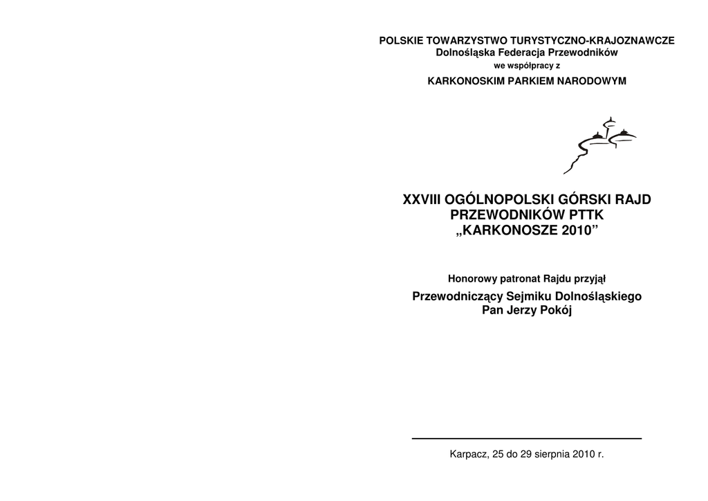 POLSKIE TOWARZYSTWO TURYSTYCZNO-KRAJOZNAWCZE Dolnośląska Federacja Przewodników we współpracy z KARKONOSKIM PARKIEM NARODOWYM XXVIII OGÓLNOPOLSKI GÓRSKI RAJD PRZEWODNIKÓW PTTK „KARKONOSZE 2010” Honorowy patronat Rajdu przyjął Przewodniczący Sejmiku Dolnośląskiego Pan Jerzy Pokój Karpacz, 25 do 29 sierpnia 2010 r. Rajd wspierają finansowo lub organizacyjnie: • Urząd Marszałkowski Województwa Dolnośląskiego • Karkonoski Park Narodowy • Burmistrz miasta Karpacz • Krajowy Samorząd Przewodników Turystycznych i Komisja Przewodnicka ZG PTTK • Oddział Wrocławski PTTK i … Duch Gór – Karkonosz NOTATKI REGULAMIN XXVIII Ogólnopolskiego Górskiego Rajdu Przewodników PTTK Kierownictwo Rajdu • KOMANDOR • • • • – Barbara KOPYDŁOWSKA tel. 71 339 83 11; 694 787 310 WICEKOMANDOR ds. merytorycznych – Krystyn CHUDOBA LOGISTYKA – Tadeusz JUREK, Janina BEDNARSKA SKARBNIK – Grzegorz BEDNARSKI Obsługa przewodnicka – przewodnicy górscy-sudeccy i pracownicy merytoryczni KPN Adres kierownictwa Rajdu Dolnośląska Federacja Przewodników PTTK Rynek – Ratusz 11/12 50–106 Wrocław tel. 71 343 03 44; fax. 71 343 67 46; [email protected] Cele Rajdu • Promocja walorów turystyczno - krajoznawczych Dolnego Śląska, Ziemi Jeleniogórskiej i Karkonoszy w opiniotwórczym środowisku przewodników turystycznych naszego kraju; • Przedstawienie tej Ziemi, jako regionu kwitnącej kultury, przepięknej przyrody, atrakcyjnych zabytków, ciekawych i gościnnych ludzi; • Propagowanie zasad bezpieczeństwa w górach i w organizacji imprez masowych; • Poznanie i integracja środowiska przewodnickiego z całej Polski. Termin Rajdu XXVIII Rajd „Karkonosze 2010” odbędzie się: • dla trasy I w terminie od 25 do 29.08.2010 • dla tras od II do XI w terminie od 26 do 29.08.2010. 1 Uroczyste otwarcie Rajdu nastąpi 25.08. (środa) o godz. 18.00 w „Hotelu Gołębiewski” w Karpaczu. Oficjalne zakończenie odbędzie się 28.08. (sobota) o godz. 18.00 w ośrodku Western City w Ściegnach. Uczestnik zobowiązany jest do przestrzegania przepisów obowiązujących w miejscu zakwaterowania, Karty Turysty, Dekalogu Turysty Górskiego oraz przepisów Karkonoskiego Parku Narodowego. Uczestnictwo w Rajdzie W Rajdzie mogą brać udział zespoły i przewodnicy indywidualni zgłoszeni na kartach zgłoszeń, przez Oddziały lub Koła/Kluby przewodnickie PTTK. KaŜdy uczestnik winien mieć ze sobą: • dowód osobisty, legitymację przewodnicką oraz legitymację PTTK z opłaconą składką za 2010 rok (do okazania w biurze rajdu przy rejestracji). • odpowiednie wyposaŜenie (ubiór przewodnicki, obuwie, apteczkę, niezbędne leki osobiste, latarkę), pogodny stan ducha oraz zamówioną dobrą pogodę. Do zobaczenia w Karpaczu i na karkonoskich szlakach. Zgłoszenia uczestnictwa w Rajdzie Zgłoszenia uczestnictwa w Rajdzie na kartach zgłoszeń, z bezwzględnym określeniem numeru(ów) trasy zastępczej, wraz z kopią wpłaty przesyłamy (pocztą, faksem lub mailem) w nieprzekraczalnym terminie do 15 lipca 2010 r. na adres Kierownictwa Rajdu z dopiskiem: „XXVIII RAJD KARKONOSZE 2010”. Wpłaty naleŜy dokonać wyłącznie na adres kierownictwa rajdu i konto nr Oddział Wrocławski PTTK, RynekRatusz 11/12, 50-106 Wrocław 19 1090 2398 0000 0006 0827 5667 UWAGI • Nie przewiduje się zwrotów dokonanych wpłat. • Liczba uczestników na poszczególnych trasach jest ograniczona. na trasach od I do X do 25 osób; na trasie nr XI do 40 osób O przyjęciu na daną trasę decyduje kolejność zgłoszenia z wpłatami, stąd naleŜy pamiętać o wypełnieniu rubryki „trasy zastępcze”. Zakwaterowanie uczestników Noclegi w Karpaczu: • 24/25 (dla trasy I); • 25/26; 26/27; 27/28 i 28/29 (dla tras od VIII do XI); • 25/26 i 28/29 (dla tras od II do VII). Dla uczestników tras wędrownych (od I do VII) noclegi w pozostałych terminach: tj. 25/26 (dla trasy I) oraz 26/27 i 27/28 (dla tras od I do VII) w obiektach podanych w programie tras rajdowych. Noclegi w Karpaczu będą w okolicach Białego Jaru: DW „Leśny Dwór”, DW „Morskie Oko”, Hotel „Piecuch” i Hotel „ Karolinka”. 2 Opracowanie: Regulamin Trasy Rajdu Grafika Skład komputerowy – Barbara Kopydłowska – Krystyn Chudoba – Rajmund Goluch – Andrzej Nazar 11 Przydziału poszczególnych grup do tych obiektów Kierownictwo Rajdu dokona po zgłoszeniu na Rajd, o czym uczestnicy zostaną powiadomieni w potwierdzeniu przyjęcia na daną trasę rajdową. C. WYCIECZKI DO WYBORU 1. Wyjazd do Czech – zwiedzanie Pragi. 2. Objazd południowej strony Karkonoszy na trasie: Karpacz – Lubawka – Trutnov – Janské Lázně – Černá hora – Černý Důl – Vrchlabi– Jilemnice – Harrachov – Karpacz. 3. Wycieczka autokarowa: Kotlina Jeleniogórska – szlakiem pałaców i ogrodów”. 4. Spacer po Karpaczu: a) m.in. świątynia Wang, Muzeum Zabawek (zbiory H. Tomaszewskiego) – Stok Kolorowa – Muzeum Sportu i Turystyki – Krucze Skały. b) Zapora na Łomnicy – Grabowiec (kaplica św. Anny). INFORMACJE DODATKOWE (dla wszystkich wycieczek): 00 - śniadania: - wymarsz na trasy: - powrót do bazy noclegowej: - obiadokolacja: 30 od 07 do 07 30 00 od 07 do 08 00 00 od 16 do 18 00 30 od 18 do 18 WYKŁADY 00 1. W dniu 25.08.2010 – środa; godz. 18 w „Hotelu Gołębiewski” w Karpaczu: a) temat: „Walory Karkonoskiego Parku Narodowego” – dr Andrzej RAJ – Dyrektor KPN; b) temat: „Dziś i jutro Karpacza” – Bogdan Malinowski – Burmistrz Karpacza. 2. W kolejnych dniach po posiłkach wieczornych w miejscach noclegowych będą odbywały się spotkania (od 0,5 do 1 godz.) na wybrane „tematy karkonoskie”. Poprowadzą je pracownicy Karkonoskiego Parku Narodowego i przewodnicy górscy – sudeccy odpowiedzialni za program merytoryczny na trasie. Uwagi końcowe • • • • • 10 Członkowie PTTK są ubezpieczeni w ramach składki członkowskiej za 2010 rok. Pozostali uczes