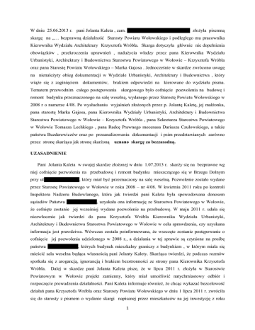 W dniu 25.06.2013 r. pani Jolanta Kaleta , zam. Brzeg Dolny, ul. Naborowska 28 złoŜyła pisemną skargę na „… bezprawną działalność Starosty Powiatu Wołowskiego i podległego mu pracownika Kierownika Wydziału Architektury Krzysztofa Wróbla. Skarga dotyczyła głównie nie dopełnienia obowiązków , przekroczenia uprawnień , naduŜycia władzy przez pana Kierownika Wydziału Urbanistyki, Architektury i Budownictwa Starostwa Powiatowego w Wołowie – Krzysztofa Wróbla oraz pana Starostę Powiatu Wołowskiego – Marka Gajosa . Jednocześnie w skardze zwrócono uwagę na nienaleŜyty obieg dokumentacji w Wydziale Urbanistyki, Architektury i Budownictwa , który wiąŜe się z zaginięciem dokumentów, brakiem odpowiedzi na kierowane do wydziału pisma. Tematem przewodnim całego postępowania skargowego było cofnięcie pozwolenia na budowę i remont budynku przeznaczonego na salę weselną, wydanego przez Starostę Powiatu Wołowskiego w 2008 r o numerze 4/08. Po wysłuchaniu wyjaśnień złoŜonych przez p. Jolantę Kaletę, jej małŜonka, pana starostę Marka Gajosa, pana Kierownika Wydziały Urbanistyki, Architektury i Budownictwa Starostwa Powiatowego w Wołowie – Krzysztofa Wróbla , pana Sekretarza Starostwa Powiatowego w Wołowie Tomasza Lechkiego , pana Radcę Prawnego mecenasa Dariusza Czułowskiego, a takŜe państwa Buzderewiczów oraz po przeanalizowaniu dokumentacji i psim przedstawianych zarówno przez stronę skarŜąca jak stronę skarŜoną uznano skargę za bezzasadną. UZASADNIENIE Pani Jolanta Kaleta w swojej skardze złoŜonej w dniu 1.07.2013 r. skarŜy się na bezprawne wg niej cofnięcie pozwolenia na przebudowę i remont budynku mieszczącego się w Brzegu Dolnym przy ul. Naborowskiej 20, który miał być przeznaczony na salę weselną. Pozwolenie zostało wydane przez Starostę Powiatowego w Wołowie w roku 2008 – nr 4/08. W kwietniu 2011 roku po kontroli Inspektora Nadzoru Budowlanego, która jak twierdzi pani Kaleta była spowodowana donosem sąsiadów Państwa Buzderewiczów, uzyskała ona informację ze Starostwa Powiatowego w Wołowie, Ŝe cofnięte zostanie jej wcześniej wydane pozwolenie na przebudowę. W maju 2011 r. udała się niezwłocznie jak twierdzi do pana Krzysztofa Wróbla Kierownika Wydziału Urbanistyki, Architektury i Budownictwa Starostwa Powiatowego w Wołowie w celu sprawdzenia, czy uzyskana informacja jest prawdziwa. Wówczas została poinformowana, Ŝe wszczęte zostanie postępowanie o cofnięcie jej pozwolenia udzielonego w 2008 r., a działania w tej sprawie są czynione na prośbę państwa Buzderewiczów, których budynek mieszkalny graniczy z budynkiem , w którym miała się mieścić sala weselna będąca własnością pani Jolanty Kalety. SkarŜąca twierdzi, Ŝe podczas rozmów spotkała się z arogancją, ignorancją i brakiem bezstronności ze strony pana Kierownika Krzysztofa Wróbla. Dalej w skardze pani Jolanta Kaleta pisze, Ŝe w lipcu 2011 r. złoŜyła w Starostwie Powiatowym w Wołowie projekt zamienny, który miał umoŜliwić natychmiastowy odbiór i rozpoczęcie prowadzenia działalności. Pani Kaleta informuje równieŜ, Ŝe chcąc wykazać bezcelowość działań pana Krzysztofa Wróbla oraz Starosty Powiatu Wołowskiego w dniu 1 lipca 2011 r. zwróciła się do starosty z pismem o wydanie skargi napisanej przez mieszkańców na jej inwestycję z roku 1 2009, co jak twierdzi uniemoŜliwiłoby wszczęcie przez starostę postępowania. Twierdzi, Ŝe dokument wg jej wiedzy znajdował się w Archiwum Starostwa Powiatowego w Wołowie i został przed nią zatajony, a wydany został rok później w kwietniu 2012 roku po wydaniu decyzji starosty o uchyleniu pozwolenia na budowę. Pani Kaleta twierdzi, Ŝe w sierpniu2011 r. Starosta Powiatu Wołowskiego wszczął postępowanie prowadzone przez dwa lata bez podstawy prawnej, a osobą upowaŜnioną do jego prowadzenia był pan Kierownik Krzysztof Wróbel. W dalszej części skargi pani Jolanta Kaleta sporządziła pisemny wykaz skandalicznych według niej błędów Starosty, wymieniając jednak w większości błędy i zaniedbania w prowadzeniu sprawy przez pana Kierownika Krzysztofa Wróbla, który według skarŜącej ”… przekroczył swoje uprawnienia, naruszając jednocześnie zasadę bezstronności, będąc osobą niekompetentną do ustalania granic działek, nie dopełnił swoich obowiązków, nie dokładając naleŜytych starań i niedbale dokumentując prowadzone postępowanie, naduŜył władzy i przekroczył swoje uprawnienia wplątując nas w sprawy karne, które nas w ogóle nie dotyczyły…”. Natomiast pan Starosta Powiatowy „…nie dopełnił swoich obowiązków, nie przeprowadził wymaganego przez KPA pierwszego etapu postępowania, nie sprawdził czy wznowienie tego postępowania jest dopuszczalne. Bezprawnie wszczynając i prowadząc przez pobad1/5 roku postępowanie naraził mnie na ogromne straty finansowe i moralne. W dalszej treści skargi pani Jolanta Kaleta zarzuca Panu staroście Powiatu Wołowskiego, Ŝe „ … naduŜył władzy i nie dopełnił obowiązków i poniewaŜ zgodnie z art. 97 &1 pkt. 4 KPA zawieszenie postępowania na podst. zamiaru złoŜenia wniosku przez stronę, która na dodatek nie jest inicjatorem postępowania jest niedopuszczalne. MoŜe to nastąpić tylko i wyłącznie z urzędu. ( naruszenie art. 7, 12 i 77 & 1 KPA)…” Wg skarŜącej „…zeznania Starosty i Kierownika Wydziału na Policji koncentrują się na biedzie i depresji dziecka państwa Buzderewicz. Natomiast „… całe bezprawnie wszczęte postępowanie Starosty naraziło mnie na ogromne straty….”. Pani Kaleta informuje równieŜ, Ŝe wszystkie wydane przez dwa lata decyzje Starosty Powiatu zostały uznane przez urzędników Wojewody i WSA za niezgodne z prawem i wszystkie zostały uchylone. Informuje takŜe , Ŝe wg niej w Starostwie giną dokumenty. Swoją obszerną pisemną skargę pani Jolanta Kaleta kończy informacją, 