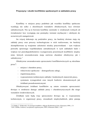 Przyczyny i skutki konfliktów społecznych w zakładzie pracy Konflikty w miejscu pracy podobnie jak wszelkie konflikty społeczne wynikają nie tylko z określonych warunków obiektywnych, lecz również subiektywnych. Nie są to bowiem konflikty zaistniałe w strukturach wolnych od świadomości lecz występują one pomiędzy istotami myślącymi i zdolnymi do uczuciowych zaangażowań. Im więcej dokonuje się podziałów pracy, im bardziej złożone stają się zakłady pracy oraz procesy technologiczne w nich realizowane, im bardziej skomplikowane są wzajemne zależności miedzy pracownikami – tym większa potrzeba sprawnego współdziałania zatrudnionych w tych zakładach ludzi i większe też prawdopodobieństwo występowania przeróżnych konfliktów między nimi, których uwarunkowania mają zarówno charakter obiektywny jak i subiektywny. 1 Obiektywne uwarunkowania sprzeczności konfliktotwórczych są określane przez2: - miejsce i charakter pracy, - właściwości społeczno – demograficzne załogi, - organizacją pracy, - wyposażeniem technicznym zakładu i konkretnych stanowisk pracy, - systemem wynagrodzeń oraz innych bodźców ekonomicznych jak źródłami pozaekonomicznymi. Obiektywnymi źródłami konfliktów są zatem rozmaite sprzeczności tkwiące w strukturze danego zakładu pracy i charakterystycznych dla niego warunków środowiskowych. Źródłami tymi będą więc sprzeczności tkwiące np. w wyposażeniu technicznym, w organizacji pracy, stosunkach międzyludzkich, jakie panują 1 2 S. Chełpa, T. Witkowski, Psychologia konfliktów, Oficyna Wydawnicza Unus, Warszawa 1999, s. 31 R.W. Griffin, Podstawy zarządzania organizacjami, PWN, Warszawa 2004, s. 545 wśród załogi, systemie wynagrodzeń, a także w trudnościach kierownictwa przy ocenianiu pracowników z powodu braku dostatecznie zobiektywizowanych kryteriów oceny, zwłaszcza pozwalających na względnie ścisłe ustalenie rzeczywistego udziału danego człowieka w realizacji żądanej pracy. Do tego, aby sytuacja taka urzeczywistniała się tzn. doprowadziła do wybuchu konfliktu konieczne są oprócz warunków obiektywnych także subiektywne. Warunki subiektywne mają nie mniej złożony charakter. Zaliczmy do nich przede wszystkim psychospołeczne właściwości ludzi stanowiących załogę a więc ich świadomość, morale, kwalifikacje zawodowe, wyrobienie społeczne, cechy poszczególnych pracowników, które determinują ich postawy i zachowania. Podłożem konfliktu w miejscu pracy są przeciwstawne lub po prostu rozbieżne interesy, jakie reprezentują poszczególni pracownicy w miejscu pracy. Lecz każdy z tych pracowników jeżeli nawet tylko sam jest uwikłany w zaistniały konflikt nie jest przecież wyobcowany z życia społecznego, należy do pewnych grup charakterystycznych dla danego społeczeństwa, do zbiorowości jakie występują zarówno w miejscu pracy jak poza nim. 3 Konflikty w zakładach pracy występują wewnątrz swoistej sprzeczności jaką jest załoga danego zakładu pracy. W obrębie tej sprzeczności można zauważyć dwa zasadniczo odmienne i podstawowe typy grup społecznych: grupy celowe czyi stawione, zwane także formalnymi i grupy spontaniczne czyli nieformalne. Konflikt w organizacji jest elementem stale obecnym i niemożliwym do całkowitego wyeliminowania. Jeżeli uznajemy, że wprowadzanie zmian i przystosowanie się ma coraz większe znaczenie to musimy również uznać za konieczne sterowanie konfliktami. Celem jest wykorzystanie i konstruktywne sterowanie konfliktami a nie ich tłumienie lub unikanie. Źródeł konfliktów upatrywać można w błędach popełnianych przy rozwiązywaniu problemów powstających na przecięciu tych dwóch nieuniknionych procesów: integracji i dyferencjacji. 3 R.W. Griffin, Podstawy zarządzania organizacjami…, op. cit., s. 550 2 Przyjęcie takiego założenia prowadzi ich do stwierdzenia, że konflikt musi być akceptowany jako ciągle obecny rezultat życia w złożonej cywilizacji. Rozwiązywanie konfliktu nie jest ostatecznym krokiem, ale pewnym sensownym rozstrzygnięciem dzisiejszych kwestii ze świadomością, że podstawowe i uprawnione różnice będą generowały nowe konflikty, które trzeba będzie rozwiązywać jutro. Patrząc z tej perspektywy, kierownicy będą mogli swobodniej uczestniczyć w projektowaniu procedur i metod najbardziej odpowiednich dla toku postępowania w kwestiach konfliktowych. Efektywny system rozwiązywania konfliktów jest, podobnie jak efektywny system podejmowania decyzji, centralnym problemem funkcjonowania organizacji. Źródłem konfliktu może być również ubieganie się o dobra oraz odmienne postawy. Konflikt odgrywa konstruktywną rolę wtedy, gdy powoduje wzrost motywacji i energii, które można wykorzystać do realizacji celów organizacji, sprzyja innowacyjności, dzięki możliwości ujawnienia różnych punktów widzenia, strony konfliktu mogą lepiej zrozumieć jego istotę, ponieważ muszą zdefiniować swoje stanowisko i wysunąć argumenty uzasadniające. 4 Konflikty w miejscu pracy są szczególnymi przypadkami ogólniejszych zjawisk, jakimi są konflikty społeczne. Konflikty w miejscu pracy przejawiają się nie tylko w tak drastycznych i widocznych postaciach jakimi są np. strajki i bunty. Występują one także w licznych, mniej widocznych, czy nawet ukrytych formach i zachowaniach, jak np. w biernym oporze, który znajduje wyraz w m.in. lekceważeniu lub cichym bojkocie zarządzeń kierownictwa, w opieszałości i niedbalstwie przy wykonywaniu poleceń służbowych, w przeróżnych rozróbach. Podstawy te i zachowania w konsekwencji są nie mniej ważne dla prawidłowego funkcjonowania zakładu pracy. Uważa, że następstwa konfliktów są często dysfunkcjonalne, ponieważ tracona jest energia, która powinna być wykorzystana do realizacji celów realizacyjnych. Konflikt w różnym stopniu przyczynia się do efektywności organizacji lub jej szkodzi.
