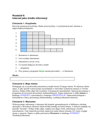 Rozdział 9. Internet jako źródło informacji Ćwiczenie 1. Krzyżówka Rozwiąż poniższą krzyżówkę. Hasło utworzą litery z wyróżnionych pól, ułożone w odpowiedniej kolejności. 1. 2. 3. 4. 5. 6. 1. Rozmowa w Internecie. 2. List wysłany Internetem. 3. Internetowy savoir vivre. 4. Co można dołączyć do listu e-mail? 5. ... programu. 6. Przy pomocy programu Skype można prowadzić ... w Internecie. Hasło: Ćwiczenie 2. Moje miasto Posługując się wyszukiwarką internetową znajdź stronę Twojego miasta. W edytorze tekstu opisz, w jaki sposób wykorzystuje się komputer w dowolnie wybranym miejscu w Twoim mieście. Dołącz kilka zdjęć lub rysunków wykonanych samodzielnie. Opracuj prezentację w programie do tworzenia prezentacji multimedialnych. Zapisz dokument w pliku miasto w katalogu INTERNET, a prezentację w katalogu PREZENTACJE. Zaprezentuj kolegom i koleżankom z klasy prezentację multimedialną, wydrukuj dokument tekstowy. Ćwiczenie 3. Warszawa Wykorzystując informacje z Internetu lub książek zgromadzonych w bibliotece szkolnej sporządź w dowolnym edytorze tekstu krótką notatkę na temat miasta, w którym znajduje się pomnik "Syrenki". Dołącz kilka zdjęć, mapkę oraz flagę i herb, informację o liczbie mieszkańców. Cały materiał powinien zajmować jeden arkusz formatu A4 i mieć wygląd strony w gazecie. Zapisz w pliku pod nazwą Warszawa w katalogu INTERNET. Wydrukuj dokument. Ćwiczenie 4. ZOO we Wrocławiu Odszukaj w Internecie lub bibliotece szkolnej informacje o ZOO we Wrocławiu. Odpowiedz na pytanie, kiedy powstało i kto był jego założycielem? Sporządź krótką notatkę w dowolnym edytorze tekstu. Wykorzystaj jak najwięcej możliwości programu tak, aby dokument przyciągał wzrok i zainteresował osoby go czytające. Dokument zapisz w katalogu INTERNET pod nazwą zoo. Wydrukuj dokument. Ćwiczenie 5. Ciekawe strony WWW W dowolnym edytorze tekstu sporządź tabelkę według wzoru i wpisz do niej najciekawsze wg ciebie strony WWW o różnej tematyce. Opisz w kilku słowach, co zawierają. Adres WWW Informacje o stronie Zapisz dokument w pliku moje www w katalogu INTERNET. Wydrukuj. Możesz umieścić zrzuty ekranów przy wybranych opisach stron internetowych. Wskazówka: str.101 podręcznika. Ćwiczenie 6. Góry Stołowe Korzystając z dowolnej wyszukiwarki znajdź informacje na temat Gór Stołowych. Przygotuj prezentację multimedialną w odpowiednim programie. Przedstaw informacje o położeniu, najwyższych szczytach tych gór oraz znajdujących się tam uzdrowiskach i miejscowościach wypoczynkowych. Zachęć do odwiedzenia tego pięknego zakątka Polski. Umieść w prezentacji przyciski służące do ręcznego sterowania przebiegiem pokazu. Zapisz dokument w pliku o nazwie góry w katalogu INTERNET. Wydrukuj — 6 slajdów na stronie. Ćwiczenie 7. Piszemy e-mail Uruchom dowolny program pocztowy i napisz list do autorki podręcznika. Wyślij go na adres [email protected]. Do listu dołącz Twoją najpiękniejszą pracę wykonaną w trakcie roku szkolnego. Nie zapomnij się podpisać. Nadaj listowi atrakcyjną formę, pisząc go na ozdobnej kartce (papeterii). Ćwiczenie 8. Netykieta Zapoznaj się z zasadami netykiety oraz zasadami bezpiecznego korzystania z Internetu zamieszczonymi na stronie www.dzieckowsieci.pl. Sporządź w dowolnym edytorze tekstu dokument na ten temat. Zapisz dokument w pliku zasady w katalogu INTERNET. Wydrukuj.