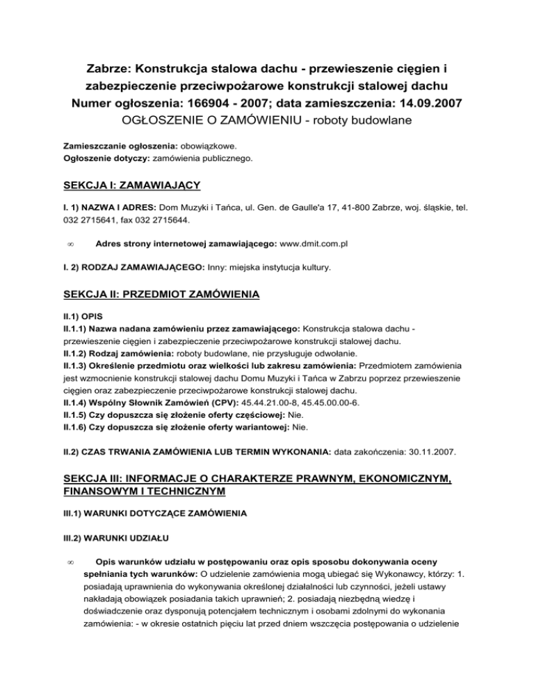 Zabrze: Konstrukcja stalowa dachu - przewieszenie cięgien i zabezpieczenie przeciwpoŜarowe konstrukcji stalowej dachu Numer ogłoszenia: 166904 - 2007; data zamieszczenia: 14.09.2007 OGŁOSZENIE O ZAMÓWIENIU - roboty budowlane Zamieszczanie ogłoszenia: obowiązkowe. Ogłoszenie dotyczy: zamówienia publicznego. SEKCJA I: ZAMAWIAJĄCY I. 1) NAZWA I ADRES: Dom Muzyki i Tańca, ul. Gen. de Gaulle'a 17, 41-800 Zabrze, woj. śląskie, tel. 032 2715641, fax 032 2715644. • Adres strony internetowej zamawiającego: www.dmit.com.pl I. 2) RODZAJ ZAMAWIAJĄCEGO: Inny: miejska instytucja kultury. SEKCJA II: PRZEDMIOT ZAMÓWIENIA II.1) OPIS II.1.1) Nazwa nadana zamówieniu przez zamawiającego: Konstrukcja stalowa dachu przewieszenie cięgien i zabezpieczenie przeciwpoŜarowe konstrukcji stalowej dachu. II.1.2) Rodzaj zamówienia: roboty budowlane, nie przysługuje odwołanie. II.1.3) Określenie przedmiotu oraz wielkości lub zakresu zamówienia: Przedmiotem zamówienia jest wzmocnienie konstrukcji stalowej dachu Domu Muzyki i Tańca w Zabrzu poprzez przewieszenie cięgien oraz zabezpieczenie przeciwpoŜarowe konstrukcji stalowej dachu. II.1.4) Wspólny Słownik Zamówień (CPV): 45.44.21.00-8, 45.45.00.00-6. II.1.5) Czy dopuszcza się złoŜenie oferty częściowej: Nie. II.1.6) Czy dopuszcza się złoŜenie oferty wariantowej: Nie. II.2) CZAS TRWANIA ZAMÓWIENIA LUB TERMIN WYKONANIA: data zakończenia: 30.11.2007. SEKCJA III: INFORMACJE O CHARAKTERZE PRAWNYM, EKONOMICZNYM, FINANSOWYM I TECHNICZNYM III.1) WARUNKI DOTYCZĄCE ZAMÓWIENIA III.2) WARUNKI UDZIAŁU • Opis warunków udziału w postępowaniu oraz opis sposobu dokonywania oceny spełniania tych warunków: O udzielenie zamówienia mogą ubiegać się Wykonawcy, którzy: 1. posiadają uprawnienia do wykonywania określonej działalności lub czynności, jeŜeli ustawy nakładają obowiązek posiadania takich uprawnień; 2. posiadają niezbędną wiedzę i doświadczenie oraz dysponują potencjałem technicznym i osobami zdolnymi do wykonania zamówienia: - w okresie ostatnich pięciu lat przed dniem wszczęcia postępowania o udzielenie zamówienia, a jeŜeli okres prowadzenia działalności jest krótszy - w tym okresie wykonał nie mniej niŜ 1 robotę budowlaną obejmującą cięcie i spawanie konstrukcji stalowej o łącznej masie elementów konstrukcji objętych wszystkimi wykazanymi robotami budowlanymi obejmującymi cięcie i spawanie konstrukcji stalowej nie mniejszej niŜ 2 tony, - w okresie ostatnich pięciu lat przed dniem wszczęcia postępowania o udzielenie zamówienia, a jeŜeli okres prowadzenia działalności jest krótszy - w tym okresie wykonał nie mniej niŜ 1 robotę budowlaną obejmującą pokrywanie elementów konstrukcyjnych farbami ogniochronnymi pęczniejącymi o łącznej powierzchni elementów konstrukcji pokrywanych farbami ogniochronnymi pęczniejącymi objętych wszystkimi wykazanymi robotami budowanymi nie mniejszej niŜ 2000 m2, - dysponuje kierownikiem budowy (min. 1 osoba) - posiadającym uprawnienia budowlane do pełnienia samodzielnych funkcji technicznych w budownictwie zgodnie z ustawą z 7 lipca 1994 r. Prawo budowlane (t.j.: Dz. U. z 2006 r., Nr 156, poz. 1118 z późn. zm.) uprawniające do kierowania i nadzorowania robót w specjalności konstrukcyjno-budowlanej bez ograniczeń lub odpowiadające im waŜne uprawnienia, które zostały wydane na podstawie wcześniej obowiązujących przepisów, - dysponuje spawaczem (min. 1 osoba) - posiadającym uprawnienia spawalnicze do spawania elektrycznego i do spawania gazowego acetylenowo-tlenowego konstrukcji stalowych, przy czym Wykonawca moŜe zaproponować zarówno jedną osobę posiadającą uprawnienia spawalnicze do spawania elektrycznego i do spawania gazowego acetylenowo-tlenowego, jak i dwie osoby, z których jedna posiada uprawnienia spawalnicze do spawania elektrycznego, a druga posiada uprawnienia spawalnicze do spawania gazowego acetylenowo- tlenowego; 3. znajdują się w sytuacji ekonomicznej i finansowej zapewniającej wykonanie zamówienia: - Wykonawca posiada środki finansowe lub zdolność kredytową w wysokości nie mniejszej niŜ 100 000,00 PLN; 4. nie podlegają wykluczeniu z postępowania o udzielenie zamówienia. JeŜeli Wykonawca ma siedzibę lub miejsce zamieszkania poza terytorium Rzeczypospolitej Polskiej, stosuje się do przepisów § 2 Rozporządzenia Prezesa Rady Ministrów z dnia 19.05.2006 r. w sprawie rodzajów dokumentów, jakich moŜe Ŝądać zamawiający od wykonawcy oraz form, w jakich te dokumenty mogą być składane (Dz. U. Nr 87 poz. 605). Zamawiający oceni spełnienie przez Wykonawcę warunków udziału w postępowaniu stwierdzeniem: spełnia lub nie spełnia, w oparciu o • wymagane dokumenty i zawarte w nich informacje. Informacja o oświadczeniach i dokumentach, jakie mają dostarczyć wykonawcy w celu potwierdzenia spełniania warunków udziału w postępowaniu: W celu potwierdzenia, iŜ Wykonawca posiada uprawnienia do wykonywania określonej działalności lub czynności oraz nie podlega wykluczeniu na podstawie art. 24 Pzp, Wykonawca przedkłada: A) aktualny odpis z właściwego rejestru albo aktualne zaświadczenie o wpisie do ewidencji działalności gospodarczej, jeŜeli odrębne przepisy wymagają wpisu do rejestru lub zgłoszenia do ewidencji działalności gospodarczej, wystawiony nie wcześniej niŜ 6 miesięcy przed upływem terminu składania ofert. W celu potwierdzenia, iŜ Wykonawca posiada niezbędną wiedzę i doświadczenie oraz dysponuje potencjałem technicznym i osobami zdolnymi do wykonania zamówienia, Wykonawca przedkłada: A) wykaz zawierający: - nie mniej niŜ 1 robotę budowlaną obejmującą cięcie i spawanie konstrukcji stalowej o łącznej masie elementów konstrukcji objętych wszystkimi wykazanymi robotami budowlanymi obejmującymi cięcie i spawanie konstrukcji stalowej nie mniejszej niŜ 2 tony i - nie mniej niŜ 1 robotę budowlaną obejmującą pokrywanie elementó