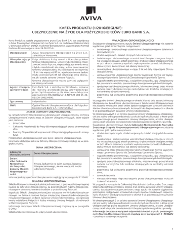 KARTA PRODUKTU (1/2016/EBGL/KP): UBEZPIECZENIE NA ŻYCIE DLA POŻYCZKOBIORCÓW EURO BANK S.A. Karta Produktu została przygotowana przez Euro Bank S.A. we współpracy z Aviva Towarzystwo Ubezpieczeń na Życie S.A. na podstawie Rekomendacji U dotyczącej dobrych praktyk w zakresie bancassurance, wydanej przez Komisję Nadzoru Finansowego w dniu 24.06.2014 r. Ubezpieczyciel Aviva Towarzystwo Ubezpieczeń na Życie S.A. z siedzibą w Warszawie. Ubezpieczający/ Pożyczkobiorca, który zawarł z Ubezpieczycielem Ubezpieczony Umowę Ubezpieczenia. Umowę Ubezpieczenia może zawrzeć osoba fizyczna, nieposiadająca prawa do renty z tytułu niezdolności do pracy, jeśli w dniu zawarcia Umowy Ubezpieczenia ma ukończone co najmniej 18 lat i nie więcej niż 80 lat, a jednocześnie nie będzie miała ukończonych 85 lat ostatniego dnia okresu, na jaki została zawarta Umowa Pożyczki. Umowę Ubezpieczenia można zawrzeć wyłącznie na własny rachunek. Agent Ubezpie- Euro Bank S.A. z siedzibą we Wrocławiu, wpisana czeniowy / Bank do rejestru przedsiębiorców prowadzonego przez Sąd Gospodarczy dla Wrocławia-Fabryczna pod numerem KRS 0000025313, NIP 521-008-25-38, REGON 006234590. Typ umowy Indywidualna OWU Ogólne Warunki Ubezpieczenia na Życie dla Pożyczkobiorców Euro Bank S.A. (1/2016/EBGL) ZAKRES OCHRONY UBEZPIECZENIOWEJ W ramach Umowy Ubezpieczenia udzielana jest Ubezpieczonemu Ochrona Ubezpieczeniowa z tytułu tego ze Zdarzeń Ubezpieczeniowych, które zajdzie jako pierwsze: – śmierć albo – Całkowita Niezdolność do Pracy (dla nieposiadających prawa do emerytury) albo – Znaczny Stopień Niepełnosprawności (dla posiadających prawo do emerytury). Przedmiotem ubezpieczenia jest więc życie i zdrowie Ubezpieczonego. Informacje dotyczące zakresu Ochrony Ubezpieczeniowej znajdują się w paragrafie 3 OWU. SUMA UBEZPIECZENIA Zdarzenie Ubezpieczeniowe Suma Ubezpieczenia Śmierć albo Całkowita Kwota Zadłużenia na dzień danego Zdarzenia Niezdolność Ubezpieczeniowego, ale nie więcej niż kwota do Pracy albo udzielonej Pożyczki. Znaczny Stopień Niepełnosprawności. Informacje dotyczące Sum Ubezpieczenia znajdują się w paragrafie 11 OWU. SKŁADKA UBEZPIECZENIOWA Składka Ubezpieczeniowa jest płatna jednorazowo, z góry w pełnej wymaganej kwocie za cały Okres Ubezpieczenia, za pośrednictwem Agenta Ubezpieczeniowego w dniu uruchomienia środków z tytułu Umowy Pożyczki. Wysokość Składki Ubezpieczeniowej jest wskazana we Wniosku Ubezpieczeniowym i w Polisie i stanowi iloczyn miesięcznej stawki składki ubezpieczeniowej obowiązującej w dacie zawarcia Umowy Ubezpieczenia, początkowej kwoty udzielonej Pożyczki i liczby miesięcy Umowy Pożyczki określonych w Harmonogramie Pożyczki. Informacje dotyczące Składki Ubezpieczeniowej znajdują się w paragrafie 6 OWU. Składka Ubezpieczeniowa to jedyny koszt ubezpieczenia. WYŁĄCZENIA ODPOWIEDZIALNOŚCI Świadczenie ubezpieczeniowe z tytułu Śmierci Ubezpieczonego nie zostanie wypłacone, jeżeli śmierć będzie następstwem: – świadomego i dobrowolnego uczestnictwa Ubezpieczonego w działaniach terrorystycznych; – działań wojennych, działań zbrojnych lub zamieszek; – świadomego i dobrowolnego uczestnictwa Ubezpieczonego w innych niż wskazane powyżej aktach przemocy, chyba że udział Ubezpieczonego w tych aktach przemocy wynikał z wykonywania czynności służbowych, stanu wyższej konieczności lub obrony koniecznej; – samobójstwa Ubezpieczonego w ciągu 2 lat od daty rozpoczęcia Okresu Ubezpieczenia; – uprawiania przez Ubezpieczonego Sportu Wysokiego Ryzyka lub Wyczynowego Uprawiania Sportu lub Zawodowego Uprawiania Sportu; – wypadku statku powietrznego, z wyjątkiem przypadku, gdy Ubezpieczony był pasażerem samolotu pasażerskiego licencjonowanych linii lotniczych; – spożycia przez Ubezpieczonego alkoholu, lub niezaleconego przez lekarza zażycia przez Ubezpieczonego narkotyków lub środków działających na centralny ośrodek nerwowy; – popełnienia lub usiłowania popełnienia przez Ubezpieczonego przestępstwa. W przypadku śmierci Ubezpieczonego w okresie 3 lat od dnia zawarcia Umowy Ubezpieczenia, świadczenie ubezpieczeniowe z tytułu śmierci Ubezpieczonego nie zostanie wypłacone, jeżeli śmierć będzie następstwem schorzeń lub innych stanów chorobowych rozpoznanych, leczonych lub diagnozowanych w okresie 5 lat poprzedzających zawarcie Umowy Ubezpieczenia. W okresie pierwszych 3 lat od dnia zawarcia Umowy Ubezpieczenia Ubezpieczyciel jest wolny od odpowiedzialności za skutki tych okoliczności, o które pytał Ubezpieczonego przed zawarciem Umowy Ubezpieczenia, a które Ubezpieczony zataił lub podał do wiadomości Ubezpieczyciela niezgodnie z prawdą. Świadczenie ubezpieczeniowe z tytułu Całkowitej Niezdolności do Pracy albo Znacznego Stopnia Niepełnosprawności Ubezpieczonego nie zostanie wypłacone, jeśli będzie następstwem: – działań terrorystycznych, działań wojennych, działań zbrojnych lub zamieszek; – świadomego i dobrowolnego uczestnictwa Ubezpieczonego w innych niż wskazane powyżej aktach przemocy, chyba że udział Ubezpieczonego w tych aktach przemocy wynikał z wykonywania czynności służbowych, stanu wyższej konieczności lub obrony koniecznej; – uprawiania przez Ubezpieczonego Sportu Wysokiego Ryzyka Wyczynowego Uprawiania Sportu lub Zawodowego Uprawiania Sportu; – wypadku statku powietrznego, z wyjątkiem przypadku, gdy Ubezpieczony był pasażerem samolotu pasażerskiego licencjonowanych linii lotniczych; – spożycia przez Ubezpieczonego alkoholu, niezaleconego przez lekarza zażycia narkotyków lub środków działających na centralny ośrodek nerwowy; – popełnienia lub usiłowania popełnienia przez Ubezpieczonego przestępstwa; –samookaleczenia; – nieuzasadnionego nieprzestrzegania przez Ubezpieczonego wskazań i zaleceń lekarskich. W przypadku wystąpienia Całkowitej Niezdolności do Pracy albo Z