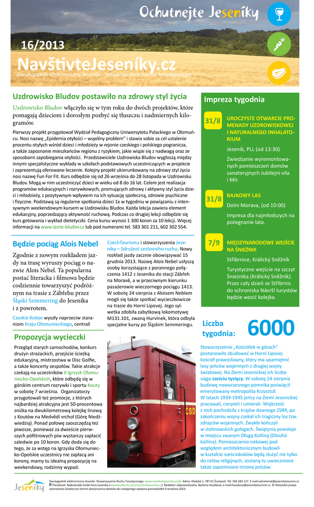 16/2013 NavštivteJeseníky.cz Dwutygodnik elektroniczny Jeseniki - Stowarzyszenie Ruchu Turystycznego Uzdrowisko Bludov postawiło na zdrowy styl życia Uzdrowisko Bludov włączyło się w tym roku do dwóch projektów, które pomagają dzieciom i dorosłym pozbyć się tłuszczu i nadmiernych kilogramów. Pierwszy projekt przygotował Wydział Pedagogiczny Uniwersytetu Palackiego w Ołomuńcu. Nosi nazwę „Epidemia otyłości – wspólny problem” i stawia sobie za cel ustalenie procentu otyłych wśród dzieci i młodzieży w rejonie czeskiego i polskiego pogranicza, a także zapoznanie mieszkańców regionu z ryzykiem, jakie wiąże się z nadwagą oraz ze sposobami zapobiegania otyłości. Przedstawiciele Uzdrowiska Bludov wygłoszą między innymi specjalistyczne wykłady w szkołach podstawowych uczestniczących w projekcie i zaprezentują oferowane leczenie. Kolejny projekt ukierunkowany na zdrowy styl życia nosi nazwę Fun For Fit. Kurs odbędzie się od 26 września do 28 listopada w Uzdrowisku Bludov. Mogą w nim uczestniczyć dzieci w wieku od 8 do 16 lat. Celem jest realizacja programów edukacyjnych i rozrywkowych, promujących zdrowy i aktywny styl życia dzieci i młodzieży, z pozytywnym wpływem na ich sytuację społeczną, zdrowie psychiczne i fizyczne. Podstawą są regularne spotkania dzieci 1x w tygodniu w powiązaniu z intensywnym weekendowym kursem w Uzdrowisku Bludov. Każda lekcja zawiera element edukacyjny, poprzedzający aktywność ruchową. Podczas co drugiej lekcji odbędzie się kurs gotowania i wykład dietetyczki. Cena kursu wynosi 1 300 koron za 10 lekcji. Więcej informacji na www.lazne-bludov.cz lub pod numerami tel. 583 301 211, 602 302 554. Będzie pociąg Alois Nebel Zgodnie z nowym rozkładem jazdy na trasę wyruszy pociąg o nazwie Alois Nebel. Ta popularna postać literacka i filmowa będzie codziennie towarzyszyć podróżnym na trasie z Zábřehu przez Śląski Semmering do Jeseníka i z powrotem. Czeskie Koleje wyszły naprzeciw staraniom Kraju Ołomunieckiego, centrali Propozycja wycieczki Przegląd starych samochodów, konkurs drużyn strażackich, przejście ścieżką edukacyjną, mistrzostwa w Disc Golfie, a także koncerty zespołów. Takie atrakcje czekają na uczestników II Igrzysk Ołomuniecko-Opolskich, które odbędą się w górskim centrum rozrywki i sportu Kouty w sobotę 7 września. Organizatorzy przygotowali też promocje, z których najbardziej atrakcyjna jest 50-procentowa zniżka na dwukilometrową kolejkę linową z Koutów na Medvědí vrchol (Górę Niedźwiedzią). Ponad połowę zaoszczędzą też piwosze, ponieważ za dwieście pierwszych półlitrowych piw wystarczy zapłacić zaledwie po 10 koron. Gdy doda się do tego, że za wstęp na Igrzyska Ołomuniecko-Opolskie uczestnicy nie zapłacą ani korony, mamy tu idealną propozycję na weekendowy, rodzinny wypad. CzechTourismu i stowarzyszenia Jeseníky – Sdružení cestovního ruchu. Nowy rozkład jazdy zacznie obowiązywać 15 grudnia 2013. Nazwę Alois Nebel usłyszą osoby korzystające z porannego połączenia 1412 z Jeseníka do stacji Zábřeh na Moravě, a w przeciwnym kierunku pasażerowie wieczornego pociągu 1413. W sobotę 24 sierpnia z Aloisem Neblem mogli się także spotkać wycieczkowicze na trasie do Horní Lipovej. Jego sylwetka zdobiła zabytkową lokomotywę M131.101, zwaną Hurvínek, która odbyła specjalne kursy po Śląskim Semmeringu. Impreza tygodnia 31/8 UROCZYSTE OTWARCIE PROMENADY UZDROWISKOWEJ I NATURALNEGO INHALATORIUM Jeseník, PLL (od 13:30) Zwiedzanie wyremontowanych pomieszczeń domów sanatoryjnych Jubilejní vila i Mír. 31/8 BAJKOWY LAS Dolní Morava, (od 10:00) Impreza dla najmłodszych na pożegnanie lata. 7/9 MIĘDZYNARODOWE WEJŚCIE NA ŚNIEŻNIK Stříbrnice, Králický Sněžník Turystyczne wejście na szczyt Śnieżnika (Králický Sněžník). Przez cały dzień ze Stříbrnic do schroniska Návrší turystów będzie wozić kolejka. Liczba tygodnia: 6000 Stowarzyszenie „Kościółek w górach” postanowiło zbudować w Horní Lipovej kościół prawosławny, który ma upamiętnić losy jeńców wojennych z drugiej wojny światowej. Na Ziemi Jesenickiej ich liczba sięga sześciu tysięcy. W sobotę 24 sierpnia budowę nowoczesnego pomnika poświęcił emerytowany metropolita Krzysztof. W latach 1939-1945 jeńcy na Ziemi Jesenickiej pracowali, cierpieli i umierali. Większość z nich pochodziła z krajów dawnego ZSRR, po zakończeniu wojny czekał ich tragiczny los tzw. zdrajców wojennych. Zwykle kończyli w stalinowskich gułagach. Świątynia powstaje w miejscu zwanym Długą Kotliną (Dlouhá kotlina). Pomieszczenia ciekawej pod względem architektonicznym budowli w kształcie sześcioboków będą służyć nie tylko do celów religijnych, zostaną tu uwiecznione także zapomniane imiona jeńców. Dwutygodnik elektroniczny Jeseniki- Stowarzyszenie Ruchu Turystycznego. www.navstivtejeseniky.cz/pl Adres: Kladská 1, 787 01 Šumperk. Tel: 583 283 117. E-mail:[email protected] Facebook: Nejkrásnější české hory-Jeseníky (www.facebook.com/navstivtejeseniky.cz). Redaktor odpowiedzialny: Barbora Haušková, e-mail:[email protected]. © Wszystkie prawa zastrzeżone.Ostateczny termin dostarczenia tekstów do następnego wydania poniedziałek 9 września 2013.