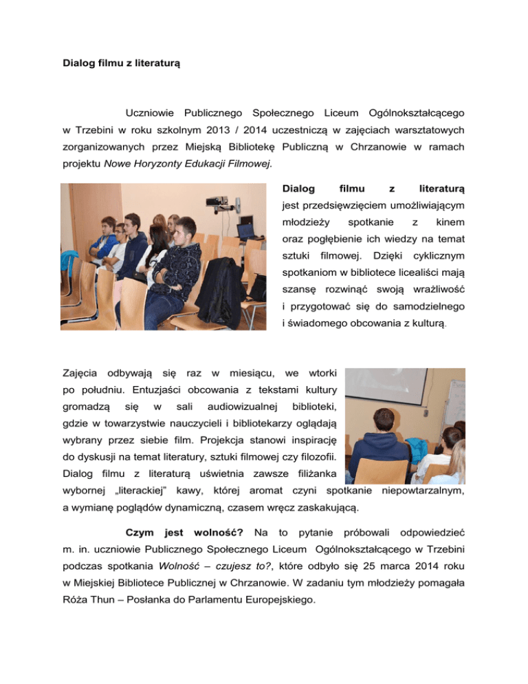 Dialog filmu z literaturą Uczniowie Publicznego Społecznego Liceum Ogólnokształcącego w Trzebini w roku szkolnym 2013 / 2014 uczestniczą w zajęciach warsztatowych zorganizowanych przez Miejską Bibliotekę Publiczną w Chrzanowie w ramach projektu Nowe Horyzonty Edukacji Filmowej. Dialog filmu z literaturą jest przedsięwzięciem umożliwiającym młodzieży spotkanie z kinem oraz pogłębienie ich wiedzy na temat sztuki filmowej. Dzięki cyklicznym spotkaniom w bibliotece licealiści mają szansę rozwinąć swoją wrażliwość i przygotować się do samodzielnego i świadomego obcowania z kulturą. Zajęcia odbywają się raz w miesiącu, we wtorki po południu. Entuzjaści obcowania z tekstami kultury gromadzą się w sali audiowizualnej biblioteki, gdzie w towarzystwie nauczycieli i bibliotekarzy oglądają wybrany przez siebie film. Projekcja stanowi inspirację do dyskusji na temat literatury, sztuki filmowej czy filozofii. Dialog filmu z literaturą uświetnia zawsze filiżanka wybornej „literackiej” kawy, której aromat czyni spotkanie niepowtarzalnym, a wymianę poglądów dynamiczną, czasem wręcz zaskakującą. Czym jest wolność? Na to pytanie próbowali odpowiedzieć m. in. uczniowie Publicznego Społecznego Liceum Ogólnokształcącego w Trzebini podczas spotkania Wolność – czujesz to?, które odbyło się 25 marca 2014 roku w Miejskiej Bibliotece Publicznej w Chrzanowie. W zadaniu tym młodzieży pomagała Róża Thun – Posłanka do Parlamentu Europejskiego. Podczas debaty oxfordzkiej licealiści argumentowali także za i przeciw ograniczeniom wolności jednostki w społeczeństwie. Spotkanie odbyło się w przez ramach akcji wydawnictwo Fundację Rozwoju Forum oraz realizowanej Zysk i Obywatelskiego Fundację Rozwoju Społeczeństwa Informacyjnego. * Zdjęcia dzięki uprzejmości MBP w Chrzanowie. S-ka,
