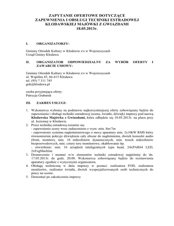 ZAPYTANIE OFERTOWE DOTYCZĄCE ZAPEWNIENIA I OBSŁUGI TECHNIKI ESTRADOWEJ KŁODAWSKIEJ MAJÓWKI Z GWIAZDAMI 18.05.2013r. I. ORGANIZATORZY: Gminny Ośrodek Kultury w Kłodawie z/s w Wojcieszycach Urząd Gminy Kłodawa II. ORGANIZATOR ODPOWIEDZIALNY ZAWARCIE UMOWY: ZA WYBÓR OFERTY I Gminny Ośrodek Kultury w Kłodawie z/s w Wojcieszycach ul. Wspólna 45, 66-415 Kłodawa tel. (95) 7 311 745 [email protected] osoba przyjmująca oferty: Patrycja Grabarek III. ZAKRES USŁUGI: 1. Wykonawca wybrany na podstawie najkorzystniejszej oferty zobowiązany będzie do zapewnienia i obsługi techniki estradowej (scena, światło, dźwięk) imprezy pod nazwą Kłodawska Majówka z Gwiazdami, która odbędzie się 18.05.2013r. na placu przy ul. Jeziornej w Kłodawie. 2. Przez technikę estradową rozumie się: - zapewnienie sceny wraz zadaszeniem o wym. min. 8m/7m - zapewnienie systemu nagłośnieniowego o mocy aparatury min. 2x10kW RMS który równomiernie pokryje dźwiękiem cały obszar do nagłośnienia, dwóch konsolet audio (front, monitor), min. 10 mikrofonów dynamicznych, min. trzech mikrofonów bezprzewodowych, min. cztery tory monitorowe, okablowanie itp. - oświetlenie: min. 16 urządzeń inteligentnych typu head, 24xPAR64 LED, 2xFogMachine 3. Dostarczenie i montaż w/w elementów techniki estradowej najpóźniej do dn. 17.05.2013r. do godz. 20.00. Wykonawca zobowiązany będzie do rozstawienia aparatury zgodnie z wytycznymi organizatora. 4. Obsługę techniczną w dniu imprezy w postaci: realizatora FOH, realizatora monitorów, realizator światła, dwóch wyspecjalizowanych osób technicznych do pracy na scenie. 5. Demontaż po zakończeniu imprezy IV. Warunki udziału Wykonawców w postępowaniu. O obsługę i zapewnienie techniki estradowej mogą się ubiegać Wykonawcy, którzy: 1. Złożą ofertę zgodną z zakresem zamówienia oraz terminem jej złożenia 2. Posiadają uprawnienia do wykonywania określonej działalności, oraz wiedzę i doświadczenie w tego typu usługach, dysponują potencjałem technicznym i osobami zdolnymi do wykonania zamówienia. 3. Znajdują się w sytuacji ekonomicznej i finansowej zapewniającej wykonanie zamówienia. 4. Zamawiający nie wymaga wnoszenia wadium. V. Opis sposobu i kryteria oceniania ofert. 1. Cena usługi – 50% 2. Jakość urządzeń i doświadczenie w świadczeniu tego rodzaju usług – 50% VI. Termin i miejsce składanie ofert. 1. Oferty należy składać w siedzibie Zamawiającego osobiście, bądź drogą pocztową w zamkniętych kopertach z dopiskiem – „ Kłodawska Majówka z Gwiazdami – technika estradowa”. 2. Termin składania ofert upływa 16.04.2013r.. o godz. 15.00 (data dostarczenia oferty) 3. Otwarcie ofert odbędzie się 17.04.2013r. o godz. 10.00 w Urzędzie Gminy Kłodawa. 4. Zamawiający dokona wyboru najkorzystniejszej oferty w przeciągu trzech dni roboczych od daty otwarcia ofert. 5. O wynikach postępowania Oferenci zostaną powiadomieni pisemnie oraz na stronie internetowej www.gok.klodawa.pl. Podmiot, którego oferta zostanie wybrana otrzyma również informacje telefoniczną, bezpośrednio po rozstrzygnięciu konkursu. 6. Jeżeli żadna z ofert nie będzie spełniała oczekiwań Zamawiającego, zastrzega on sobie możliwość zamknięcia konkursu bez wybrania oferty i zawarcia umowy z dowolnie wybranym przez siebie podmiotem. VII. Informacje dotyczące przygotowania oferty. 1. Wykonawca powinien zapoznać się z warunkami wymienionymi w zapytaniu. 2. Wykonawca musi złożyć ofertę w miejscu i terminie wyznaczonym przez Zamawiającego. 3. Oferta musi być sporządzona czytelnie, w języku polskim napisana na maszynie do pisania lub komputerze oraz opatrzona pieczątką Wykonawcy i podpisana przez upoważnione osoby. Oferta musi zawierać nr telefonu. 4. Jeśli oferentem jest spółka cywilna bądź oferta musi być podpisana przez wszystkich wspólników tej spółki a do oferty powinna być dołączona umowa spółki. 5. Ofert należy złożyć w zamkniętym opakowaniu lub kopercie zabezpieczoną w sposób gwarantujący zachowanie poufności jej treści. Dyrektor GOK Jarosław Pikuła