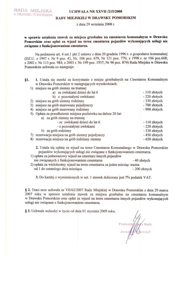 RADA MIEJSKA w DRAWSKU POMORSKIM UCHWAŁA NR XXVII /215/2008 RADY MIEJSKIEJ W DRAWSKU POMORSKIM z dnia 29 września 2008 r. w sprawie ustalenia stawek za miejsca grzebalne na cmentarzu komunalnym w Drawsku Pomorskim oraz opłat za wjazd na teren cmentarza pojazdów wykonujących usługi nie związane z funkcjonowaniem cmentarza. Na podstawie art. 4 ust. l pkt 2 ustawy z dnia 20 grudnia 1996 r. o gospodarce komunalnej (DZ.U. z 1997 r. Nr 9 póz. 43, Nr. 106 póz. 679, Nr 121 póz. 770; z 1998 r. nr 106 poz.668; z 2002 r. Nr 113 póz. 984; z 2003 r. Nr 199 póz. 1937; Nr 96 póz. 874) Rada Miejska w Drawsku Pomorskim uchwala co następuje: 1) 2) 3) 4) 5) 7) 8) 1. Ustala się stawki za korzystanie z miejsc grzebalnych na Cmentarzu Komunalnym w Drawsku Pomorskim w następujących wysokościach: miejsce na grób ziemny na trumnę: a) ze zwłokami dzieci do lat 6 -110 złotych b) z pozostałymi zwłokami - 220 złotych miejsce na grób ziemny rodzinny - 330 złotych miejsce na grób murowany pojedynczy - 700 złotych miejsce na grób murowany rodzinny - 900 złotych Opłata za przedłużenie miejsca pochówku na dalsze 20 lat: a) za grób ziemny na trumnę - ze zwłokami dzieci do lat 6 - 110 złotych - z pozostałymi zwłokami - 220 złotych b) za grób rodzinny - 330 złotych rezerwacja miejsca na grób ziemny pojedynczy -450 złotych rezerwacja miejsca na grób rodzinny ziemny - 650 złotych 2. Ustala się opłatę za wjazd na teren Cmentarza Komunalnego w Drawsku Pomorskim pojazdów wykonujących usługi nie związane z funkcjonowaniem cmentarza. 1) opłata za jednorazowy wjazd na cmentarz innych pojazdów nie związanych z funkcjonowaniem cmentarza - 40 złotych 2) opłata za wielokrotny wjazd na teren cmentarza za jeden miesiąc ważna od l do ostatniego dnia miesiąca - 200 złotych 3. Do każdej z wymienionych w ust. l stawek doliczony jest 7% podatek VAT. § 2. Traci moc uchwała nr YII/62/2007 Rady Miejskiej w Drawsku Pomorskim z dnia 29 marca 2007 roku w sprawie ustalenia stawek za miejsca grzebalne na cmentarzu komunalnym w Drawsku Pomorskim oraz opłat za wjazd na teren cmentarza innych pojazdów wykonujących usługi nie związane z funkcjonowaniem cmentarza. § 3. Uchwała wchodzi w życie od dnia 01 stycznia 2009 roku.