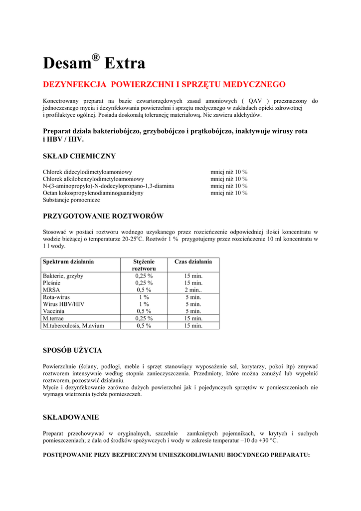 Desam® Extra DEZYNFEKCJA POWIERZCHNI I SPRZĘTU MEDYCZNEGO Koncetrowany preparat na bazie czwartorzędowych zasad amoniowych ( QAV ) przeznaczony do jednoczesnego mycia i dezynfekowania powierzchni i sprzętu medycznego w zakładach opieki zdrowotnej i profilaktyce ogólnej. Posiada doskonalą tolerancję materiałową. Nie zawiera aldehydów. Preparat działa bakteriobójczo, grzybobójczo i prątkobójczo, inaktywuje wirusy rota i HBV / HIV. SKŁAD CHEMICZNY Chlorek didecylodimetyloamoniowy Chlorek alkilobenzylodimetyloamoniowy N-(3-aminopropylo)-N-dodecylopropano-1,3-diamina Octan kokospropylenodiaminoguanidyny Substancje pomocnicze mniej niŜ 10 % mniej niŜ 10 % mniej niŜ 10 % mniej niŜ 10 % PRZYGOTOWANIE ROZTWORÓW Stosować w postaci roztworu wodnego uzyskanego przez rozcieńczenie odpowiedniej ilości koncentratu w wodzie bieŜącej o temperaturze 20-25oC. Roztwór 1 % przygotujemy przez rozcieńczenie 10 ml koncentratu w 1 l wody. Spektrum działania Bakterie, grzyby Pleśnie MRSA Rota-wirus Wirus HBV/HIV Vaccinia M.terrae M.tuberculosis, M.avium StęŜenie roztworu 0,25 % 0,25 % 0,5 % 1% 1% 0,5 % 0,25 % 0,5 % Czas działania 15 min. 15 min. 2 min.. 5 min. 5 min. 5 min. 15 min. 15 min. SPOSÓB UśYCIA Powierzchnie (ściany, podłogi, meble i sprzęt stanowiący wyposaŜenie sal, korytarzy, pokoi itp) zmywać roztworem intensywnie według stopnia zanieczyszczenia. Przedmioty, które moŜna zanuŜyć lub wypełnić roztworem, pozostawić działaniu. Mycie i dezynfekowanie zarówno duŜych powierzchni jak i pojedynczych sprzętów w pomieszczeniach nie wymaga wietrzenia tychŜe pomieszczeń. SKŁADOWANIE Preparat przechowywać w oryginalnych, szczelnie zamkniętych pojemnikach, w krytych i suchych pomieszczeniach; z dala od środków spoŜywczych i wody w zakresie temperatur –10 do +30 °C. POSTĘPOWANIE PRZY BEZPIECZNYM UNIESZKODLIWIANIU BIOCYDNEGO PREPARATU: Małe ilości środka aplikować zgodnie z instrukcją producenta, większą ilość oddać do likwidacji uprawnionym firmom. LIKWIDACJA OPAKOWAŃ: Puste opakowania po dokładnym wypłukaniu oddać do recyklingu. ZAWARTOŚĆ OPAKOWANIA: 1 L, 5 kg ….(rok)-..(měsíc)-..(den) xxxxxxxxxxx BOCHEMIE, s.r.o., Lidicka 326, CZ – 735 95 Bohumin, tel. +420596 091 111, ww.bochemie.cz DYSTRYBUCJA: BOCHEMIE POLAND Sp.z o.o., 40-246 KATOWICE, ul. Porcelanowa 10 tel.: 032 608 22 33, fax: 032 353 83 52 ŚRODKI OSTROśNOŚCI R 22 Działa szkodliwie po połknięciu R 34 Powoduje oparzenia S 1/2 Przechowywać pod zamknięciem i chronić przed dziećmi S 26 Zanieczyszczone oczy przemyć natychmiast duŜą ilością wody i zasięgnąć porady lekarza S 28 Zanieczyszczoną skórę natychmiast przemyć duŜą ilością wody S 36/37/39 Nosić odpowiednią odzieŜ ochronną, odpowiednie rękawice ochronne i okulary lub ochronę twarzy S 45 W przypadku awarii lub jeŜeli źle się poczujesz, niezwłocznie zasięgnij porady lekarza – jeŜeli to moŜliwe, pokaŜ etykietę S 46 W razie połknięcia, niezwłocznie zasięgnij porady lekarza-pokaŜ opakowanie lub etykietę S 61 Unikać zrzutów do środowiska. Postępować zgodnie z instrukcją lub kartą charakterystyki S 62 W razie połknięcia nie wywoływać wymiotów; niezwłocznie zasięgnąć porady lekarza DATA PRODUKCJI I OKRES WAśNOŚCI: Pozwolenie Ministerstwa Zdrowia nr 0628/04. C Preparat Ŝrący UN 1760 EAN 859 400 539 222 9 – 1 l 859 400 539 224 3 – 5 kg