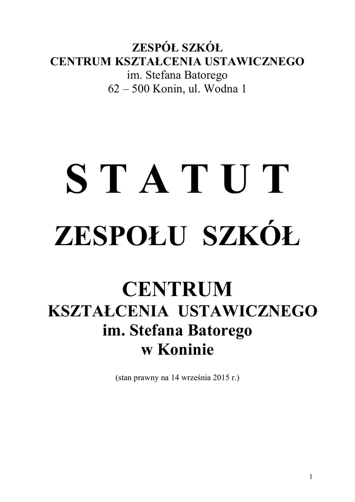 ZESPÓŁ SZKÓŁ CENTRUM KSZTAŁCENIA USTAWICZNEGO im. Stefana Batorego 62 – 500 Konin, ul. Wodna 1 STATUT ZESPOŁU SZKÓŁ CENTRUM KSZTAŁCENIA USTAWICZNEGO im. Stefana Batorego w Koninie (stan prawny na 14 września 2015 r.) 1 STATUT ZESPOŁU SZKÓŁ CENTRUM KSZTAŁCENIA USTAWICZNEGO im. Stefana Batorego w Koninie Obejmuje statuty: 1. Liceum Ogólnokształcącego, 2. Technikum, 3. Zasadniczej Szkoły Zawodowej, 4. Centrum Kształcenia Ustawicznego, w tym statuty: 1) Liceum Ogólnokształcącego dla Dorosłych, 2) uchylony 3) Gimnazjum dla Dorosłych, 4) Szkoły Policealnej dla Dorosłych Opracowano w oparciu o Ustawę o systemie oświaty z dnia 7 września 1991r. oraz obowiązujące rozporządzenia wykonawcze do tej ustawy. 2 ROZDZIAŁ Ι POSTANOWIENIA OGÓLNE §1 1. W skład Zespołu Szkół Centrum Kształcenia Ustawicznego w Koninie zwanego dalej „Zespołem” wchodzą: 1) szkoły ponadgimnazjalne dla młodzieży: a) Liceum Ogólnokształcące, b) Technikum, c) Zasadnicza Szkoła Zawodowa 2) Centrum Kształcenia Ustawicznego, w tym szkoły dla dorosłych: a) Liceum Ogólnokształcącego dla Dorosłych, b) uchylony c) uchylony d) uchylony e) Gimnazjum dla Dorosłych, f) Szkoły Policealnej dla Dorosłych 2. Zespół nosi nazwę: Zespół Szkół Centrum Kształcenia Ustawicznego im. Stefana Batorego w Koninie 3. Siedziba Zespołu mieści się w Koninie, ul. Wodna 1 . 4. Organem prowadzącym Zespół jest Urząd Miasta w Koninie. 5.Organem sprawującym nadzór pedagogiczny jest Wielkopolski Kurator Oświaty. 6. Zespół jest jednostką budżetową w rozumieniu ustawy o finansach publicznych. 3 ROZDZIAŁ ΙI CELE I ZADANIA ZESPOŁU §2 1. Cele i zadania poszczególnych szkół Zespołu zawarte są w Statutach szkół wchodzących w skład Zespołu. 2. Celem funkcjonowania Zespołu jest sprawne kierowanie i zarządzanie placówkami wchodzącymi w skład tego Zespołu oraz racjonalne wykorzystanie kadry pedagogicznej, pracowników administracji i obsługi oraz bazy lokalowej. ROZDZIAŁ ΙII ORGANY ZESPOŁU §3 1. Organami Zespołu Szkół CKU są: a) Dyrektor Zespołu, b) Rada Pedagogiczna, c) Samorząd Uczniowski, d) Samorząd Słuchaczy, e) Rada Rodziców, f) Rada Szkoły (o ile zostanie powołana) 2. Kompetencje Dyrektora Zespołu: 1) Dyrektor Zespołu jest jednocześnie Dyrektorem każdej ze szkół wchodzących w skład Zespołu, a także kierownikiem zakładu pracy dla zatrudnionych w tych szkołach nauczycieli i pozostałych pracowników nie będących nauczycielami. 2) Dyrektor Zespołu w porozumieniu z organem prowadzącym ustala liczbę stanowisk pracy, w tym stanowisk kierowniczych. 4 3) Zadania pracowników Zespołu określa Dyrektor Zespołu ustalając dla nich przydziały czynności obejmujące obowiązki, kompetencje i odpowiedzialność. 4) Do kompetencji Dyrektora należą kompetencje Dyrektora każdej ze szkół wchodzących w skład Zespołu określone szczegółowo w Statutach tych szkół. 3. Kompetencje Rady Pedagogicznej: 1) Rady Pedagogiczne szkół ponadgimnazjalnych dla młodzieży i Rady Pedagogiczne szkół dla dorosłych tworzą Radę Pedagogiczną Zespołu Szkół Centrum Kształcenia Ustawicznego. 2) Kompetencje Rady Pedagogicznej określają szczegółowo Statuty szkół wchodzących w skład Zespołu. 4. Samorząd Uczniowski 1) Samorządy Uczniowskie szkół ponadgimnazjalnych dla młodzieży tworzą Samorząd Uczniowski Zespołu Szkół Centrum Kształcenia Ustawicznego. 2) Kompetencje Samorządu Uczniowskiego określają szczegółowo Statuty szkół wchodzących w skład Zespołu. 5. Samorząd Słuchaczy 1) Samorząd Słuchaczy tworzą wszyscy słuchacze szkół dla dorosłych. 2) Kompetencje Samorządu Słuchaczy określa Statut Centrum Kształcenia Ustawicznego wchodzącego w skład Zespołu. 6. Rada Rodziców 1) Rady Rodziców szkół ponadgimnazjalnych tworzą Radę Rodziców Zespołu Szkół Centrum Kształcenia Ustawicznego. 2) Kompetencje Rady Rodziców Zespołu określają Statuty szkół wchodzących w skład Zespołu. 7. Rada Szkoły (o ile zostanie powołana) 1) Rada Szkoły jest społecznym organem nadzoru nad pracą poszczególnych organów szkoły. 5 2) W skład Rady Szkoły wchodzą przedstawiciele: a) Rady Pedagogicznej, b) Rady Rodziców, c) Samorządu Uczniowskiego, d) Samorządu Słuchaczy 3) Szczegółowe zasady pracy i kompetencje Rady Szkoły określa Regulamin Rady Zespołu Szkół Centrum Kształcenia Ustawicznego oraz Statuty szkół wchodzących w skład Zespołu. ROZDZIAŁ ΙV ORGANIZACJA SZKOŁY §4 1. Organizację szkół wchodzących w skład Zespołu Szkół Centrum Kształcenia Ustawicznego określają szczegółowo Statuty tych szkół. 2. Zespół Szkół Centrum Kształcenia Ustawicznego prowadzi wspólną obsługę administracyjną, finansową i kadrową szkół. ROZDZIAŁ V NAUCZYCIELE I INNI PRACOWNICY ZESPOŁU SZKÓŁ §5 Zadania nauczycieli, wychowawców i innych pracowników Zespołu Szkół Centrum Kształcenia Ustawicznego określają szczegółowo Statuty szkół wchodzących w skład Zespołu. 6 ROZDZIAŁ VI UCZNIOWIE I SŁUCHACZE ZESPOŁU SZKÓŁ §6 1. Prawa i obowiązki, nagrody i kary stosowane w stosunku do uczniów i słuchaczy określają odpowiednio Statuty poszczególnych szkół wchodzących w skład Zespołu. 2. Zasady rekrutacji uczniów i słuchaczy do szkół wchodzących w skład Zespołu Szkół Centrum Kształcenia Ustawicznego zawarte są w Statutach tych szkół. ROZDZIAŁ VII POSTANOWIENIA KOŃCOWE §7 1. Zespół Szkół Centrum Kształcenia Ustawicznego używa pieczęci urzędowej (okrągłej) wspólnej dla szkół wchodzących w skład Zespołu o treści: Zespół Szkół Centrum Kształcenia Ustawicznego im. Stefana Batorego w Koninie 2. Zespół Szkół Centrum Kształcenia Ustawicznego używa stempla wspólnego dla szkół wchodzących w skład Zespołu o treści: Zespół Szkół Centrum Kształcenia Ustawicznego im. Stefana Batorego w Koninie 3. Zespół posiada tablice umiesz