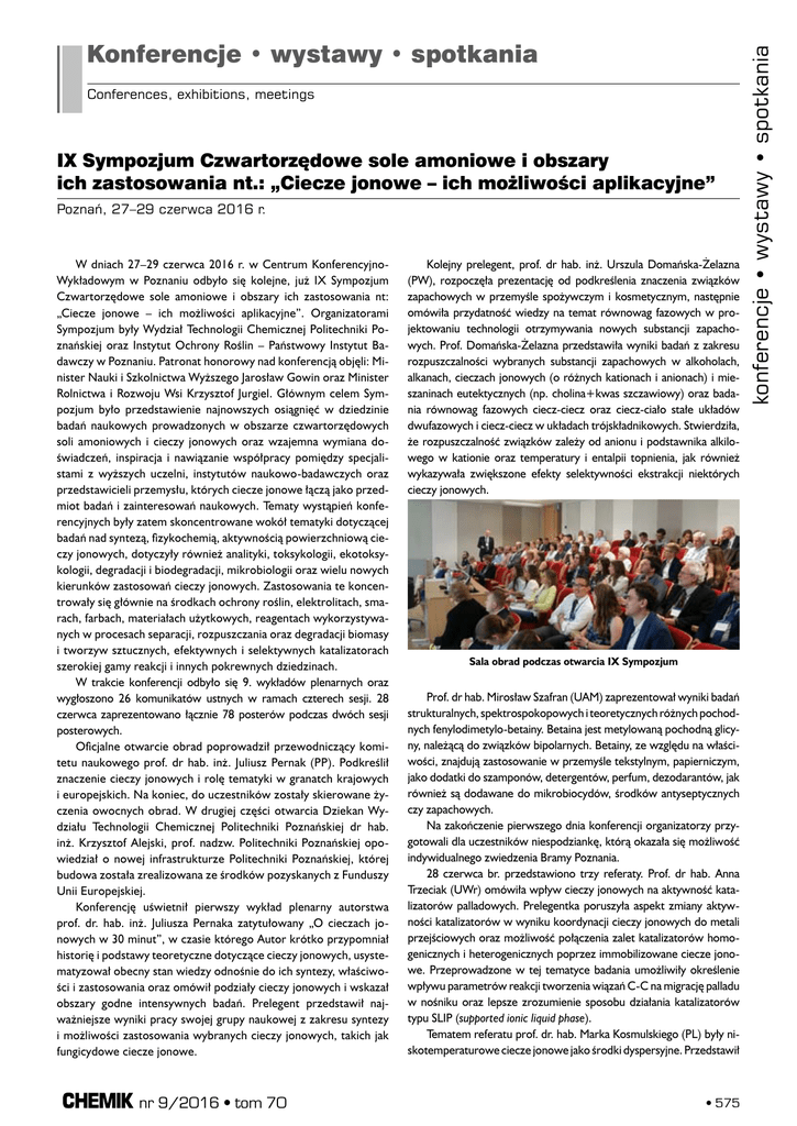 Conferences, exhibitions, meetings IX Sympozjum Czwartorzędowe sole amoniowe i obszary ich zastosowania nt.: „Ciecze jonowe – ich możliwości aplikacyjne” Poznań, 27–29 czerwca 2016 r. W dniach 27–29 czerwca 2016 r. w Centrum KonferencyjnoWykładowym w Poznaniu odbyło się kolejne, już IX Sympozjum Czwartorzędowe sole amoniowe i obszary ich zastosowania nt: „Ciecze jonowe – ich możliwości aplikacyjne”. Organizatorami Sympozjum były Wydział Technologii Chemicznej Politechniki Poznańskiej oraz Instytut Ochrony Roślin – Państwowy Instytut Badawczy w Poznaniu. Patronat honorowy nad konferencją objęli: Minister Nauki i Szkolnictwa Wyższego Jarosław Gowin oraz Minister Rolnictwa i Rozwoju Wsi Krzysztof Jurgiel. Głównym celem Sympozjum było przedstawienie najnowszych osiągnięć w dziedzinie badań naukowych prowadzonych w obszarze czwartorzędowych soli amoniowych i cieczy jonowych oraz wzajemna wymiana doświadczeń, inspiracja i nawiązanie współpracy pomiędzy specjalistami z wyższych uczelni, instytutów naukowo-badawczych oraz przedstawicieli przemysłu, których ciecze jonowe łączą jako przedmiot badań i zainteresowań naukowych. Tematy wystąpień konferencyjnych były zatem skoncentrowane wokół tematyki dotyczącej badań nad syntezą, fizykochemią, aktywnością powierzchniową cieczy jonowych, dotyczyły również analityki, toksykologii, ekotoksykologii, degradacji i biodegradacji, mikrobiologii oraz wielu nowych kierunków zastosowań cieczy jonowych. Zastosowania te koncentrowały się głównie na środkach ochrony roślin, elektrolitach, smarach, farbach, materiałach użytkowych, reagentach wykorzystywanych w procesach separacji, rozpuszczania oraz degradacji biomasy i tworzyw sztucznych, efektywnych i selektywnych katalizatorach szerokiej gamy reakcji i innych pokrewnych dziedzinach. W trakcie konferencji odbyło się 9. wykładów plenarnych oraz wygłoszono 26 komunikatów ustnych w ramach czterech sesji. 28 czerwca zaprezentowano łącznie 78 posterów podczas dwóch sesji posterowych. Oficjalne otwarcie obrad poprowadził przewodniczący komitetu naukowego prof. dr hab. inż. Juliusz Pernak (PP). Podkreślił znaczenie cieczy jonowych i rolę tematyki w granatch krajowych i europejskich. Na koniec, do uczestników zostały skierowane życzenia owocnych obrad. W drugiej części otwarcia Dziekan Wydziału Technologii Chemicznej Politechniki Poznańskiej dr hab. inż. Krzysztof Alejski, prof. nadzw. Politechniki Poznańskiej opowiedział o nowej infrastrukturze Politechniki Poznańskiej, której budowa została zrealizowana ze środków pozyskanych z Funduszy Unii Europejskiej. Konferencję uświetnił pierwszy wykład plenarny autorstwa prof. dr. hab. inż. Juliusza Pernaka zatytułowany „O cieczach jonowych w 30 minut”, w czasie którego Autor krótko przypomniał historię i podstawy teoretyczne dotyczące cieczy jonowych, usystematyzował obecny stan wiedzy odnośnie do ich syntezy, właściwości i zastosowania oraz omówił podziały cieczy jonowych i wskazał obszary godne intensywnych badań. Prelegent przedstawił najważniejsze wyniki pracy swojej grupy naukowej z zakresu syntezy i możliwości zastosowania wybranych cieczy jonowych, takich jak fungicydowe ciecze jonowe. nr 9/2016 • tom 70 Kolejny prelegent, prof. dr hab. inż. Urszula Domańska-Żelazna (PW), rozpoczęła prezentację od podkreślenia znaczenia związków zapachowych w przemyśle spożywczym i kosmetycznym, następnie omówiła przydatność wiedzy na temat równowag fazowych w projektowaniu technologii otrzymywania nowych substancji zapachowych. Prof. Domańska-Żelazna przedstawiła wyniki badań z zakresu rozpuszczalności wybranych substancji zapachowych w alkoholach, alkanach, cieczach jonowych (o różnych kationach i anionach) i mieszaninach eutektycznych (np. cholina+kwas szczawiowy) oraz badania równowag fazowych ciecz-ciecz oraz ciecz-ciało stałe układów dwufazowych i ciecz-ciecz w układach trójskładnikowych. Stwierdziła, że rozpuszczalność związków zależy od anionu i podstawnika alkilowego w kationie oraz temperatury i entalpii topnienia, jak również wykazywała zwiększone efekty selektywności ekstrakcji niektórych cieczy jonowych. Sala obrad podczas otwarcia IX Sympozjum Prof. dr hab. Mirosław Szafran (UAM) zaprezentował wyniki badań strukturalnych, spektrospokopowych i teoretycznych różnych pochodnych fenylodimetylo-betainy. Betaina jest metylowaną pochodną glicyny, należącą do związków bipolarnych. Betainy, ze względu na właściwości, znajdują zastosowanie w przemyśle tekstylnym, papierniczym, jako dodatki do szamponów, detergentów, perfum, dezodarantów, jak również są dodawane do mikrobiocydów, środków antyseptycznych czy zapachowych. Na zakończenie pierwszego dnia konferencji organizatorzy przygotowali dla uczestników niespodziankę, którą okazała się możliwość indywidualnego zwiedzenia Bramy Poznania. 28 czerwca br. przedstawiono trzy referaty. Prof. dr hab. Anna Trzeciak (UWr) omówiła wpływ cieczy jonowych na aktywność katalizatorów palladowych. Prelegentka poruszyła aspekt zmiany aktywności katalizatorów w wyniku koordynacji cieczy jonowych do metali przejściowych oraz możliwość połączenia zalet katalizatorów homogenicznych i heterogenicznych poprzez immobilizowane ciecze jonowe. Przeprowadzone w tej tematyce badania umożliwiły określenie wpływu parametrów reakcji tworzenia wiązań C-C na migrację palladu w nośniku oraz lepsze zrozumienie sposobu działania katalizatorów typu SLIP (supported ionic liquid phase). Tematem referatu prof. dr. hab. Marka Kosmulskiego (PL) były niskotemperaturowe ciecze jonowe jako środki dyspersyjne. Przedstawił • 575 konferencje • wystawy • spotkania Konferencje • wystawy • spotkania konferencje • wystawy • spotkania wyniki prób pomiaru ruchliwości elektroforetycznej oraz dynamicznej w dyspersjach 