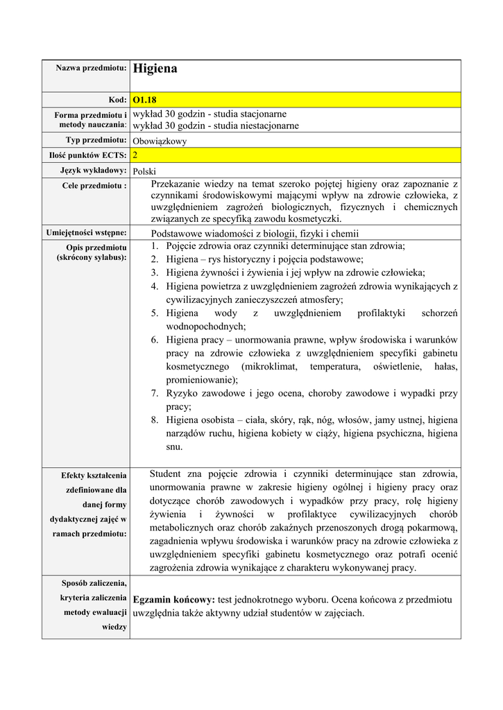 Nazwa przedmiotu: Higiena Kod: O1.18 Forma przedmiotu i metody nauczania: wykład 30 godzin - studia stacjonarne wykład 30 godzin - studia niestacjonarne Typ przedmiotu: Obowiązkowy Ilość punktów ECTS: 2 Język wykładowy: Polski Cele przedmiotu : Umiejętności wstępne: Opis przedmiotu (skrócony sylabus): Efekty kształcenia zdefiniowane dla danej formy dydaktycznej zajęć w ramach przedmiotu: Przekazanie wiedzy na temat szeroko pojętej higieny oraz zapoznanie z czynnikami środowiskowymi mającymi wpływ na zdrowie człowieka, z uwzględnieniem zagrożeń biologicznych, fizycznych i chemicznych związanych ze specyfiką zawodu kosmetyczki. Podstawowe wiadomości z biologii, fizyki i chemii 1. Pojęcie zdrowia oraz czynniki determinujące stan zdrowia; 2. Higiena – rys historyczny i pojęcia podstawowe; 3. Higiena żywności i żywienia i jej wpływ na zdrowie człowieka; 4. Higiena powietrza z uwzględnieniem zagrożeń zdrowia wynikających z cywilizacyjnych zanieczyszczeń atmosfery; 5. Higiena wody z uwzględnieniem profilaktyki schorzeń wodnopochodnych; 6. Higiena pracy – unormowania prawne, wpływ środowiska i warunków pracy na zdrowie człowieka z uwzględnieniem specyfiki gabinetu kosmetycznego (mikroklimat, temperatura, oświetlenie, hałas, promieniowanie); 7. Ryzyko zawodowe i jego ocena, choroby zawodowe i wypadki przy pracy; 8. Higiena osobista – ciała, skóry, rąk, nóg, włosów, jamy ustnej, higiena narządów ruchu, higiena kobiety w ciąży, higiena psychiczna, higiena snu. Student zna pojęcie zdrowia i czynniki determinujące stan zdrowia, unormowania prawne w zakresie higieny ogólnej i higieny pracy oraz dotyczące chorób zawodowych i wypadków przy pracy, rolę higieny żywienia i żywności w profilaktyce cywilizacyjnych chorób metabolicznych oraz chorób zakaźnych przenoszonych drogą pokarmową, zagadnienia wpływu środowiska i warunków pracy na zdrowie człowieka z uwzględnieniem specyfiki gabinetu kosmetycznego oraz potrafi ocenić zagrożenia zdrowia wynikające z charakteru wykonywanej pracy. Sposób zaliczenia, Egzamin końcowy: test jednokrotnego wyboru. Ocena końcowa z przedmiotu metody ewaluacji uwzględnia także aktywny udział studentów w zajęciach. kryteria zaliczenia wiedzy Literatura: 1. Karczewski K.: Higiena – podręcznik dla studentów pielęgniarstwa, Wyd. Czelej, Lublin 2002; 2. Murawska – Ciałowicz E., Zawadzki M.: Higiena, podręcznik dla studentów wydziału kosmetologii, Górnicki – Wydawnictwo Medyczne, Wrocław 2005 3. Marcinkowski J.: Higiena, profilaktyka i organizacja w zawodach medycznych. PZWL, Warszawa 2003; 4. Gawęcki J.: Żywienie człowieka – podstawy nauki o żywieniu - tom 1, PWN, Warszawa 2010 Koordynator przedmiotu: Dr hab. n. farm. Jerzy Bertrandt Prowadzący zajęcia: Dr hab. n. farm. Jerzy Bertrandt Data aktualizacji: 15.09.2011