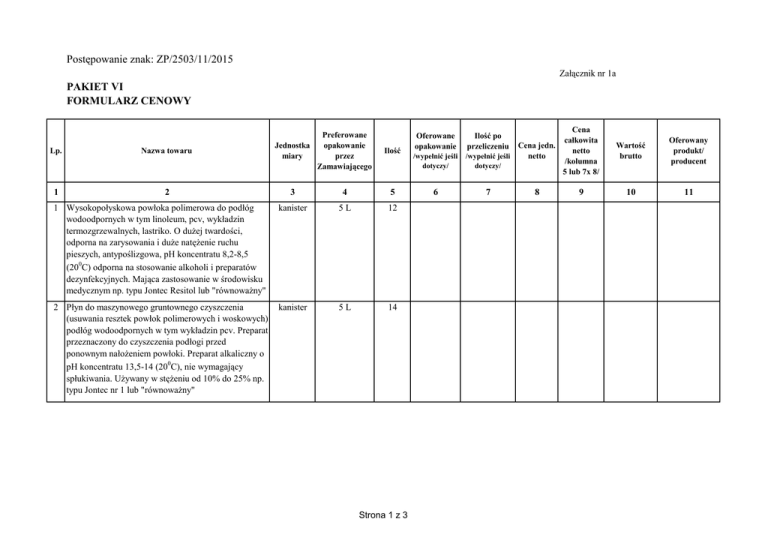 Postępowanie znak: ZP/2503/11/2015 Załącznik nr 1a PAKIET VI FORMULARZ CENOWY Lp. Nazwa towaru 1 2 Preferowane Jednostka opakowanie miary przez Zamawiającego Ilość 3 4 5 1 Wysokopołyskowa powłoka polimerowa do podłóg wodoodpornych w tym linoleum, pcv, wykładzin termozgrzewalnych, lastriko. O dużej twardości, odporna na zarysowania i duże natężenie ruchu pieszych, antypoślizgowa, pH koncentratu 8,2-8,5 (200C) odporna na stosowanie alkoholi i preparatów dezynfekcyjnych. Mająca zastosowanie w środowisku medycznym np. typu Jontec Resitol lub "równoważny" kanister 5L 12 2 Płyn do maszynowego gruntownego czyszczenia (usuwania resztek powłok polimerowych i woskowych) podłóg wodoodpornych w tym wykładzin pcv. Preparat przeznaczony do czyszczenia podłogi przed ponownym nałożeniem powłoki. Preparat alkaliczny o pH koncentratu 13,5-14 (200C), nie wymagający spłukiwania. Używany w stężeniu od 10% do 25% np. typu Jontec nr 1 lub "równoważny" kanister 5L 14 Strona 1 z 3 Cena całkowita Cena jedn. netto netto /wypełnić jeśli /wypełnić jeśli /kolumna dotyczy/ dotyczy/ 5 lub 7x 8/ Oferowane opakowanie Ilość po przeliczeniu 6 7 8 9 Wartość brutto Oferowany produkt/ producent 10 11 3 Wodorozcienczalny, niskopieniący preparat do gruntowego czyszczenia oraz zmywania starych powłok ochronnych i wodoodpornych podłóg (np.PCV, linoleum, kamień sztuczny i naturalny). Nadający się do mycia ręcznego i w automatach. Produkt na bazie atanoloaminy i wodorotlenki potasu. Działający w stężeniu 5 - 20%, pH 13,5 - 14, gęstość 1,00 - 1,03 g/cm3 (200C), np typu:Stripper Ultra lub "równoważny" kanister 5L 30 4 Uniwersalny środek nabłyszcający na bazie polimeru styrenowo akrylowego do trwałej konserwacji podłóg z PCV i linoleum oraz kamienia naturalnego i sztucznego. Preparat powinien tworzyć szybkoschnącą, gładką powłokę o wysokim połysku, bez konieczności polerowania. Produkt powinien być odporny na działanie średnioalkalicznych preparatów dezynfekcyjnych, powinien także spałniać wymagania dotyczące odporności na poślizg zaawarte w normie PN-EN 14041. Wartość pH 8 -9, gęstość 1,02 1,04g/cm3, np.typu:Akrylan lub "równoważny" kanister 5L 25 5 Preparat do maszynowego mycia naczyń w zmywarkach przemysłowych. Zalecany do mycia szkła, porcelany, tworzyw sztucnych. Wartość pH 13-14. W postaci cieczy bezbarwnej, bez zapachu kanister 12 kg 36 6 Środek nabłyszczający do płukania naczyń w zmywarkach przemysłowych, pH 2-3. W postaci cieczy, bez zapachu kanister 10 kg 21 7 Mydło płynne, delikatne do rąk. Opakowanie o pojemności 0,475 L - dostosowane do podajnika Mini Tork butelka 0,475 l 20 8 Pasta do podłóg drewnianych, parkietów. O dużej twardości, odporna na zarysowania i duże natężenie ruchu pieszych, antypoślizgowa kanister 5l 2 Strona 2 z 3 9 Środek wodoodporny do codziennego czyszczenia, pielęgnacji, konserwacji podłóg drewnianych i parkietów. Nadaje się do lakierowanego, woskowanego drewna i parkietu. Posiada właściwości antypoślizgowe kanister 5l 2 RAZEM ……………………… …………….. /Pieczątka i podpis Wykonawcy/ ……………………………., dnia ……………………... Strona 3 z 3