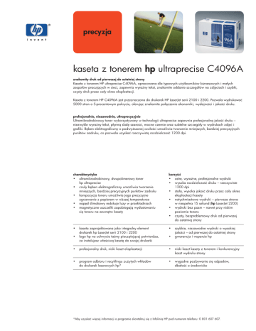 precyzja kaseta z tonerem hp ultraprecise C4096A znakomity druk od pierwszej do ostatniej strony Kaseta z tonerem HP ultraprecise C4096A, opracowana dla typowych uytkowników biznesowych i małych zespołów pracujcych w sieci, zapewnia wyrany tekst, znakomite oddanie szczegółów na zdjciach i szybki, czysty druk przez cały okres eksploatacji. Kaseta z tonerem HP C4096A jest przeznaczona do drukarek HP LaserJet serii 2100 i 2200. Pozwala wydrukować 5000 stron o 5-procentowym pokryciu, oferujc znakomite połczenie ekonomiki, wydajnoci i jakoci druku. profesjonalnie, niezawodnie, ultraprecyzyjnie Ultramikrodrobinowy toner wykorzystywany w technologii ultraprecise zapewnia profesjonaln jakoć druku – niezwykle wyrany tekst, płynn skal szaroci, mocne czernie oraz subtelne szczegóły w wydrukach zdjć i grafiki. Bben elektrograficzny o podwyszonej czułoci umoliwia tworzenie mniejszych, bardziej precyzyjnych punktów zadruku, co pozwala uzyskać rzeczywist rozdzielczoć 1200 dpi. charakterystyka • ultramikrodrobinowy, dwupolimerowy toner hp ultraprecise • czuły bben elektrograficzny umoliwia tworzenie mniejszych, bardziej precyzyjnych punktów zadruku • kompozycja toneru umoliwia jego precyzyjne zgrzewanie z papierem w niszej temperaturze • napd limakowy redukuje luzy w przekładniach • magnetyczne uszczelki zapobiegaj wydostawaniu si toneru na zewntrz kasety korzyci • ostre, wyrane, profesjonalne wydruki • wysoka rozdzielczoć druku – rzeczywiste 1200 dpi • stała, wysoka jakoć druku przez cały okres eksploatacji kasety • natychmiastowe wydruki – pierwsza strona w niespełna 15 sekund (hp LaserJet 2200) • wydruki bez pasm – nawet przy niskim poziomie toneru • czysty, bezproblemowy druk od pierwszej do ostatniej strony • • • kaseta zaprojektowana jako integralny element drukarek hp LaserJet serii 2100 i 2200 logo hp na uchwycie tamy piecztujcej potwierdza, e instalujesz właciw kaset do swojej drukarki • szybkie, niezawodne wydruki o wysokiej jakoci – od pierwszej do ostatniej strony gwarancja i wsparcie hp • profesjonalny druk, niski koszt eksploatacji • niski koszt kasety z tonerem i konkurencyjny koszt wydruku strony • program odbioru i recyklingu zuytych wkładów do drukarek laserowych hp* • wygodne pozbywanie si odpadów, dbałoć o rodowisko *Aby uzyskać wicej informacji o programie skontaktuj si z Infolini HP pod numerem telefonu: 0 801 607 607. kaseta z tonerem hp ultraprecise C4096A czsto zadawane pytania co wyrónia t kaset wród innych? Kaseta z tonerem HP ultraprecise C4096A zapewnia optymaln prac drukarek HP LaserJet serii 2100 i 2200. Jest wyposaona w napd limakowy, który redukuje powstawanie pasm i podnosi jakoć wydruków graficznych. Kaseta ta ma wydajnoć 5.000 stron o 5% pokryciu (10.250 stron przy uyciu strony testowej „Dr. Grauert” – norma ISO 10561/ECMA-132). Podobnie jak inne kasety HP ultraprecise, wykorzystuje specjalny toner mikrodrobinowy i jest zabezpieczona tam piecztujc z logo HP na uchwycie. Ma równie uszczelki magnetyczne, które zapobiegaj wydostawaniu si toneru na zewntrz kasety. dlaczego niektóre elementy róni si od stosowanych w innych kasetach z tonerem? Kaseta z tonerem HP ultraprecise C4096A jest przeznaczona do niskonakładowego druku o wysokiej jakoci i została skonstruowana z myl o zapewnieniu optymalnej jakoci druku za przystpn cen. Specjalna formuła toneru, magnetyczne uszczelki i napd limakowy zapewniaj ostre, wyrane wydruki tekstowe i graficzne przez cały okres eksploatacji kasety. na czym polega szybkie zgrzewanie? Specjalna kompozycja dwupolimerowego toneru umoliwia jego zgrzewanie ze standardowymi nonikami w niszej temperaturze. Nie trzeba wic czekać na rozgrzanie si drukarki przed rozpoczciem wydruku – pierwsz stron otrzymujemy ju po 15 sekundach (HP LaserJet 2200). co wyrónia bben wiatłoczuły zastosowany w tej drukarce? Bben ten ma wysz czułoć w porównaniu do bbnów wiatłoczułych uywanych w kasetach poprzednich generacji. Drukowany obraz jest elektrostatycznie „wypalany” na bbnie wiatłoczułym przez laser znajdujcy si w drukarce; toner jest przenoszony na naładowany bben, a nastpnie na kartk papieru. Bardziej czuły bben wiatłoczuły umoliwia tworzenie mniejszych, bardziej precyzyjnych punktów zadruku, co pozwala uzyskać rzeczywist rozdzielczoć 1200 dpi. specyfikacja produktu wymiary nr kat. opis kod UPC (dł. x szer. x głb.) masa C4096A kaseta z tonerem hp LaserJet ultraprecise 0 88698 59297 7 357 x 180 x 248 mm 1,6 kg o standardowej pojemnoci ©2001 Hewlett-Packard Wydrukowano w Holandii 05/01 5981-0999PLE