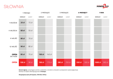 SIŁOWNIA 1 miesiąc normalny ulgowy 1 wejście 20 zł 15 zł 4 wejścia 60 zł 55 zł 8 wejść 80 zł 70 zł 12 wejść 90 zł 80 zł OPEN do 15:00 85 zł OPEN 100 zł 2 miesiące normalny ulgowy 75 zł 160 zł 145 zł 90 zł 190 zł 170 zł 6 miesięcy 3 miesiące normalny ulgowy normalny ulgowy normalny ulgowy 280 zł 250 zł 550 zł 500 zł 1000 zł 900 zł Karnet ulgowy- przysługuje uczniom, studentom, rencistom, emerytom za okazaniem ważnej legitymacji. Karnety na wejścia obowiązują przez 2 miesiące. Akceptujemy karty OK System, FitProfit, FitFlex 1 rok SIŁOWNIA & FITNESS / SZTUKI WALKI 1 miesiąc normalny ulgowy 1 wejście 20 zł 15 zł 4 wejścia 60 zł 55 zł 8 wejść 80 zł 70 zł 12 wejść 90 zł 80 zł 85 zł 85 zł 130 zł 100 zł OPEN do 15:00 OPEN 2 miesiące normalny ulgowy 75 zł 75 zł 160 zł 160 zł 145 zł 145 zł 115 zł 90 zł 220 zł 190 zł 200 zł 170 zł 6 miesięcy 3 miesiące 1 rok normalny ulgowy normalny ulgowy normalny ulgowy 310 zł 280 zł 280 zł 250 zł 580 zł 550 zł 520 zł 500 zł 1030 zł 1000 zł 930 zł 900 zł Karnet ulgowy- przysługuje uczniom, studentom, rencistom, emerytom za okazaniem ważnej legitymacji. Karnety na wejścia obowiązują przez 2 miesiące. Promocyjne ceny karnetów OPEN obowiązują do końca grudnia br. Cennik obejmuje zajęcia z K1 KICKBOXING, zajęcia z Krav Maga płatne niezależnie. SAUNA 15 zł 5 zł KRAV MAGA pierwsza godzina 20 zł 1 wejście dodatkowe 10 minut 80 zł 8 wejść