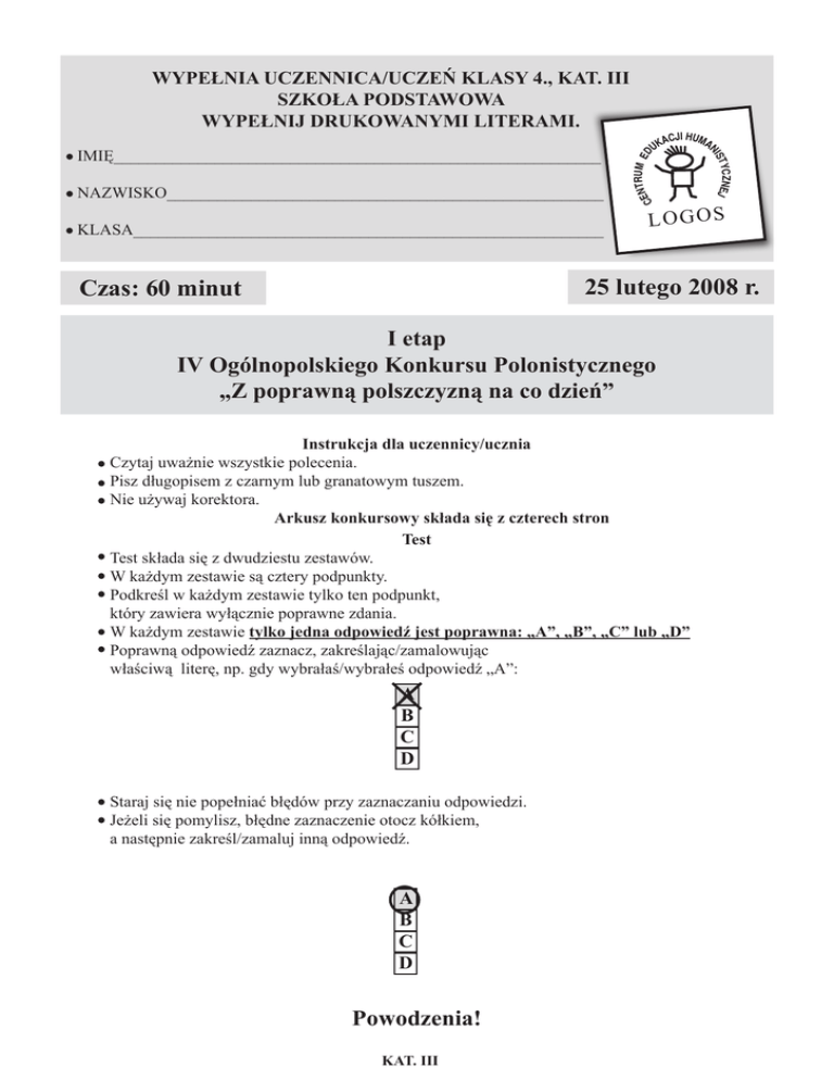 NAZWISKO____________________________________________________ KLASA________________________________________________________ LOGOS 25 lutego 2008 r. Czas: 60 minut I etap IV Ogólnopolskiego Konkursu Polonistycznego „Z poprawną polszczyzną na co dzień” Instrukcja dla uczennicy/ucznia Czytaj uważnie wszystkie polecenia. Pisz długopisem z czarnym lub granatowym tuszem. Nie używaj korektora. Arkusz konkursowy składa się z czterech stron Test Test składa się z dwudziestu zestawów. W każdym zestawie są cztery podpunkty. Podkreśl w każdym zestawie tylko ten podpunkt, który zawiera wyłącznie poprawne zdania. W każdym zestawie tylko jedna odpowiedź jest poprawna: „A”, „B”, „C” lub „D” Poprawną odpowiedź zaznacz, zakreślając/zamalowując właściwą literę, np. gdy wybrałaś/wybrałeś odpowiedź „A”: A B C D CZNEJ STY NI IMIĘ__________________________________________________________ ACJI HUMA UK NTRUM ED CE WYPEŁNIA UCZENNICA/UCZEŃ KLASY 4., KAT. III SZKOŁA PODSTAWOWA WYPEŁNIJ DRUKOWANYMI LITERAMI. Staraj się nie popełniać błędów przy zaznaczaniu odpowiedzi. Jeżeli się pomylisz, błędne zaznaczenie otocz kółkiem, a następnie zakreśl/zamaluj inną odpowiedź. A B C D Powodzenia! KAT. III ZESTAW 1. A Byłem zły, więc nie przebierałem w zdaniach. B Byłem zły, więc nie przebierałem w słowach. C Też maczałeś w tej aferze ręce. D Wiedział, że nikt go nie widział, więc szedł w zapartego. ZESTAW 2. A Nie lubię kiślu! B Używał farby plakatowe. C Jesteśmy wdzięczni dla rodziców za pomoc. D Nie lubię kisielu! ZESTAW 3. A Nie chcę kakaa! B Nie chcę kakao! C Bądźmy przyjacielami. D Na drodze leżała gałęź. ZESTAW 4. A Nie lubię Janka Lange. B Byłem dwa razy w Zakopanym. C Kupił szampon dla włosów suchych. D Nie można w życiu iść po linii najmniejszego oporu. ZESTAW 5. A Oboje rodzice przyszli na zebranie. B Mam w domu sześć drzwi. C Przyglądał się temu drewnianemu stołu. D Chodzę do szkoły imieniem Mickiewicza. ZESTAW 6. A Proszę panią, która godzina? B Czy mogę wziąć tę książkę? C Mama odgrywa ważną funkcję w ministerstwie. D Kogo jest ten zepsuty długopis? ZESTAW 7. A Nie przyszedłem dlatego, ponieważ była brzydka pogoda. B Nie przyszedłem dlatego, gdyż była brzydka pogoda. C Nie przyszedłem, dlatego bo była brzydka pogoda. D Nie przyszedłem, dlatego że była brzydka pogoda. KAT. III ZESTAW 8. A Ciocia ma siedem dzieci. B Sąsiadka ma troje dzieci. C Stała przy dwóch drzwiach. D Oparła się o dwa drzwi. ZESTAW 9. A Wczoraj rozmawiałem z Rosjanem. B Nie mogłem się porozumieć z Amerykanem. C Nie spotkam się dzisiaj z Rosjaninami. D Porozmawiajmy z tym miłym Rosjaninem. ZESTAW 10. A Za każdą cenę muszę wygrać ten konkurs. B Moja noga więcej w tej szkole nie powstanie! C Za wszelką cenę muszę wygrać ten konkurs. D Moja noga więcej w tej szkole nie postoi. ZESTAW 11. A Wybrali Janka za gospodarza klasy. B Używał farb plakatowych. C Powiedz dla Kasi, że jej nie zaproszę na urodziny. D Podziękujcie dla rodziców za pomoc w akcji charytatywnej. ZESTAW 12. A Poczekajcie na mnie na ogrodzie. B Poczekajcie na mnie w ogrodzie. C Dozorca jest w tej chwili na magazynie. D Zebranie będzie na stołówce. ZESTAW 13. A Wychowawczyni pożaliła się na mnie do taty. B W życiu napotykamy na przeszkody. C Powiedz dla mamy, żeby jutro przyszła. D W życiu napotykamy przeszkody. ZESTAW 14. A Póki co możecie się bawić w berka. B Na razie możecie się bawić w berka. C Od trzech dni siedzisz murem przed telewizorem D Zbyt szybko osiadasz na laurach. KAT. III ZESTAW 15. A Akurat wtedy nie miałem dobrego nastroju. B Jak raz wtedy nie miałem dobrego nastroju. C Łaska pańska na wesołym rumaku jedzie. D Łaska pańska na pstrokatym koniu jedzie. ZESTAW 16. A Mam zaufanie do swoich przyjaciół. B Mam zaufanie wobec swoich przyjaciół. C Siedziałem z dziewczyną na ławce, którą poznałem w parku. D Nie możemy tolerować głupotę. ZESTAW 17. A Dlaczego nie poszłeś na wycieczkę? B Przyszłeś, ale było już późno. C Weszłeś do pokoju w butach! D Nie wyłączaj alarmu. ZESTAW 18. A Cofnąłem się trzy kroki do tyłu. B Cofnęłem się. C Cofłem się. D Cofnąłem się trzy kroki. ZESTAW 19. A Ubierz kurtkę, ponieważ jest zimno. B Włóż kurtkę, ponieważ jest zimno. C Wracaj z powrotem! D To był fakt autentyczny. ZESTAW 20. A Długopis i linijka leżał na biurku. B Linijka i długopis leżała na biurku. C Długopis i linijka leżały na biurku. D Zosia, Ania, Basia i Zenek poszły na spacer. KAT. III